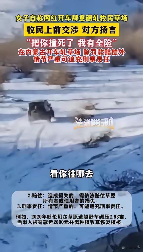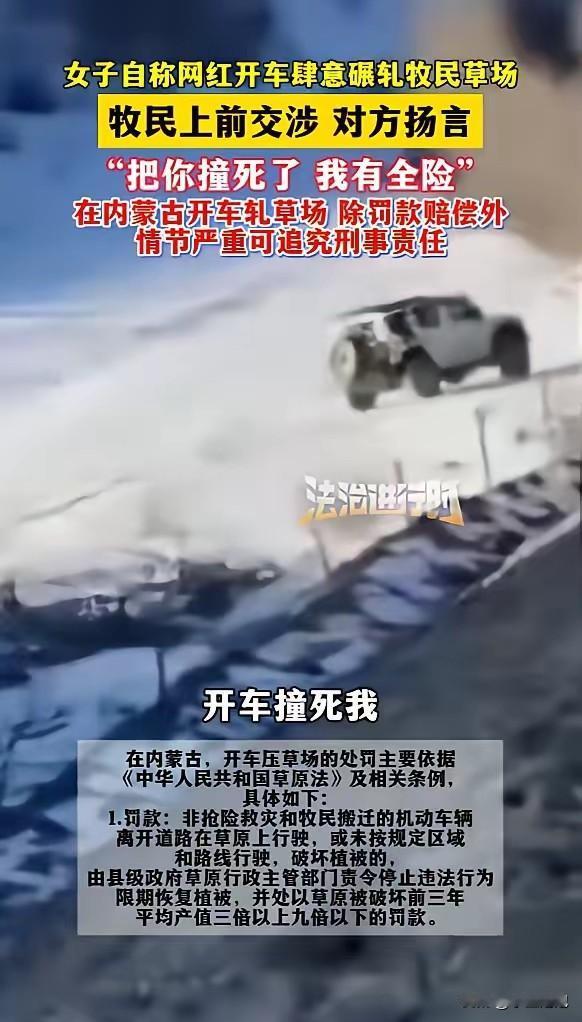 “必须严惩!”近日,内蒙古赤峰,一外地女子来玩,竟将车开进牧民草场肆意碾压,牧民发现后上前阻拦,不料该女子不仅不道歉,还自称自己是网红,并且扬言把牧民撞死了自己有全险,态度十分嚣张。网友:必须给她个教训! 据媒体1月6日报道,内蒙古的草场是牧民的生计根本,赤峰这位牧民的草场里,女子驾车碾压的车辙在雪地上格外刺眼,刚返青的草根被车轮碾碎,这些草是牧民家牛羊过冬的依靠,女子的行为直接断了牧民的活路。 牧民发现后立刻上前制止,他拽着女子的车门想让对方停下,可女子摇窗后的第一句话就是“我是网红”,仿佛这身份能让她无视草场被破坏的事实。见牧民不依不饶,女子更是放出“撞死你我有全险”的狠话,油门还故意轰了几下,吓得牧民连忙后退。 据《草原法》规定,非特殊情况车辆碾压草原,需赔偿损失还可能担刑责。2020年呼伦贝尔就有越野车碾压2.93亩草原的案例,当事人被罚近2000元还得补种牧草。此次赤峰这名女子,碾压草场面积更大,还威胁他人人身安全,情节远比当年的案例恶劣。 女子口中的“网红”身份,成了她嚣张的借口。当下部分网红为博流量,频频做出破坏环境、漠视规则的行为,把出格当个性,却忘了网红更该守规矩,法律不会因身份特殊就网开一面。 事发后当地草原监管部门已介入调查,牧民也提交了草场受损的相关证据,目前女子的车辆已被暂时扣押,后续将根据草场破坏面积核算赔偿金额,其威胁他人的言行也将由警方进一步调查。 草原生态本就脆弱,一辆越野车的碾压,可能需要三五年才能让草场恢复原貌。女子的全险能赔车辆损失,却赔不了草场的生态,更赔不了牧民被伤害的情感。 这起事件不是简单的纠纷,而是规则意识的缺失。全险是风险保障,不是违法的“护身符”,网红身份也不是特权通行证。截至发稿,涉事女子仍未向牧民道歉,网友纷纷呼吁相关部门从严处理,让漠视规则者付出应有的代价,也让更多人明白,草原的规矩碰不得,他人的权益伤不得。 信息来源:《女子自称网红,开车肆意碾轧牧民草场》法治进行时