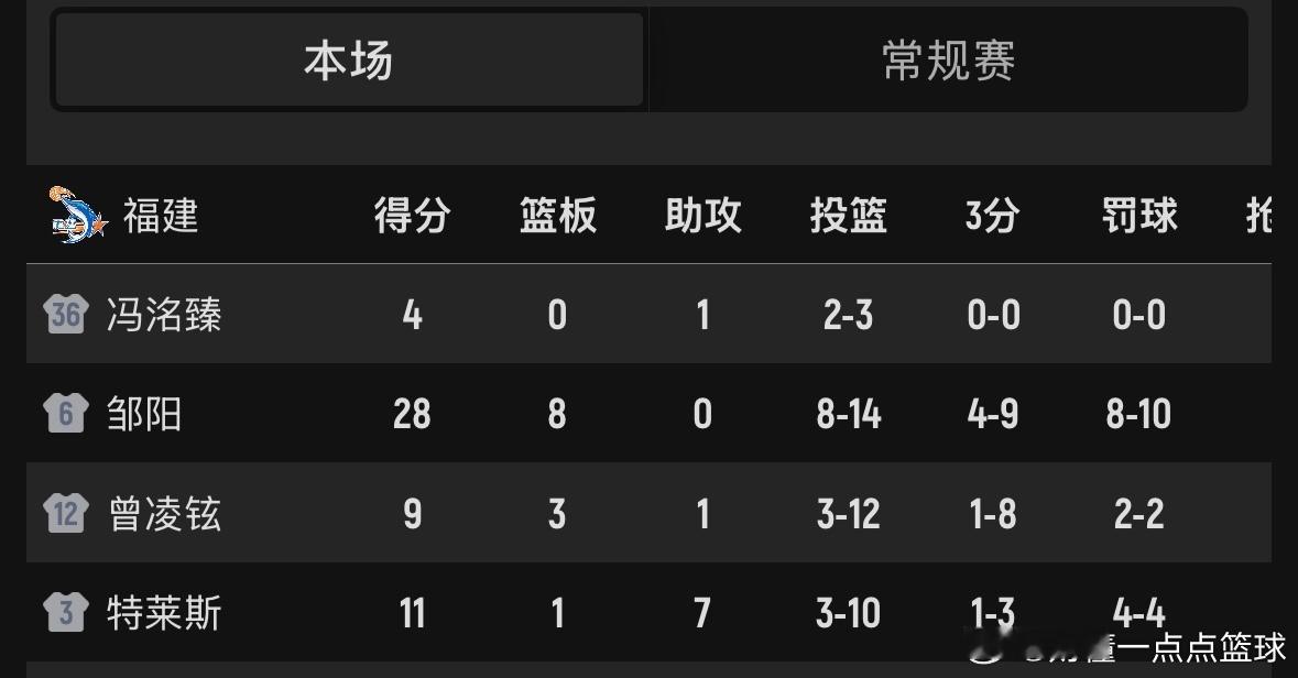 邹阳今晚发挥不错啊,三分也练出来了!出战42分钟,拿下国内球员最高得分28分,另外还有8板2抢断的贡献。其中三分球9投4中,罚球10罚8中。带领福建男篮把比赛带入了加时赛,但是福建队错失了关键篮板球,最终以99比105惜败山东男篮!