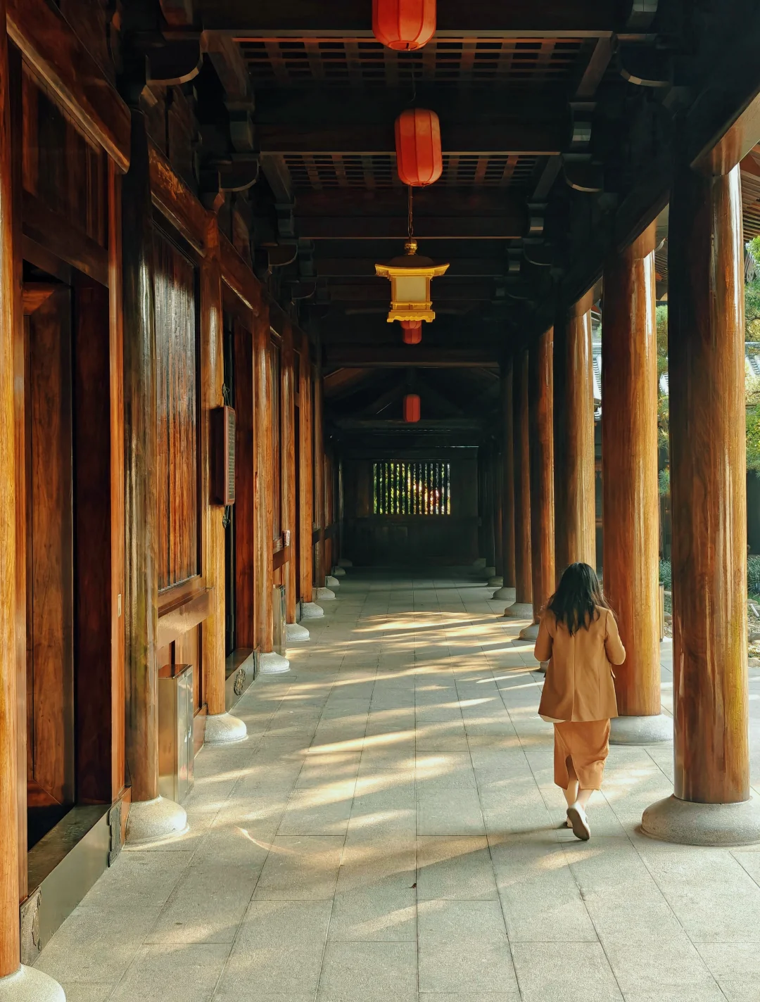殿堂布局采用传统的伽蓝七堂制纵轴式布局。山门应该是仿的南禅寺大殿。回廊的木板墙、直棂窗、架梁上的叉手,都很唐风。天王殿就有点像京都平等院的凤凰堂了,供奉的不是大肚弥勒是天冠弥勒,四大天王的造型也满特别的,和常见的不大一样。大雄殿还原的是佛光寺,原汁原味没得说(再次os一下唯一败笔金鸱尾)。藏经楼大致仿蓟县独乐寺的观音阁。观音殿供奉的是水月观音。