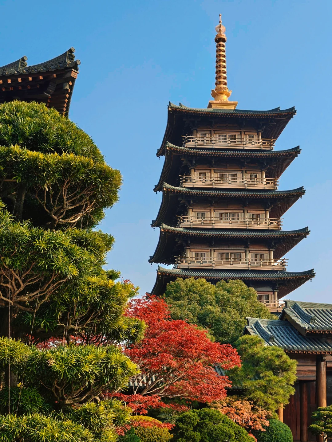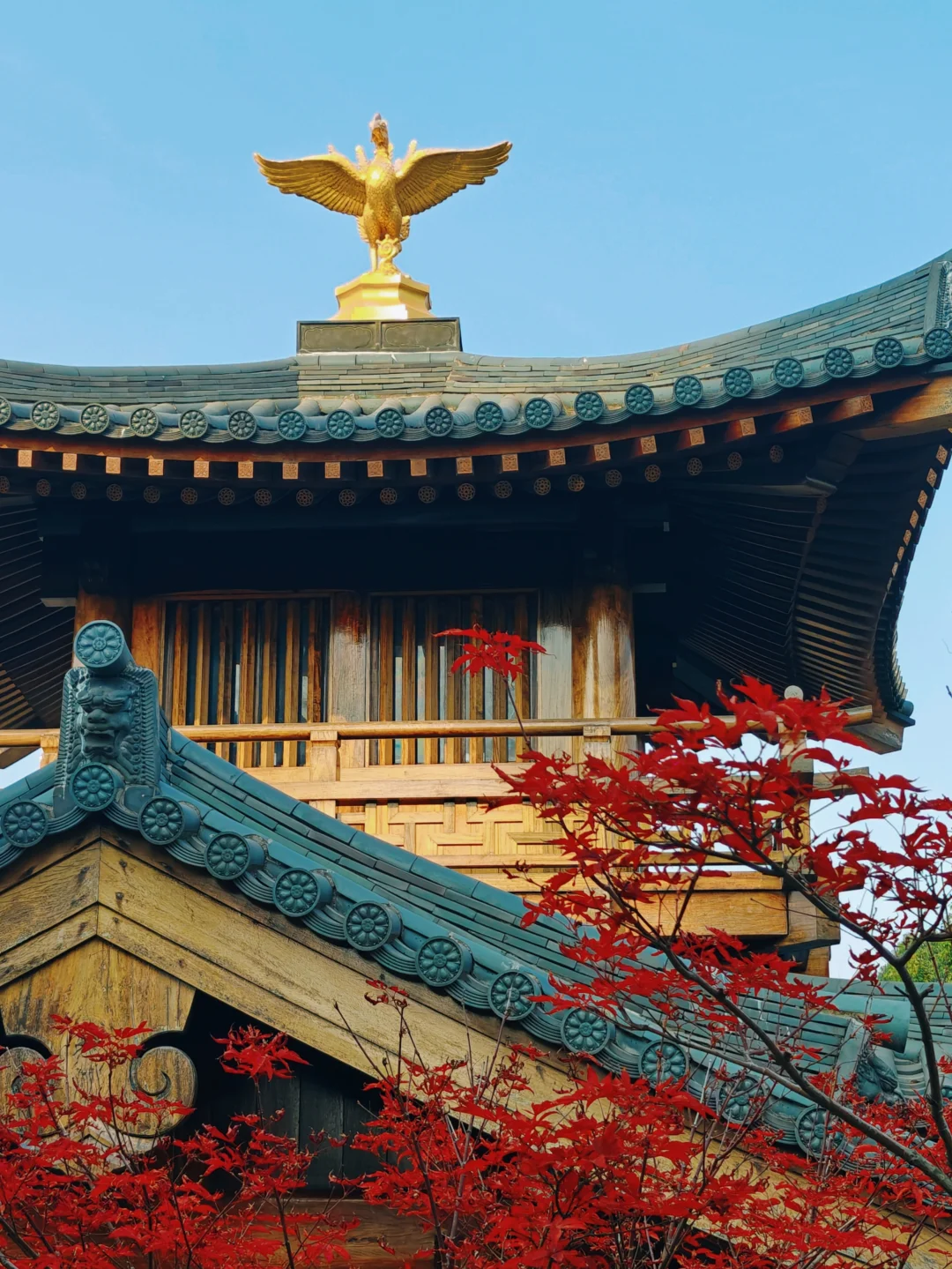 当年营销的时候用的措辞是“小京都”,咋说呢,保留了建筑主材料非洲花梨木的原木色(唐代七朱八白)以及一些细节上确实有些日风(鬼瓦算擦边吧,金塔的塔刹和勾栏的寻杖绞角造上翘就有点emmmm了),但整体是大气舒展的,规划布局也很得当,和日本寺庙以及园林是两种感觉。唯一觉得可以直接去掉的是鸱尾上涂的金。