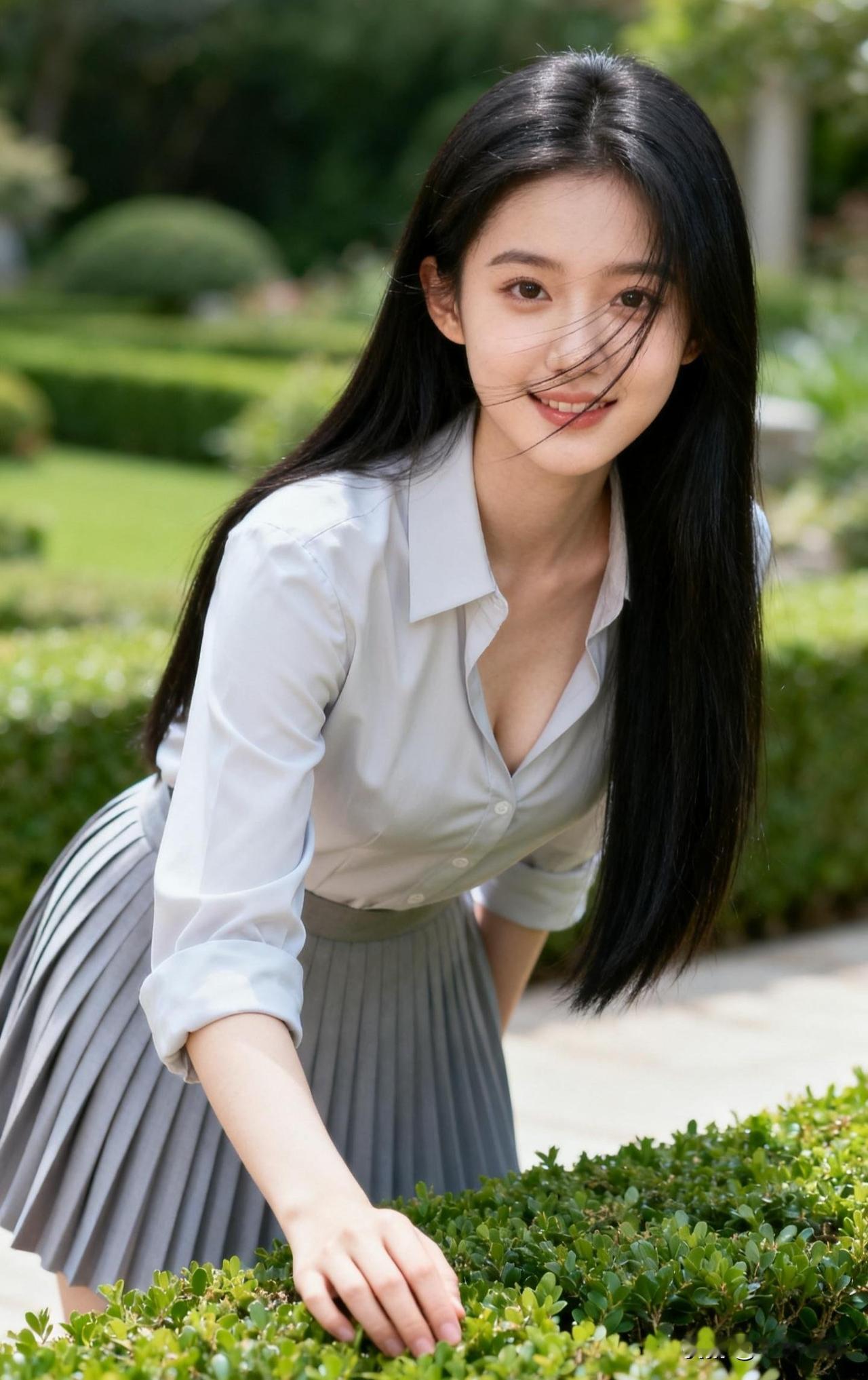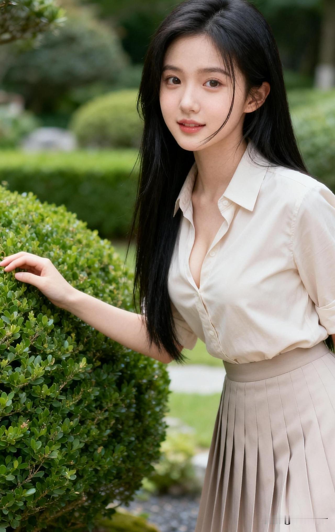 在古风庭院中,黑发少女轻抚绿植,静谧而优雅。