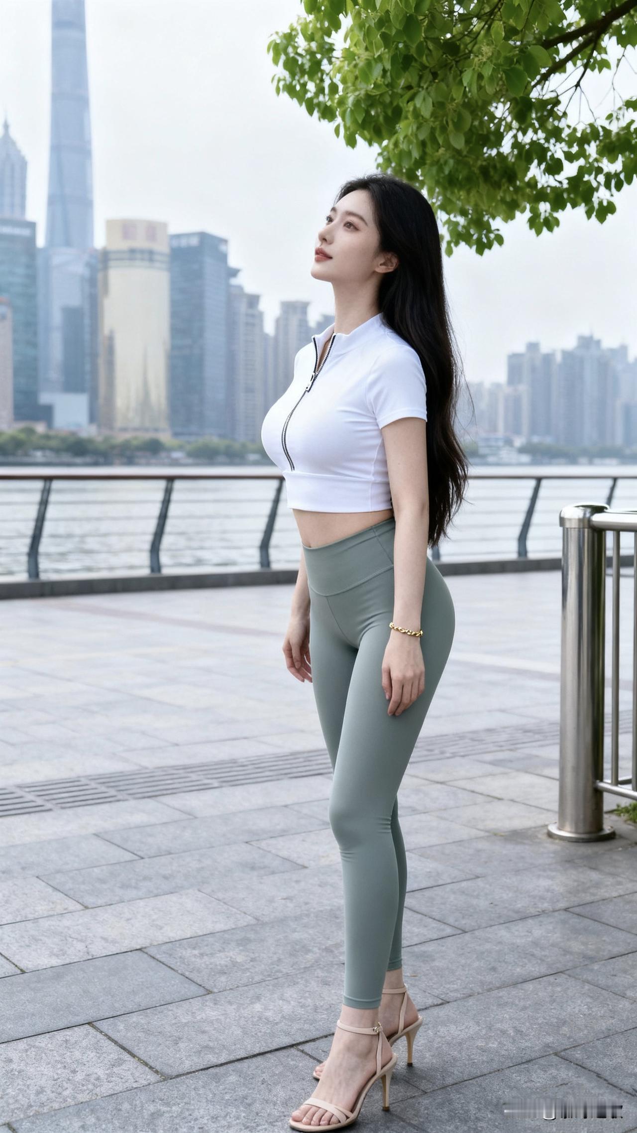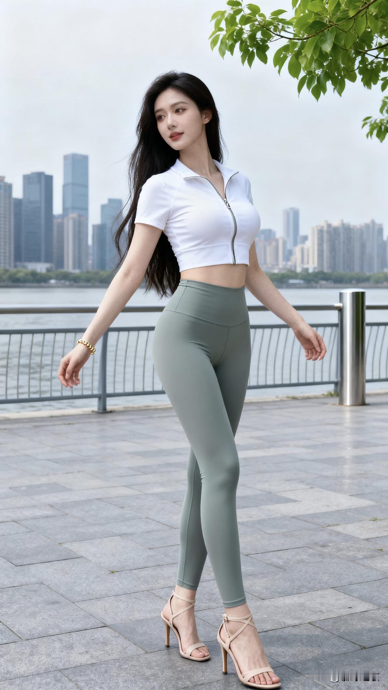 江畔的时尚精灵,勾勒出都市里的灵动曲线 在城市江畔的滨江步道上,这位女子如同闯入都市丛林的灵动精灵,用独特的穿搭与身姿,演绎着属于都市的时尚韵律。 她身着白色短款拉链上衣,搭配灰绿色的紧身瑜伽裤,面料的贴合感如同自然赋予生物的完美肌理,将极致的身材比例勾勒得恰到好处,冷白皮在江风与绿意的映衬下,宛如瓷玉般温润。裸色高跟凉鞋的点缀,让她的身姿更显挺拔,如同丛林中昂首的珍禽,每一个抬手、俯身的动作,都带着自然又舒展的美感。 江畔的摩天大楼是她的背景板,粼粼的江水与嫩绿的枝叶成为天然的点缀,这组如同自然抓拍的画面,没有刻意的雕琢,却将都市女性的优雅与活力完美融合,就像都市生态中一抹独特的亮色,在钢筋水泥的丛林里,绽放出鲜活又迷人的光彩。 都市江畔穿搭 瑜伽裤时尚搭配 冷白皮美女 极致身材比例