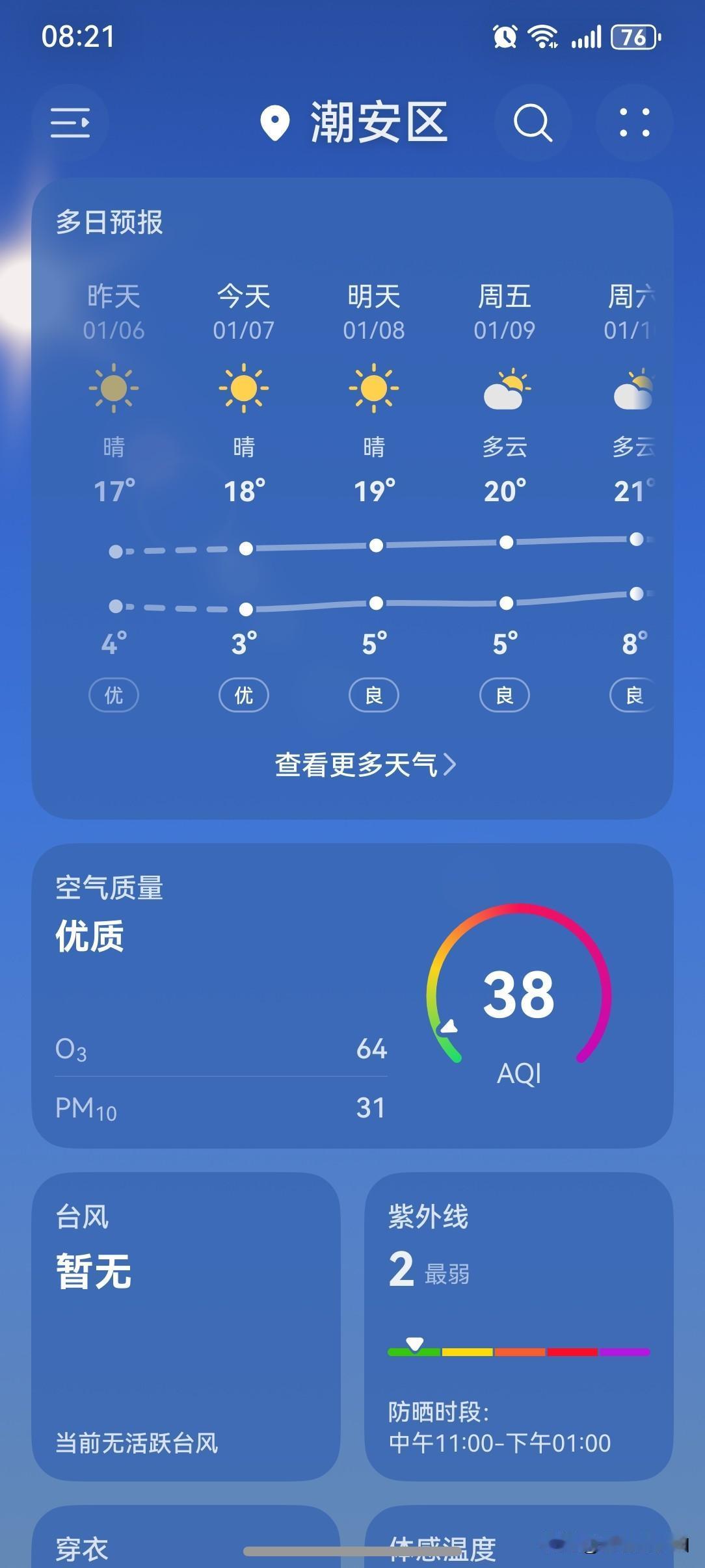 广东小寒时节真寒了! 7~8日,广东陆续有弱冷空气补充,气温略降。未来几日我省持续维持晴好干燥天气,早晚寒冷。 今天(7日),潮州喜提一个晴天,气温3~18℃,此刻气温6℃,体感温度2℃。 一起来看看今天的天空吧!阳光返场,一早上线营业送温暖!只是气温低迷,今天的最低气温只有3℃,此刻阳光普照,气温略有上升,也就只有6℃,体感温度更低,只有2℃。 幸好昨晚睡前已经先把今天要穿的衣服都准备好,里里外外,大大小小,就穿衣服这件事,就得比平时多花十分钟。 吃完一碗热气腾腾的米粉汤,再穿上厚重的外套,迎着冷风,孩子上学,大人搬砖,各就各位,出发啦! 今天这样的天气,气温低迷,实在是太冷了,但阳光又甚好,该怎么评价呢? 如此天气!元芳,你怎么看? [我想静静][捂脸][笑哭][我想静静][捂脸][笑哭][我想静静][捂脸][笑哭]