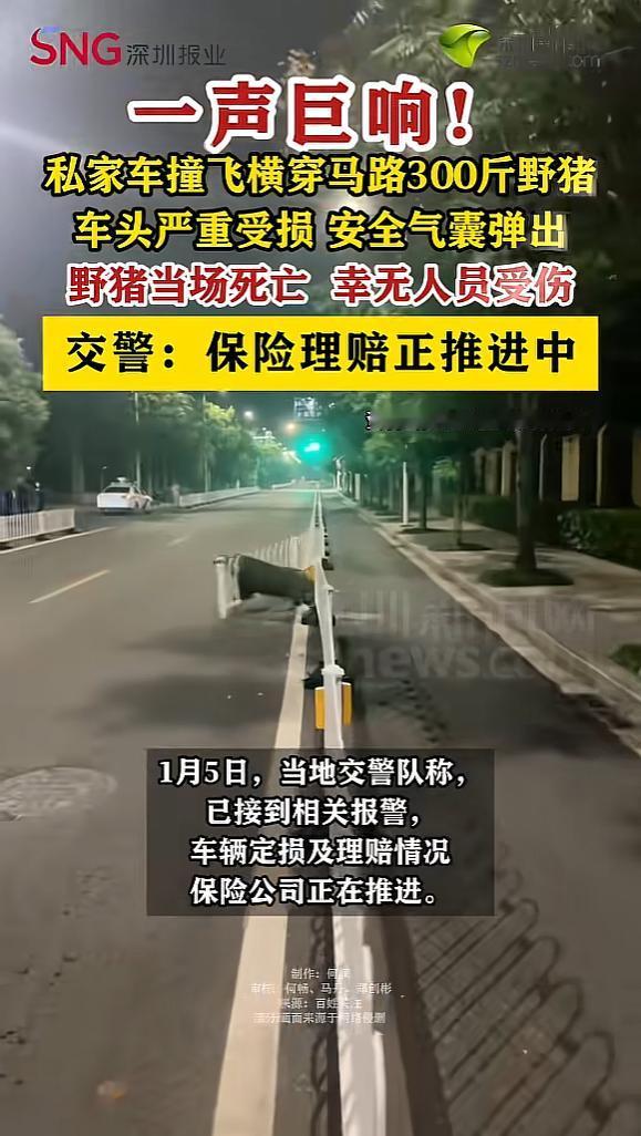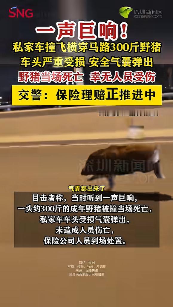 “防不胜防!”1月4日,江苏镇江,一男子开车时,遇到一头300斤重的野猪横穿马路,男子躲闪不及,直接撞了上去,紧接着就是一声巨响,野猪被撞飞数米远,当场死亡,男子的车头也严重受损,安全气囊都弹了出来! 麻烦各位读者点一下右上角的“关注”,留下您的精彩评论与大家一同探讨,感谢您的强烈支持! 你有没有想过,有一天在开车回家的路上,突然会遇上一头野猪?这样的情景,或许只在电影或者动物世界里见过,但就在江苏镇江,这样的意外真实地发生了。 事情发生在一个下午,王先生驾车行驶在城郊的道路上。那条路两侧是大片的林地和农田,路面平整开阔,一直以来都算是他回家最喜欢走的路线。 那天的车流并不算多,王先生打开车窗,感受着初冬的空气,心情也格外轻松。可就在他准备拐过一个缓弯时,眼前突然闪现出一个黑影。那团黑影竟是一头体重足有300斤的成年野猪,毫无预兆地从林地窜了出来,直直地冲向马路中央。 王先生立马踩刹车,可是还是因为距离太近了,直接撞到了野猪身上。巨大的撞击声在空旷的道路上回响,王先生的车辆前部顿时凹陷,发动机盖被撞得变形,安全气囊也在瞬间弹出。 那头野猪被巨力撞飞出数米,重重摔在路边。车内的王先生一时愣住了,反应过来后立刻下车查看。 只见野猪已经失去了呼吸,倒在地上一动不动。王先生的手还在微微发抖,虽然自己没有受伤,但看到车子的损坏和野猪的结局,心里五味杂陈。 他赶紧拨打了报警电话。很快,警察和保险公司的工作人员相继赶到现场。警方对现场进行了勘查,确认王先生并无交通违法行为,同时也联系了野生动物保护部门,将野猪的遗体交由专业人员处理。保险公司则对车辆损伤进行了详细评估,为后续理赔做准备。 随着生态环境持续改善,郊区和城市边缘地带的野生动物数量显著增加,野猪、獾、狐狸甚至鹿等动物,偶尔就会出现在人类的活动区域。 它们的出现本是生态恢复的好消息,但当这些庞然大物突然闯上马路时,带来的不仅是对司机和乘客的安全威胁,更是对城市与自然共处方式的拷问。 事实上,野猪是极具攻击性的野生动物,体型庞大、力气惊人。它们夜间活动频繁,觅食时喜欢穿梭于农田、林地与道路之间。 一旦受到惊吓,极易失控奔跑,给过路车辆带来极大隐患。近年来,国内多地都曾发生过野猪闯入道路,引发交通事故的案例。 对驾驶者来说,这种突发状况几乎难以预测和防范。即使保持高度警惕,在夜间或视线受限的情况下,依然容易措手不及。 这起事件也让人们反思,随着野生动物与人类活动边界的日益模糊,如何更好地做好风险提示和安全防护?在一些野生动物活动高发区域,是否应该增设警示标志、限速措施,或者定期巡查、清理道路两侧的杂草和灌木,以减少野生动物突然上路的可能性? 对于司机来说,行驶在郊区或山区道路上,尤其是清晨和傍晚时分,更要控制车速,注意观察两侧动静,尽量避免突发事故。 王先生这次虽然人平安无事,但车辆损失不小,也让他对今后行车多了一份警觉。经过这场意外,他表示以后在经过林区、农田附近时,都会格外注意,哪怕是白天也不敢掉以轻心。 随着人与自然的联系越来越紧密,类似的“偶遇”或许还会发生在更多人的身边。 信源:《[私家车撞飞横穿马路300斤野猪] 车头严重受损,安全气囊弹出。》——深圳新闻网