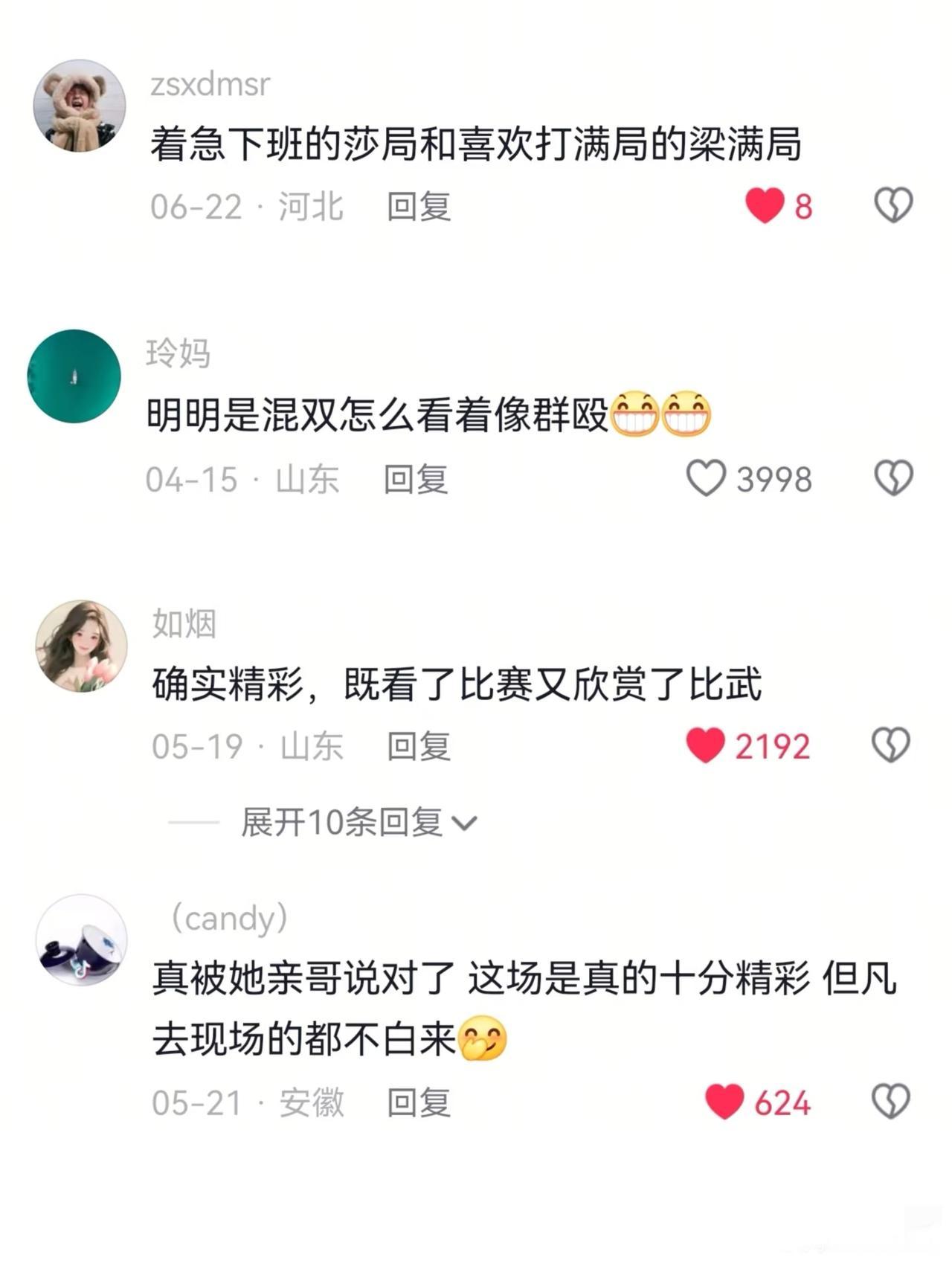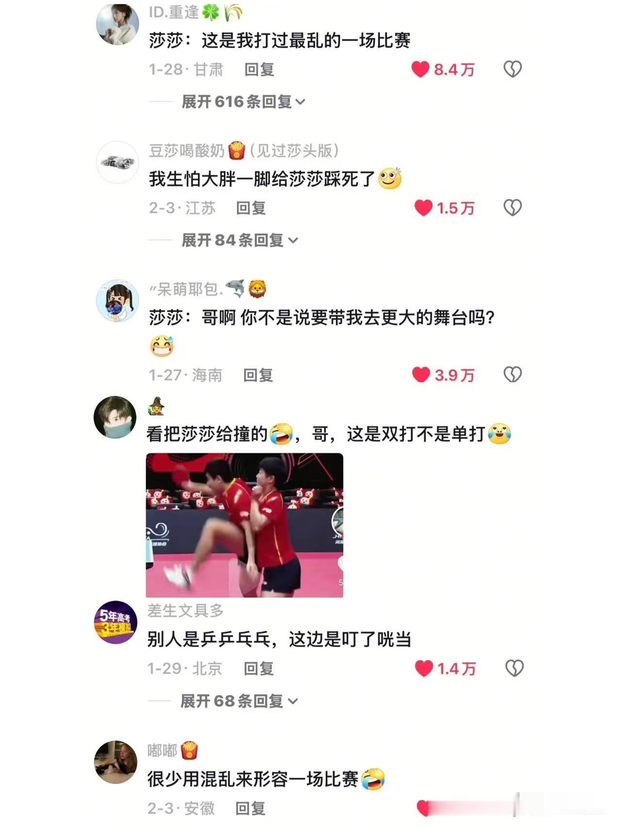 莎莎和梁靖崑配混双,网友评价句句到位。 大胖的原则:第一局不要,中远台不要,大胖的命不要,观众的命不要,要领妹妹去更大的舞台。 哈哈,这评价,简直就是真实写照。大胖和莎莎俩人的混双默契,如果说莎头是天选,这俩人就是临时凑局的。 有个跟甜豆沙打过的退役主播(忘了谁)说:“跟他们俩打,不仅要看球从哪飞来,还得防着莎莎不知道从哪钻出来的。” 这俩人的套路根本无法研究,没有任何默契赢球全屏自身实力。 对手都没办法研究。 这何尝不是一种战术呢?