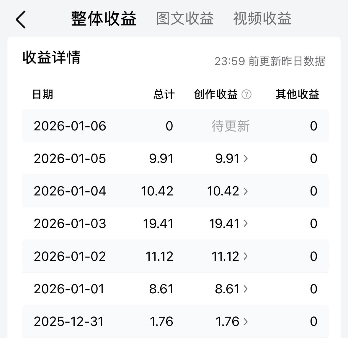 写文章收益低要不要坚持? 当然要坚持,坚持就是胜利!天天写,尝试不同的内容不同的赛道,总会碰到受众广的偶尔小爆一下,再说,写作一方面也是在记录生活,留下自己的脚印。若干年后再回首,点点滴滴记心头。 记录2026年元月五日收益:¥9.91,不跟别人比,只跟自己比,芝麻开花节节高,一年更比一年好。细水长流,知足常乐! 最近微信里的运动步数也在增加,一般情况下,每天都能走到一万多步。最近走路也比较规律:下午四五点钟,晒得到太阳的地方,会去西边的公园走两三圈,5000多步,晚上8:00左右,会去东边的公园走两三圈,8000左右步数。适量的活动,坚持就是胜利。