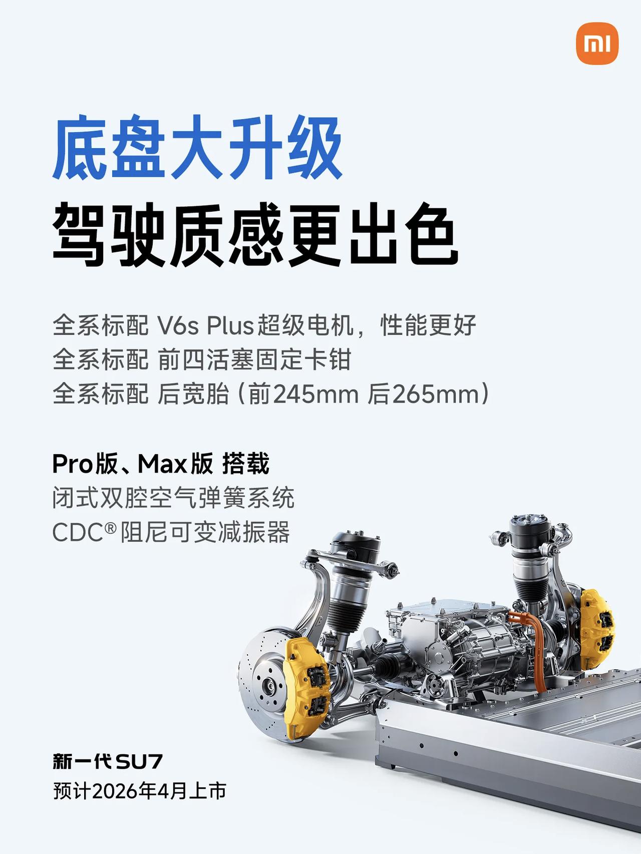 小米SU7全新版,直接开启预售,从公布的宣传图来看,升级的东西不少。预售起步价格22.99万元到30.99万元。起步价相比于原来的21.49万元,搞了15,000块钱,预计正式上市的价格可能还会比这个稍微低一点。新一代的小米SU7,定档在2026年的4月份。 此次升级的核心亮点集中在续航与配置:Pro 版 CLTC 续航达 902km,Max 版搭载 897V 高压平台,常温下 15 分钟可补能 670km;安全层面配备 2200MPa 超强钢内嵌式防滚架与 9 个气囊,电池也升级了防刮结构;辅助驾驶则实现全系标配激光雷达、700TOPS 算力,直接拉满硬件规格。 底盘、外观内饰也同步升级:全系标配 V6s Plus 电机与后265mm宽胎,Pro/Max 版新增空悬与可变减振器;新增卡布里蓝车漆、20 英寸轮毂,内饰换新配色与座舱设计。 还是一贯小米的作风,同级别能干到顶的,直接给你拉满。新车以“全系标配”多项高端配置为策略,而且原版小米SU7锁单未交付用户,也支持限时升级还能保留购置税补贴,从配置层面来看,这一次小米SU7的升级还是很有诚意的。【来自懂车帝车友圈】