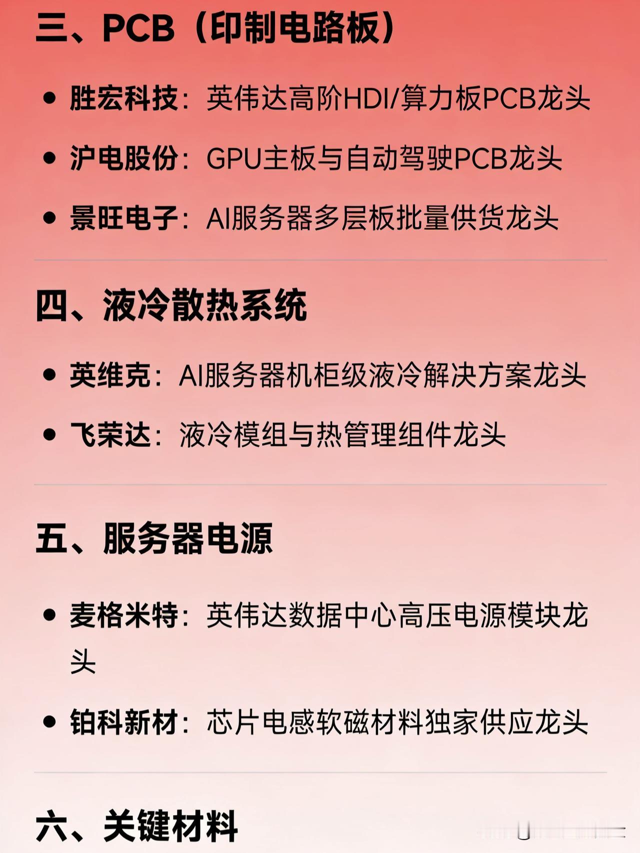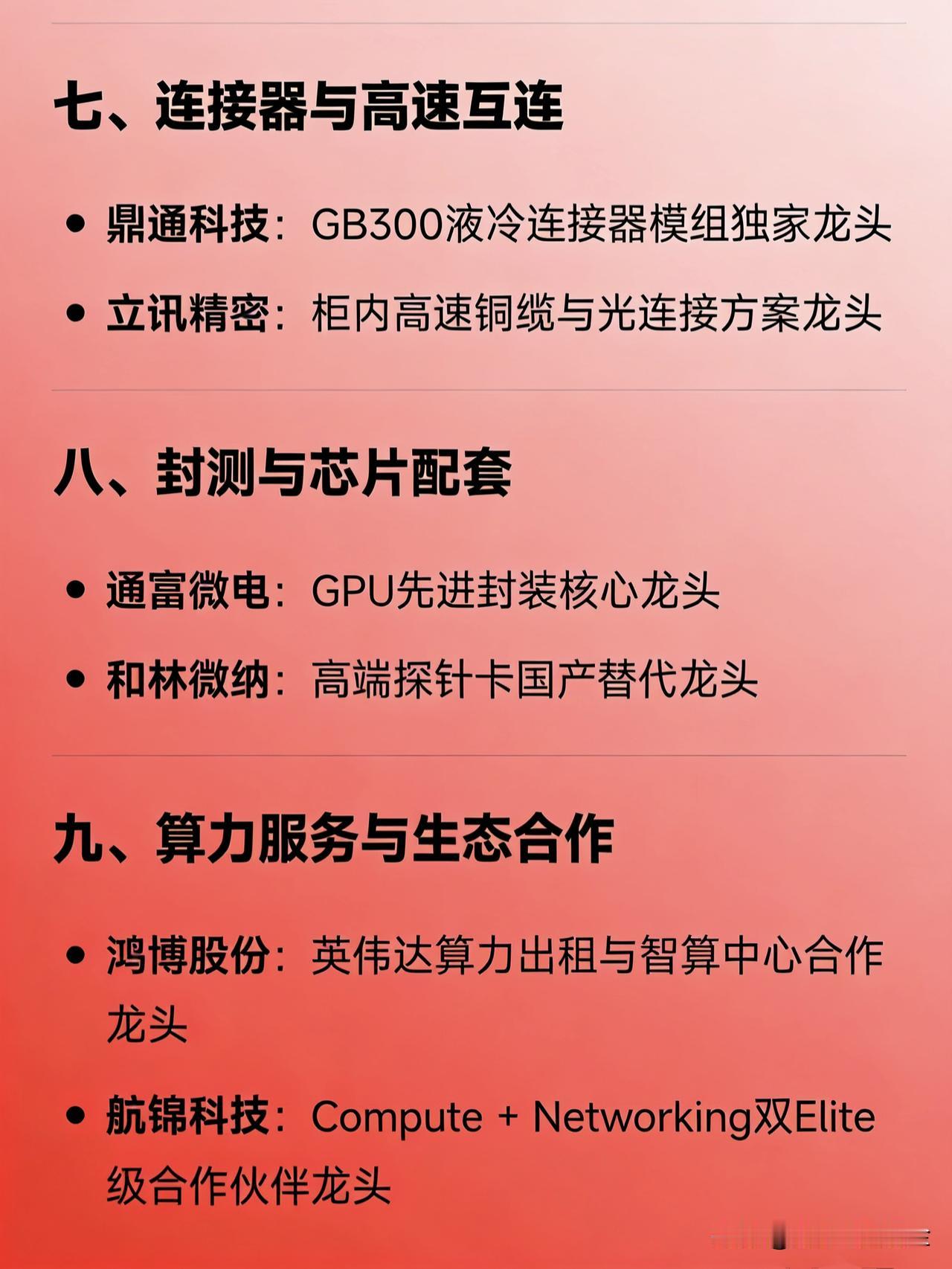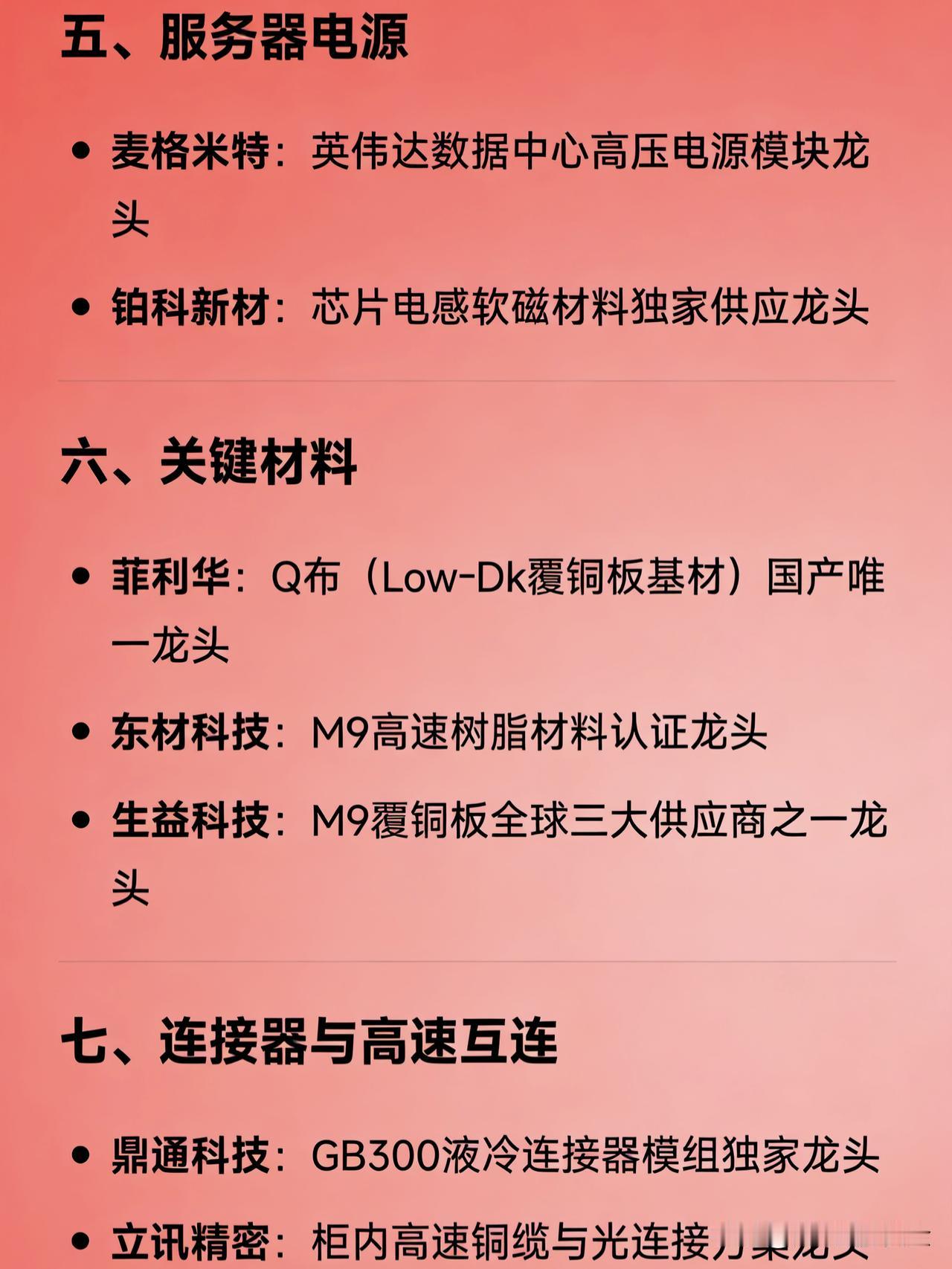 英伟达(NVIDIA)产业链在A股的核心龙头公司汇总 一、AI服务器整机与代工 工业富联:英伟达AI服务器全球代工龙头 浪潮信息:国内AI服务器整机龙头   二、光模块与光器件 中际旭创:800G/1.6T光模块全球龙头 天孚通信:光引擎与FAU封装核心龙头 新易盛:800G光模块主力供应商龙头   三、PCB(印制电路板) 胜宏科技:英伟达高阶HDI/算力板PCB龙头 沪电股份:GPU主板与自动驾驶PCB龙头 景旺电子:AI服务器多层板批量供货龙头   四、液冷散热系统 英维克:AI服务器机柜级液冷解决方案龙头 飞荣达:液冷模组与热管理组件龙头   五、服务器电源 麦格米特:英伟达数据中心高压电源模块龙头 铂科新材:芯片电感软磁材料独家供应龙头   六、关键材料 菲利华:Q布(Low-Dk覆铜板基材)国产唯一龙头 东材科技:M9高速树脂材料认证龙头 生益科技:M9覆铜板全球三大供应商之一龙头   七、连接器与高速互连 鼎通科技:GB300液冷连接器模组独家龙头 立讯精密:柜内高速铜缆与光连接方案龙头   八、封测与芯片配套 通富微电:GPU先进封装核心龙头 和林微纳:高端探针卡国产替代龙头   九、算力服务与生态合作 鸿博股份:英伟达算力出租与智算中心合作龙头 航锦科技:Compute + Networking双Elite级合作伙伴龙头