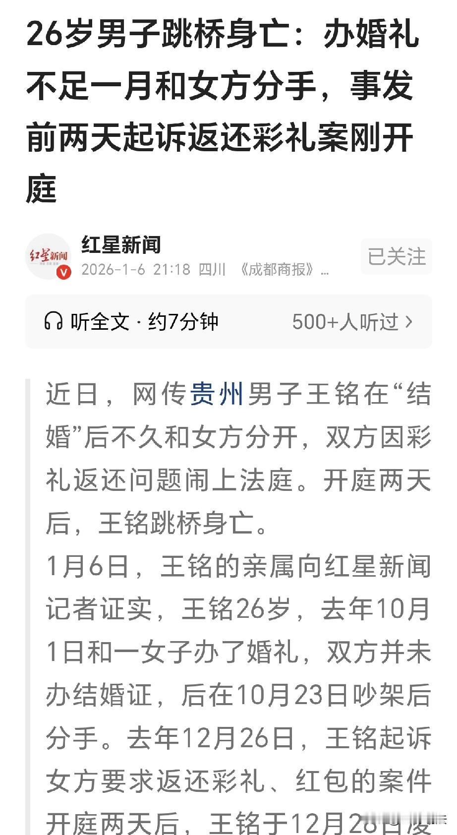 天都塌了!贵州毕节,一26岁男子和24岁女子结婚,但没领结婚证,男子给女子3万红包,8.8万彩礼,又花八九千买了金戒指,结婚22天,俩人吵架,女子回了娘家,男子要女子家返还彩礼,女子父母认为,你打了我闺女,还好意思来要彩礼?男子告到法院,可媒人作证,说他没看见彩礼,女子家算来算去,办嫁妆办酒席,再加上给男子的红包,反要男子归还19万,男子急了,从19米高的桥上一跃而下,结果令人唏嘘。 王铭26岁,为了生计,他远离家乡,来到深圳,找了一份工作。 2024年6月,媒人给他介绍了一位女子,女子和王铭加上彼此了联系方式。 2024年7月1日,王铭请假回到了家乡,到了晚上,就和阮女士见了一面。 阮女士24岁,她在之前生有一个女儿,可王铭对她一见钟情,对她的过往,并不介意。 阮女士告诉王铭,要他父母到她家提亲,王铭父母非常的高兴,双方父母见面,也对彼此非常的满意。 按照当地的风俗,王铭给阮女士家的亲戚父母,发了一万多块钱的红包。 2024年8月,阮女士又按照风俗习惯,到王铭家做客。 王铭父母订了酒店,双方欢聚一堂,连吃饭带发红包,王铭父母又花了20000万。 双方约定,9月9日给两个孩子举办订婚仪式,王铭心里高兴,盼着大喜的日子能快点来到。 可是通过相处,王铭发现阮女士抽烟喝酒,他接受不了,希望阮女士不要继续这样的习惯。 阮女士一口答应,我可以改,你别介意,9月9日,双方如约举办了订婚仪式。 10月1日,王铭和阮女士举办了婚礼,王铭父母非常高兴,儿子娶了媳妇,他们很快就能抱上大胖孙子。 为了这场婚礼,王铭父母借了10万元,这其中包含,向银行贷款5万,向亲友们借了5万。 王铭父母给阮女士家88000元彩礼,又给阮女士买了一个金戒指,花了大概八九千元。 婚礼上热热闹闹,亲朋好友们前来祝贺,可是双方只办了婚礼,没领结婚证。 结完婚后,王铭发现,阮女士压根没改,她依旧抽烟喝酒,屋子里一片酒气。 王铭生气,和阮女士吵架,可又无可奈何,阮女士压根就不当回事。 2024年10月23日,阮女士找了个借口,向公婆要了1000元,王铭因此此事,和阮女士吵了起来。 王铭认为,阮女士不该要钱,之前给的红包,她干嘛不拿出来花? 俩人打架,阮女士报警,还给父母打去了电话,警方调解无果,阮女士父母把她带了回去。 王铭父母给阮女士父母发去消息,他们表示: 结婚22天,8万8的彩礼不退怕是不合适。 可阮女士父母毫不示弱,你儿子打了我闺女,还好意思要求退彩礼! 既然对方不退彩礼,王铭一纸诉状高上了法庭。 他要求阮女士一家返还彩礼红包还有金戒指,并申请冻结了阮女士和父母的资金120000元。 可在法庭审理时,阮女士的三伯表示,俩人结婚时给了王铭13800元的红包2个。 还给了2个13800元的红包作为压箱钱。 阮女士家给了6床的陪嫁被子,并且在被子里包了1200元的红包6个。 三伯还说,他只看到了彩礼40000元,就连媒人都说,他没看到王铭的彩礼。 而阮女士表示,他们结婚之时,王铭早就把彩礼都抬回去了。 阮女士父母表示,他们结婚之时,娘家给阮女士的嫁妆,还有办酒席花的钱加在一起,大概花了有130000元。 到了最后,他们又加上红包,算来算去,反而要王铭家返还190000元。 王铭越想越气,心里的怒火已经无处发泄。 他想不通,为什么这样的事情会发生在自己身上,家里本来就不宽裕。 父母为了他的婚事,焦头烂额,10万元的外债,还不知道何时才能还清。 2024年12月28日凌晨1点,王铭彻夜难眠,他离开了家门,一路行走,来到4公里外的万寿桥上。 王铭纠结徘徊,他咽不下这口气,又觉得难过,自己的一生如此的悲催。 他想来想去,有过犹豫,也舍不得父母,可是到了最后,6时25分,他从19米高的桥上一跃而下。 父母醒来,看不到儿子,他们四处寻找,终于在万寿桥上发现了儿子的衣服。 消防立刻组织了营救,可不幸的是,王铭被捞上来时,已经失去了生命。 他们的案子还在审理,并没有宣判,王铭家人认为,王铭是想不开了,他们要求阮女士家给个说法, 《最高院关于审理涉彩礼纠纷案件适用法律若干问题的规定》第6条规定: 双方未办理结婚登记但已共同生活,一方请求返还彩礼的,法院应结合彩礼使用、共同生活时长、过错等事实确定返还比例。 王铭与阮女士仅办婚礼未领证,属婚约财产纠纷。 8.8万彩礼、八九千金戒指是为以结婚为目的的习俗给付,符合彩礼认定标准。 双方共同生活仅22天,时间极短,且王铭家因彩礼背负10万外债,彩礼数额对其家庭属过重负担,法院会考虑支持部分返还。 阮女士家主张的嫁妆酒席开销,可作为扣减返还数额的考量因素,但要提供充分证据,否则应承担举证不能的不利后果。 关注@王哥说法 多学法律少吃亏!