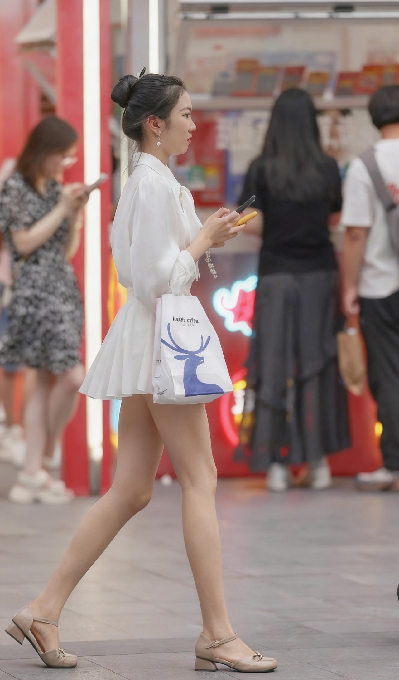 都市时尚女孩,白色连衣裙搭配高跟鞋,手拿手机和购物袋,漫步街头。