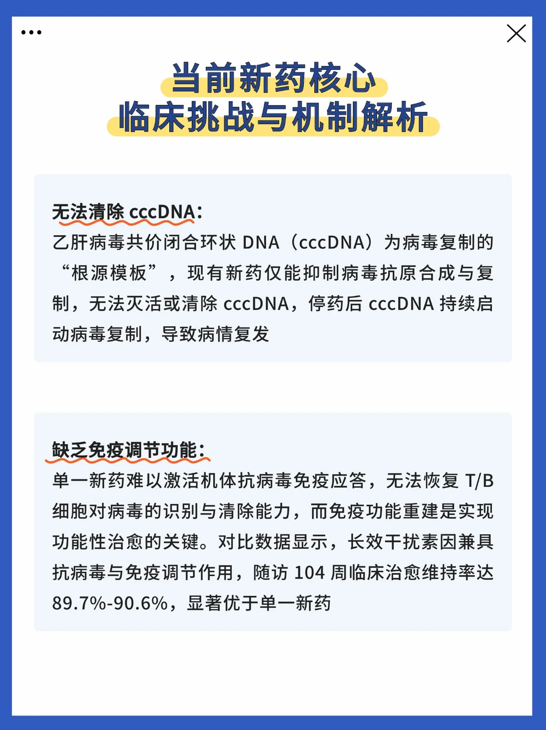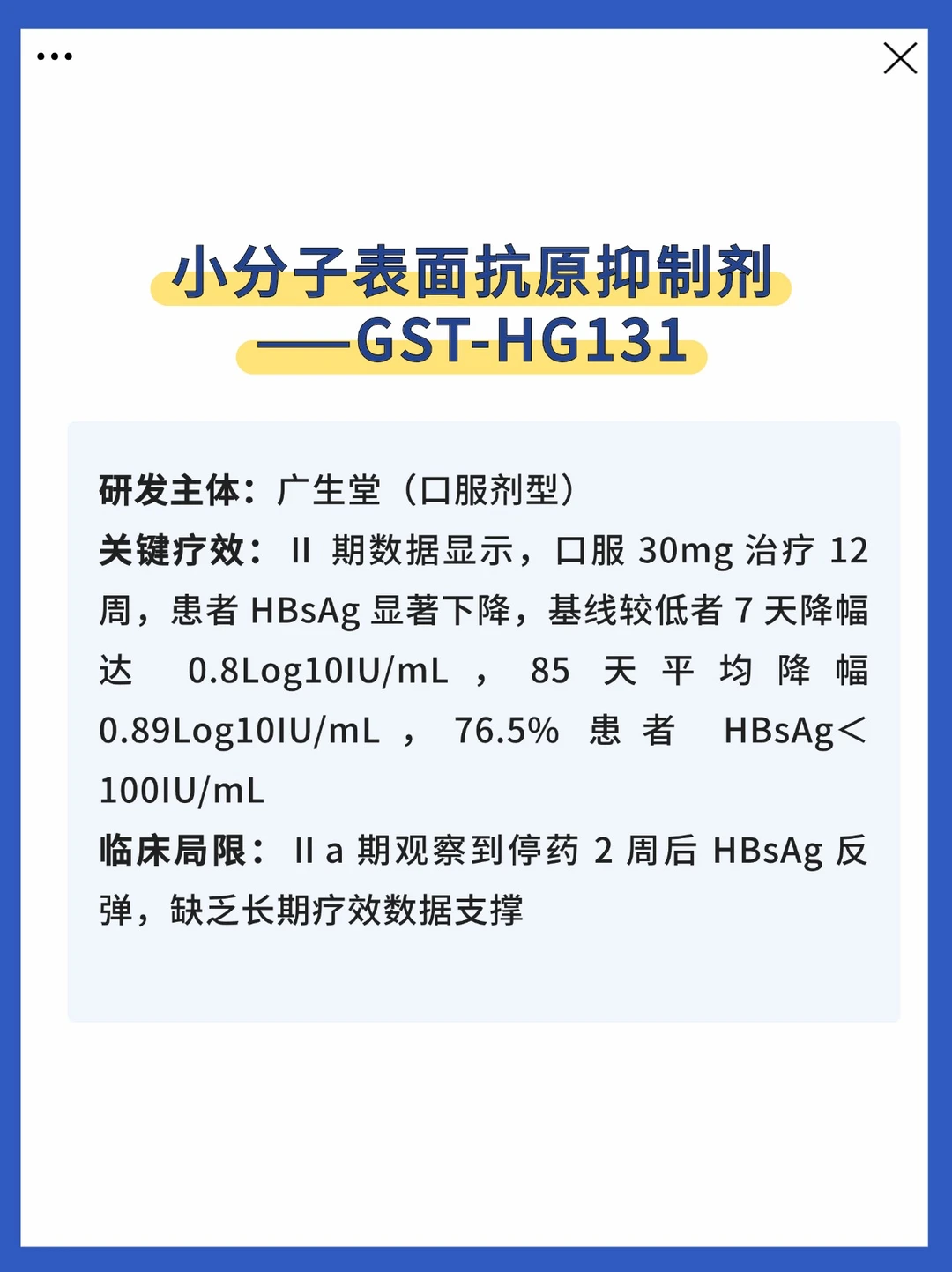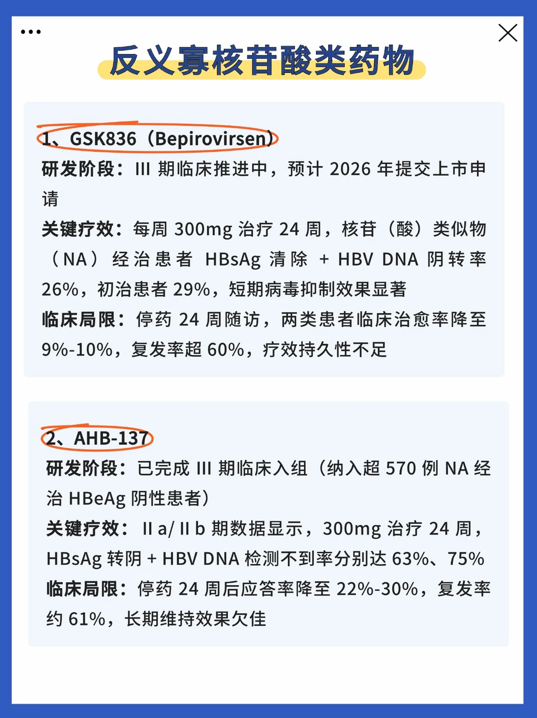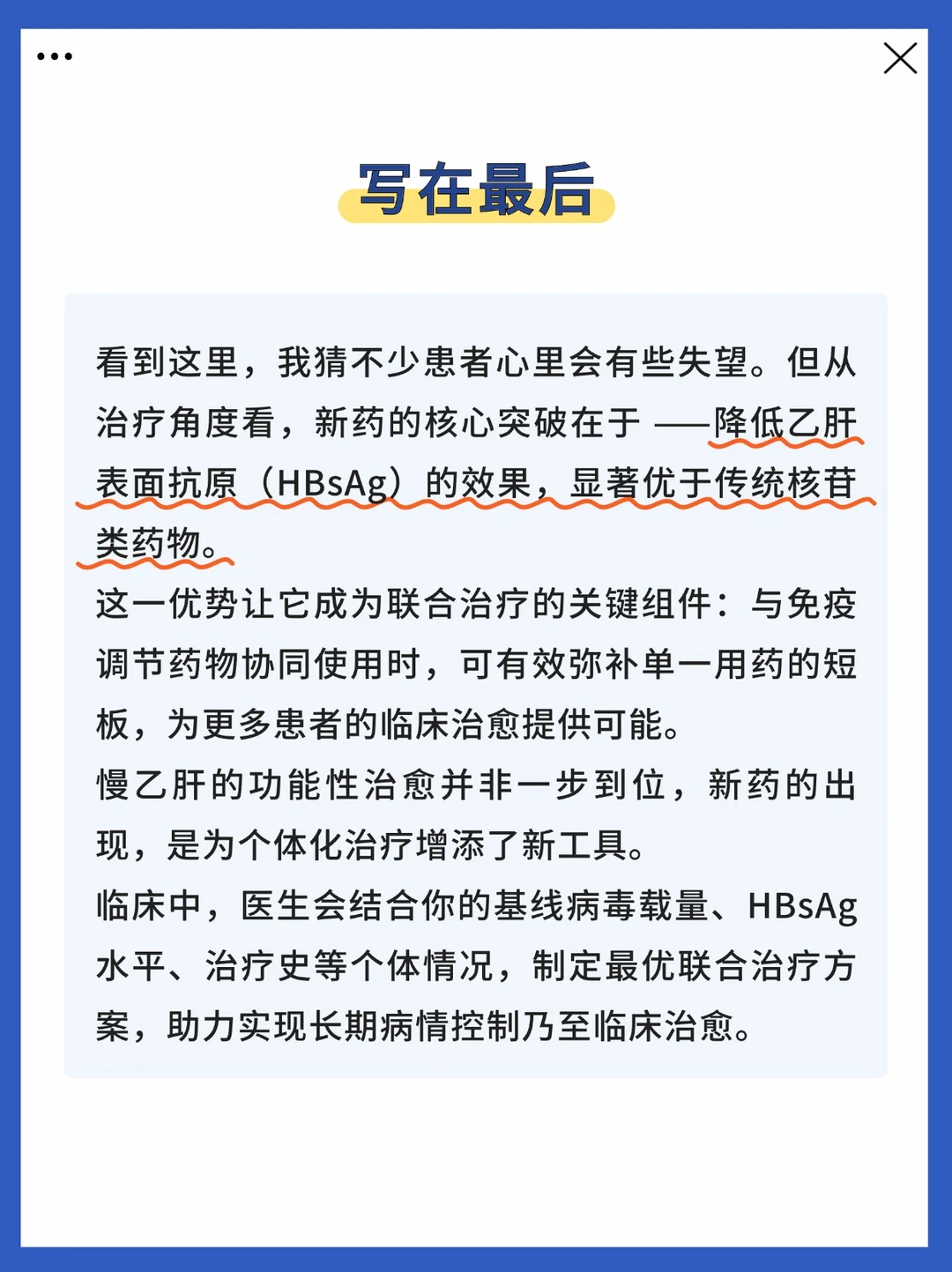 看到这写,我猜不少患者心里会有些失望。但从治疗角度看,新药的核心突破在于——降低乙肝表面抗原(HBsAg)的效果,显著优于传统核苷类药物。 这一优势让它成为联合治疗的关键组件:与免疫调节药物协同使用时,可有效弥补单一用药的短板,为更多患者的临床治愈提供可能。 慢乙肝的功能性治愈并非一步到位,新药的出现,是为个体化治疗增添了新工具。 临床中,医生会结合你的基线病毒载量、HBsAg 水平、治疗史等个体情况,制定最优联合治疗方案,助力实现长期病情控制乃至临床治愈。