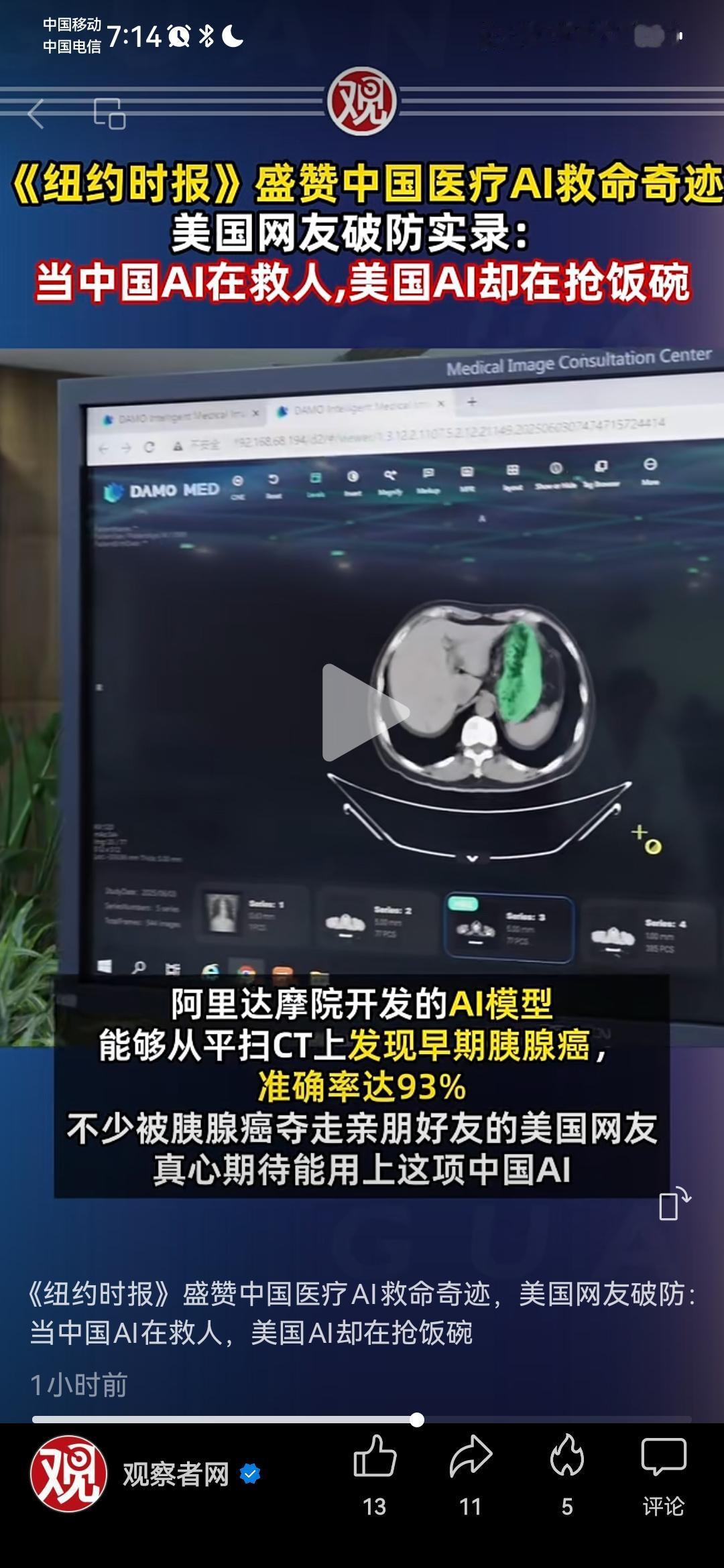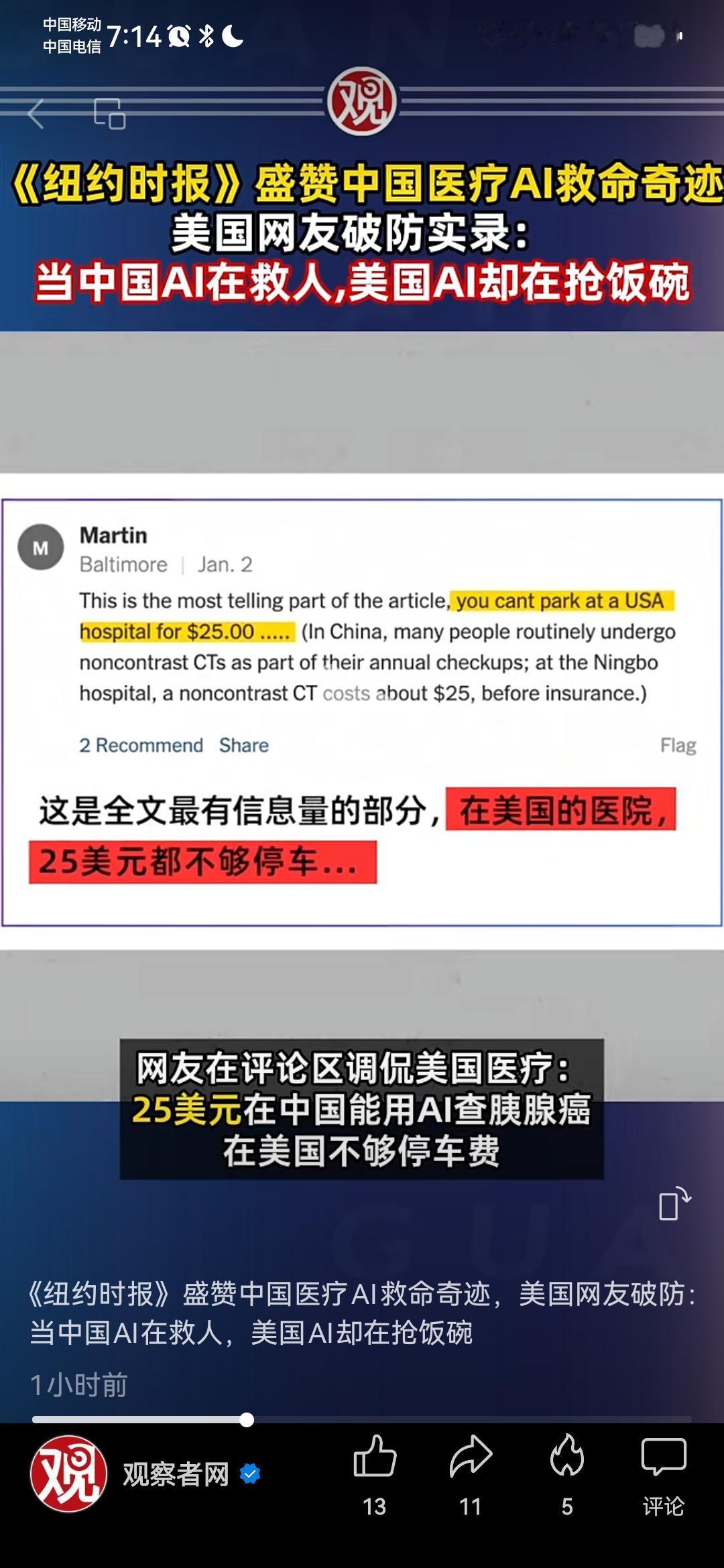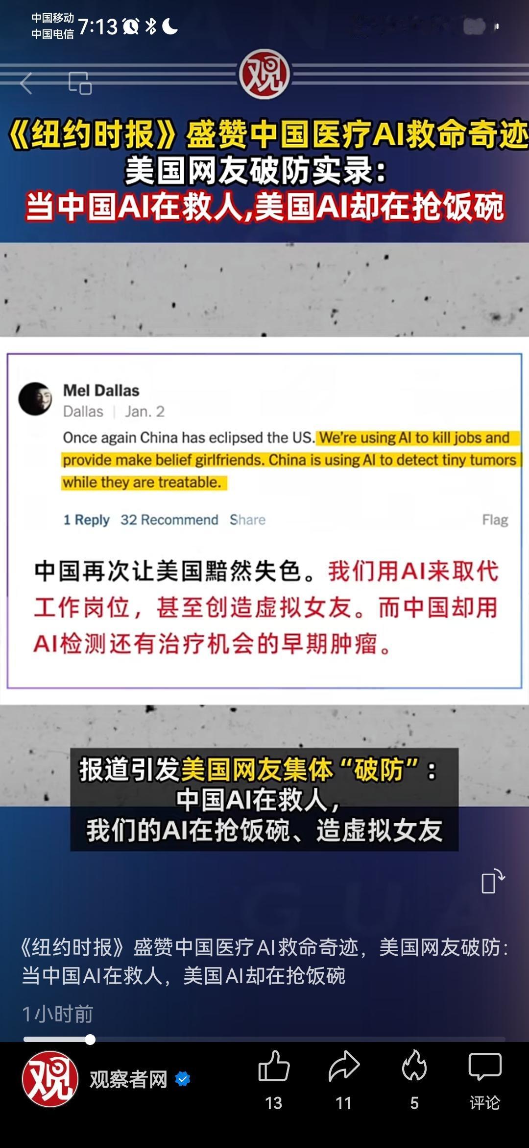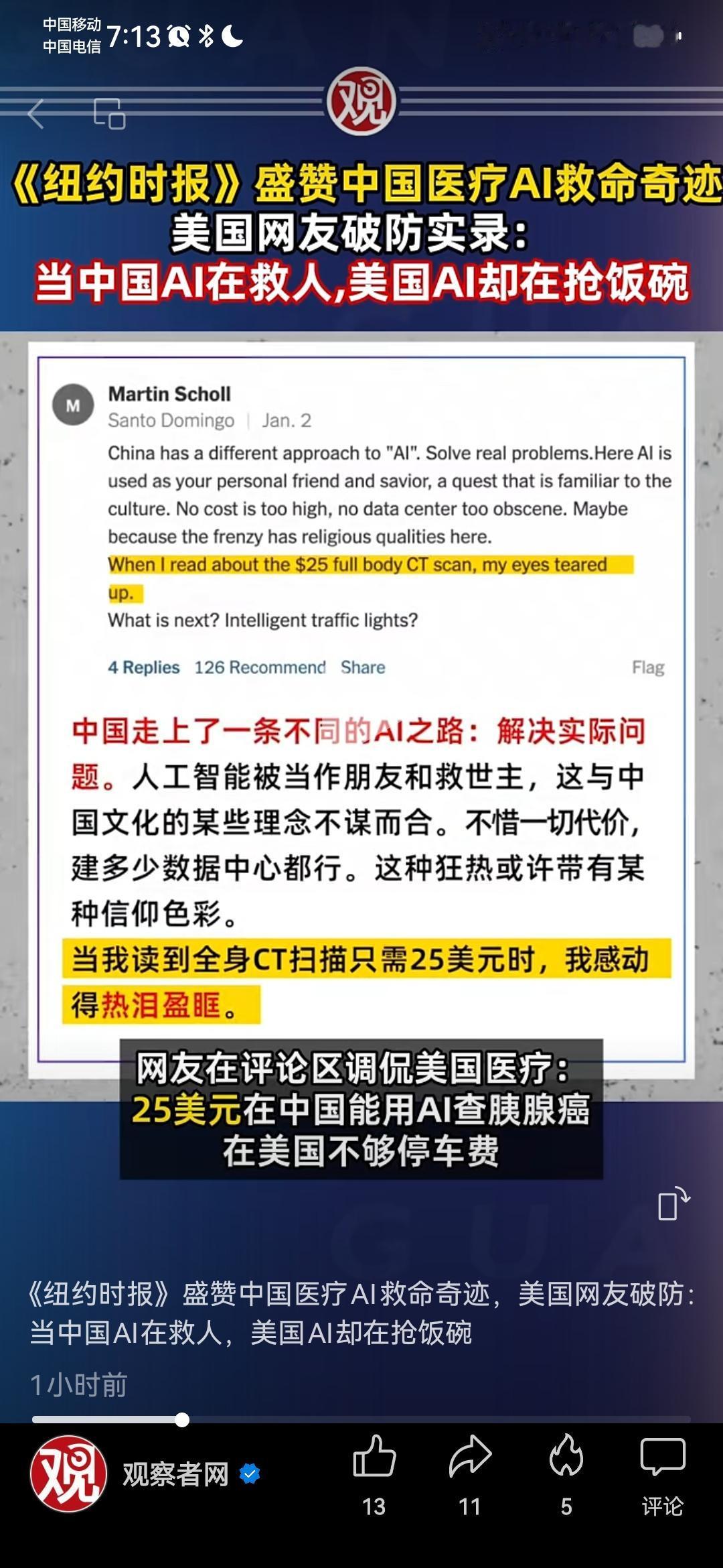 最近,纽约时报竟然花费了整整一个版面来报道中国AI,内容是中国的一个退休了的泥瓦匠,仅仅花费了25美元,就通过阿里巴巴研发出来的一个医疗AI,检测出了自己的胰腺癌。 纽约时报知道这件事情之后,完全震撼了,因此,不惜花费整整一个版面来详细报道这个新闻。之所以如此,是因为中国AI的这个表现,跟美国AI一对比,直接就让美国AI彻底的黯然失色,当美国AI还在研究怎么取代其他人的工作岗位,怎么制造出完美的虚拟女友,怎么才能赚更多钱的时候,中国却已经将AI应用到了能够切切实实改善人们生活水平的领域。 纽约时报报道了这个新闻之后,美国网友也是完全吃惊了,有一个美国网友就留言说,在美国的医院,25美元都不够停车,但是在中国,仅仅用25美元就能够帮助人们检测出胰腺癌; 还有美国网友更是深受感动,直接就说中国AI已经走向了一条与众不同的道路,那就是解决具体的实际问题,他说当他读到全身CT扫描只需要25美元的时候,感动得热泪盈眶。 这些美国网友看到了中国AI的表现,再看美国自己的AI,就是怎么看怎么嫌弃了,这两者的对比让美国的AI黯然失色,让人不由得深深怀疑,美国发展这个AI,对美国普通人,哪怕有那么一点点的正面意义吗? 技术只是技术,怎么使用这个技术,才是真正衡量一个国家文明的标准,毫无疑问,美国在这一块表现得非常糟糕,这或许就是中国文明与欧美文明的最根本的区别,当他们只知道牟利的时候,当他们追求那些虚无的高大上的目标的时候,我们的目光却在向下,力图使人们能够真正的享受到每一项技术的益处,美国人自己都对这个很不满了。 两种文明,孰优孰劣,从这一点就可以看出来了。