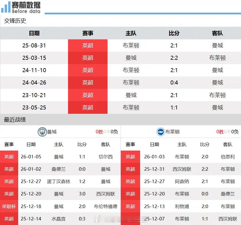 曼城vs布莱顿前瞻:曼城两大主力后卫伤缺 以攻代守主场力擒海鸥北京时间1月8日凌晨03:30,英超第21轮,曼城主场迎战布莱顿。曼城vs布莱顿,比赛看点如下:第一:两队情况!英超20轮战罢,曼城13胜3平4负积42分排名第二,落后榜首阿森纳多达6分;布莱顿7胜7平6负积28分排名第十,落后欧冠区仅3分。上轮英超,曼城主场1-1遭切尔西绝平,近2轮全部战平;布莱顿主场2-0力克伯恩利,终结了联赛6轮不胜。第二:曼城两大主力后卫伤缺,以攻代守主场力擒海鸥!瓜迪奥拉新的麻烦来了,就是两大主力后卫鲁本-迪亚斯和格瓦迪奥尔受伤了,其中格瓦迪奥尔是骨折的重伤,基本上已经赛季报销了。曼城遭遇了巨大的后防线伤病潮,主场面对布莱顿,瓜迪奥拉或许唯有以攻代守,用强大的进攻压制布莱顿,并在主场力擒海鸥。哈兰德遭遇了3轮英超比赛的进球荒,魔人需要稳定输出提升巨星气质。曼城落后阿森纳已经多达6分,此役肯定全力拿下终结2轮联赛不胜。布莱顿状态很一般,球队荣誉感不是很强。综上所述,此役看好残阵曼城主场拿下布莱顿,全取3分,紧追阿森纳。双方近6次交手,2胜2平2负,难分伯仲。双方伤停情况:曼城有科瓦契奇、鲍勃、萨维奥、迪亚斯、格瓦迪奥尔、尼科-冈萨雷斯(疑)、斯通斯(疑);布莱顿有韦伯斯特、马奇、齐马斯、明特、韦弗。