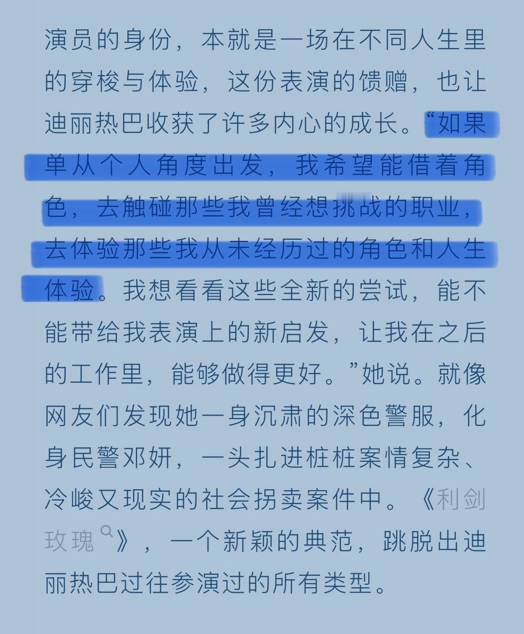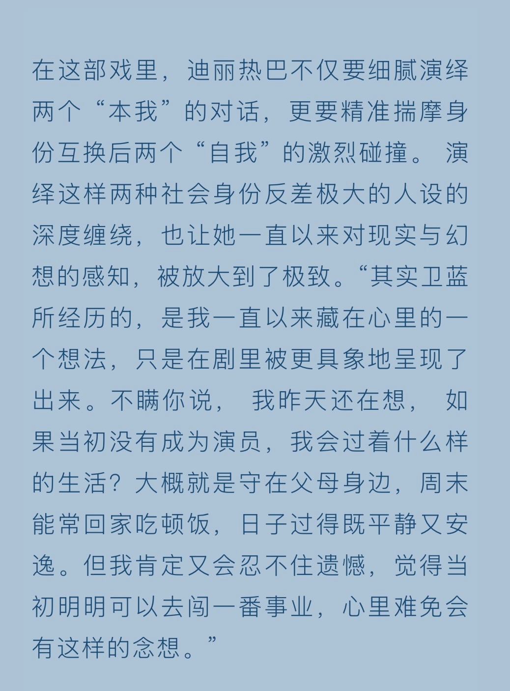 迪丽热巴说成为演员是想实现自我价值《虽然不能同时拥有一切》里的卫蓝,是热巴藏在心里想要尝试的另一种人生,越来越期待卫蓝的到来了迪丽热巴说卫蓝的经历是她藏在心里的想法