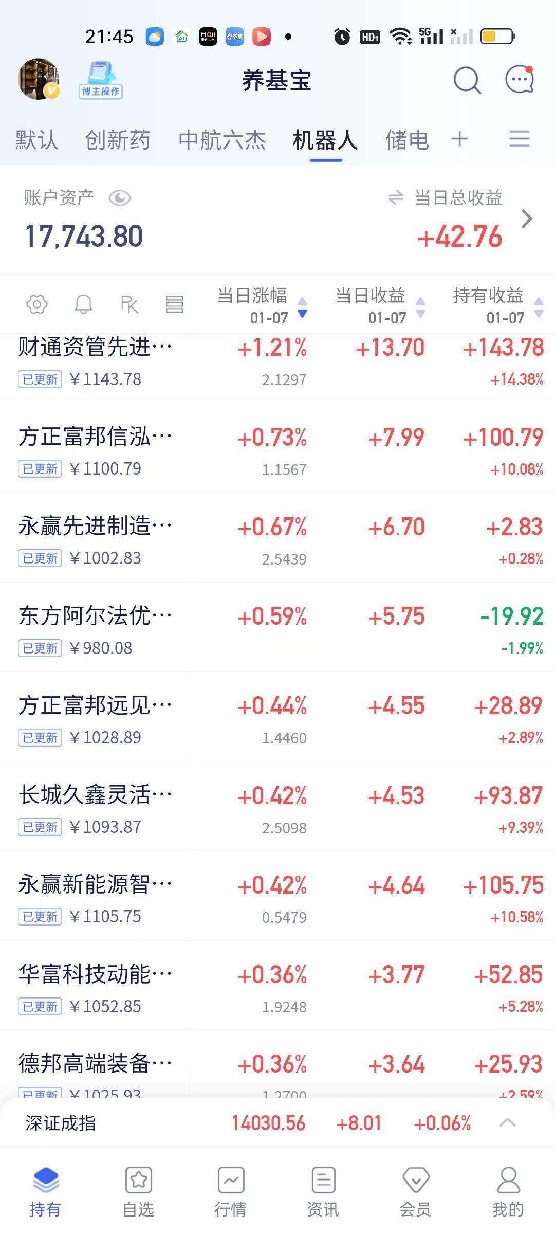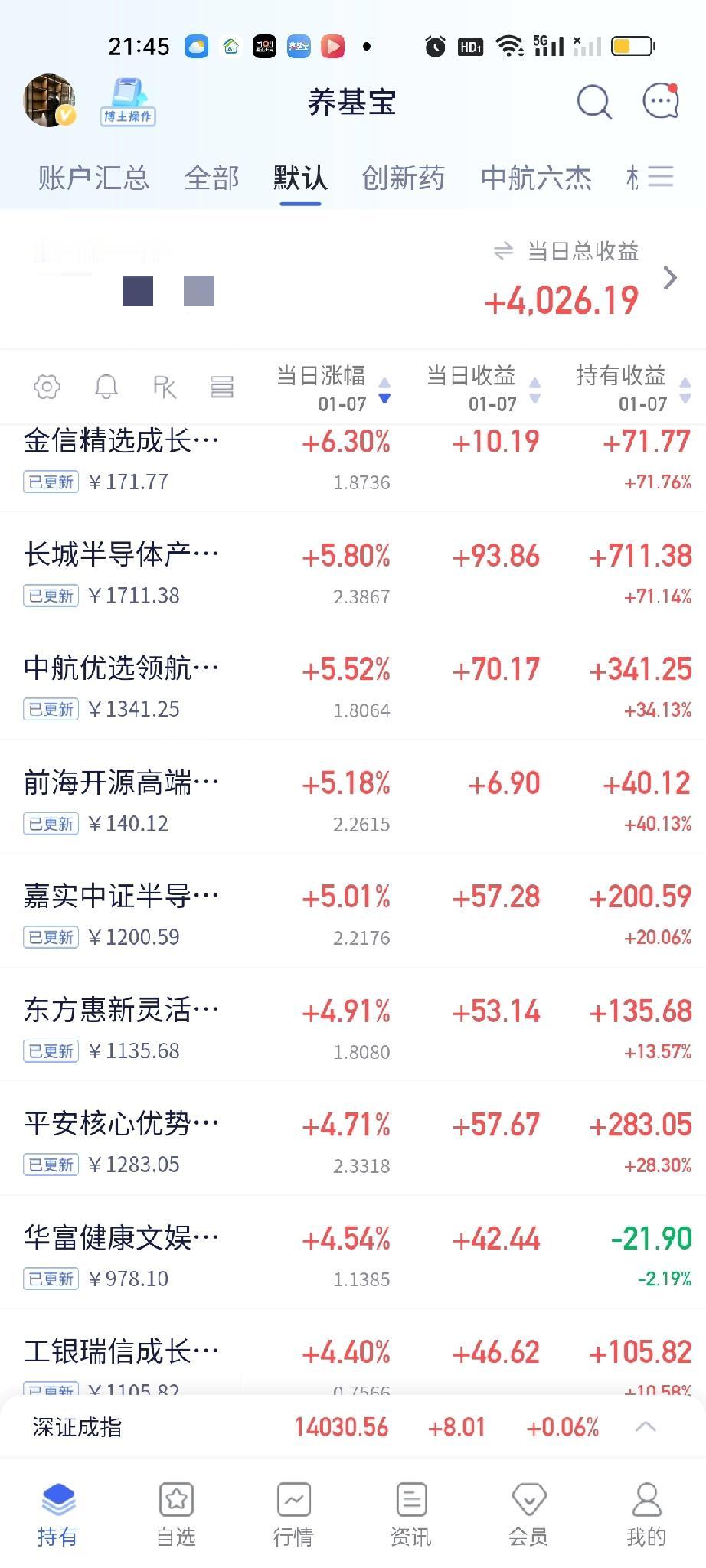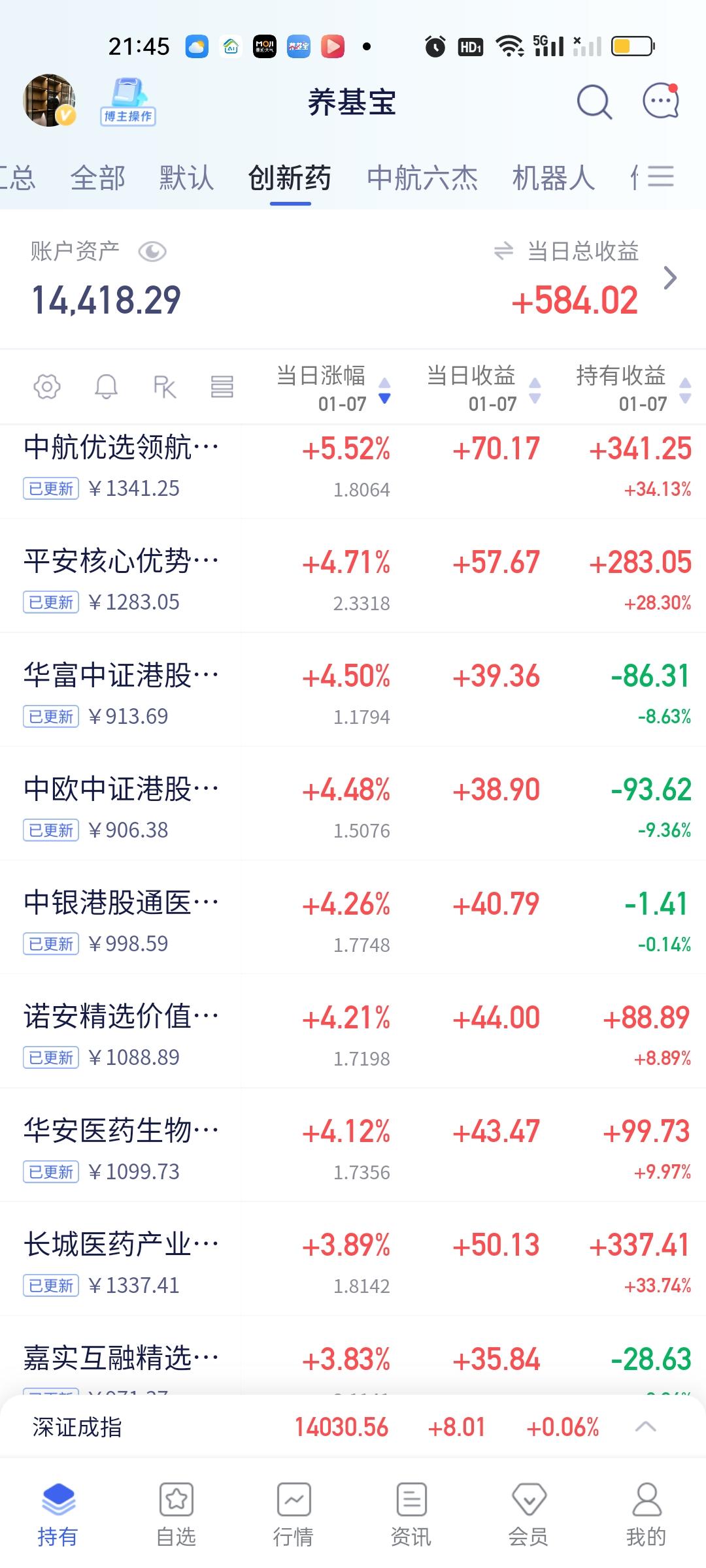 今天总体来看还是高开了不少的,但估值排第一第二的工银瑞信成长和平安核心优势都低开了,取而代之的是金信精选成长,长城半导体产业。中航优选领航今天在创新药板块的表现非常抢眼。前海开源高端装备,嘉实中证半导体也都开了5%以上。机器人开出来都是微红的状态。