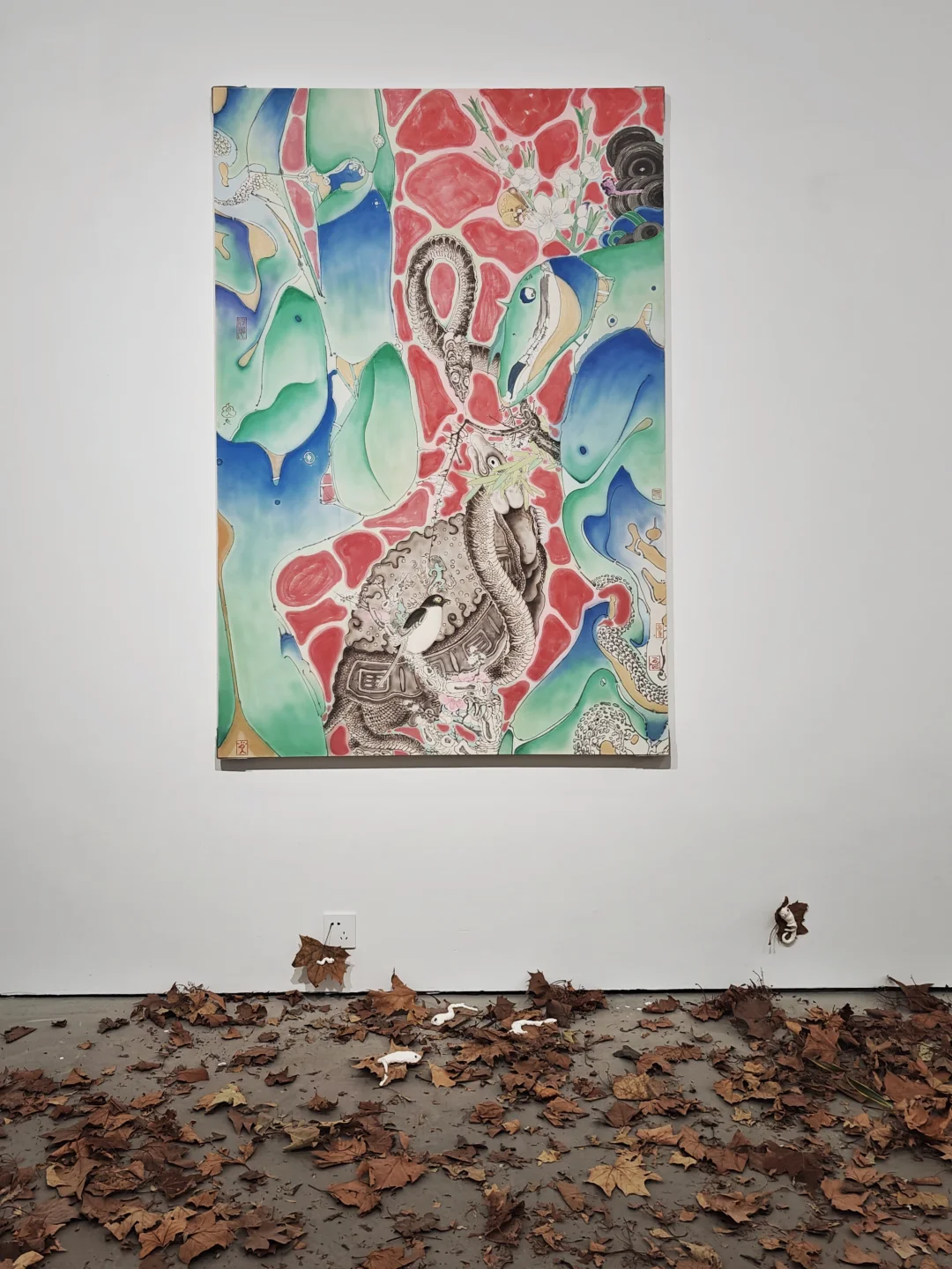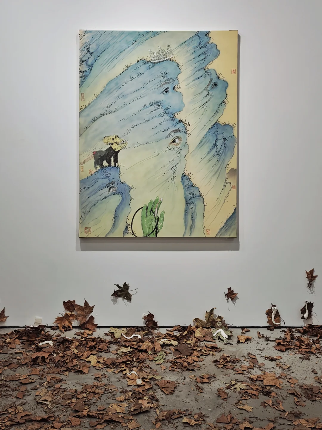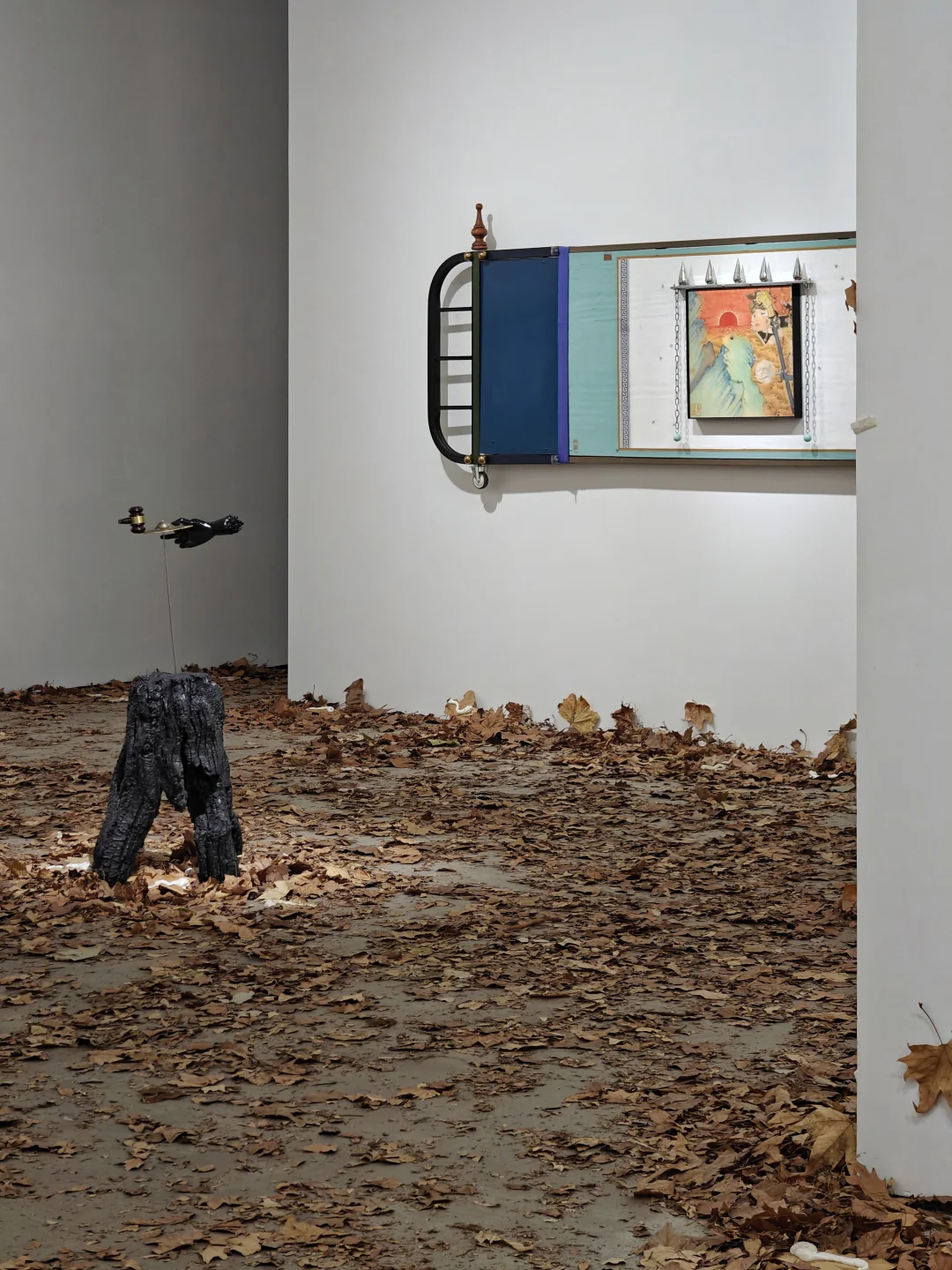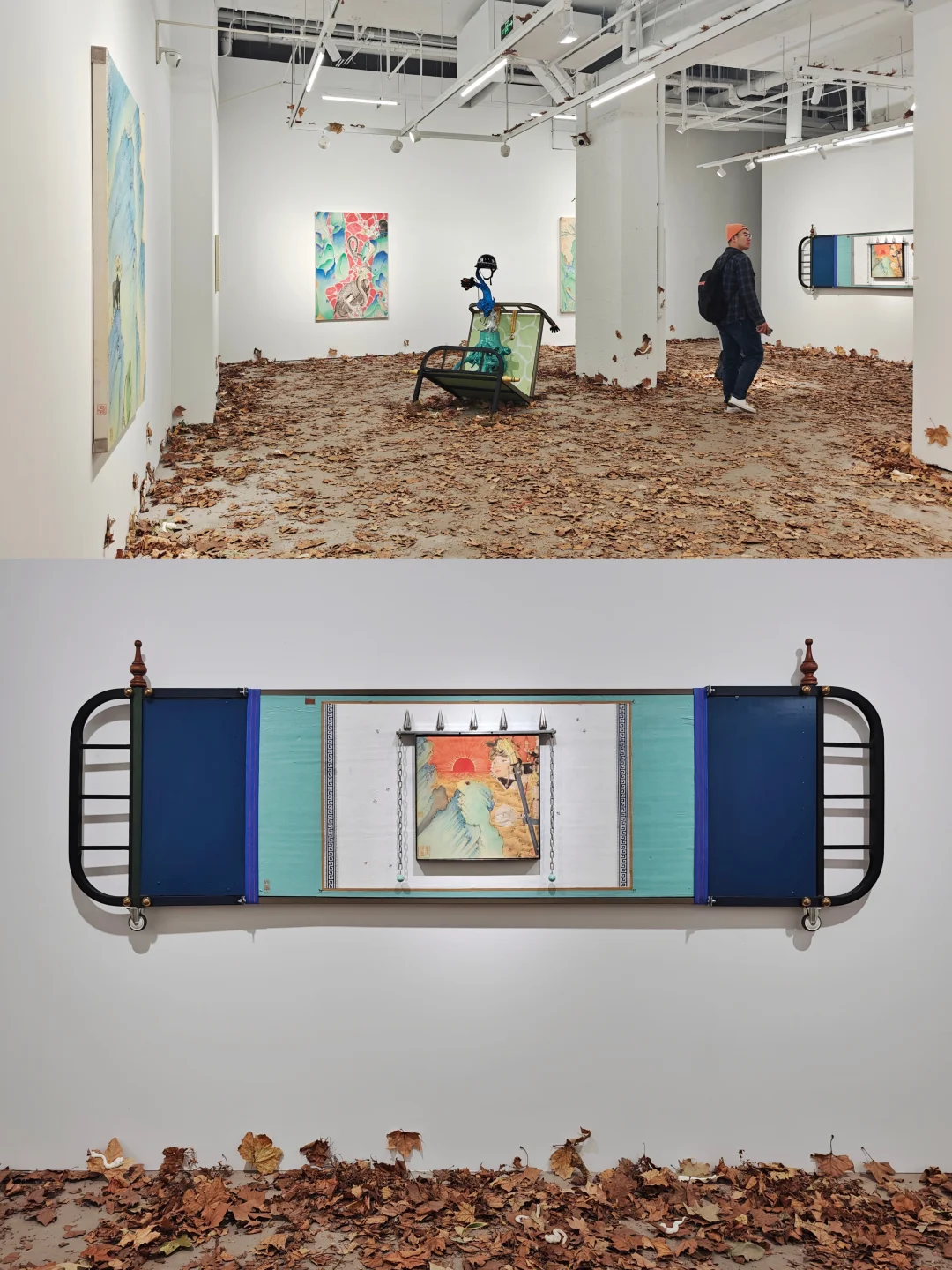 展厅地面铺满艺术家北京工作室的枯黄落叶