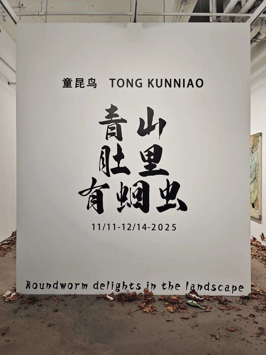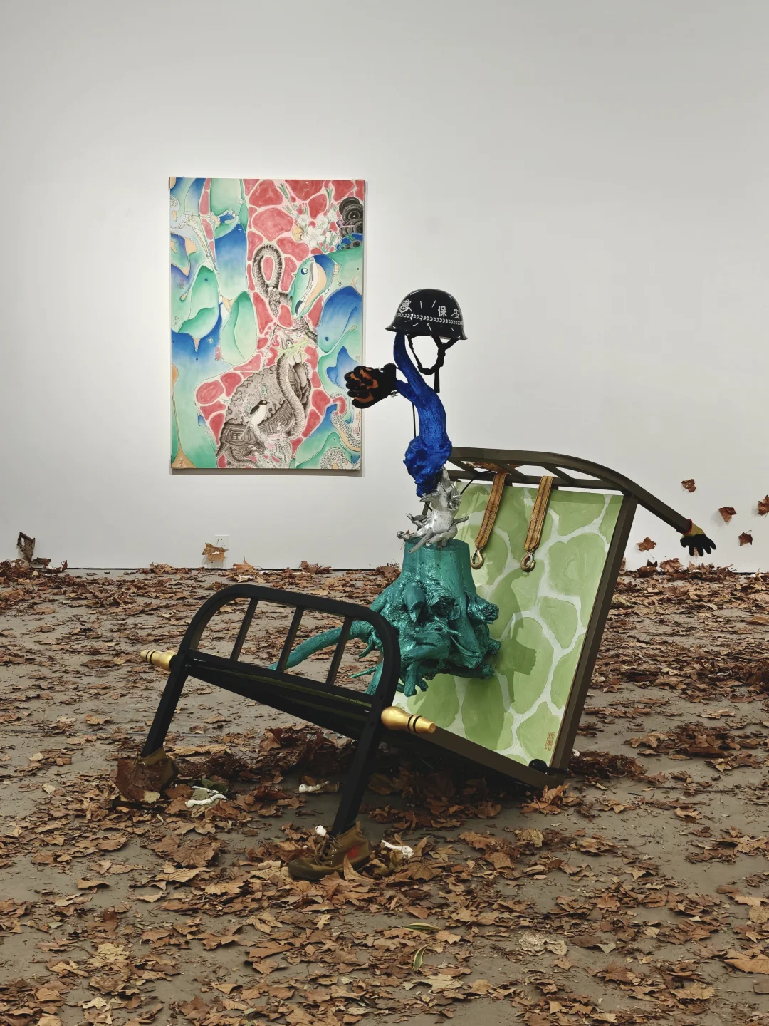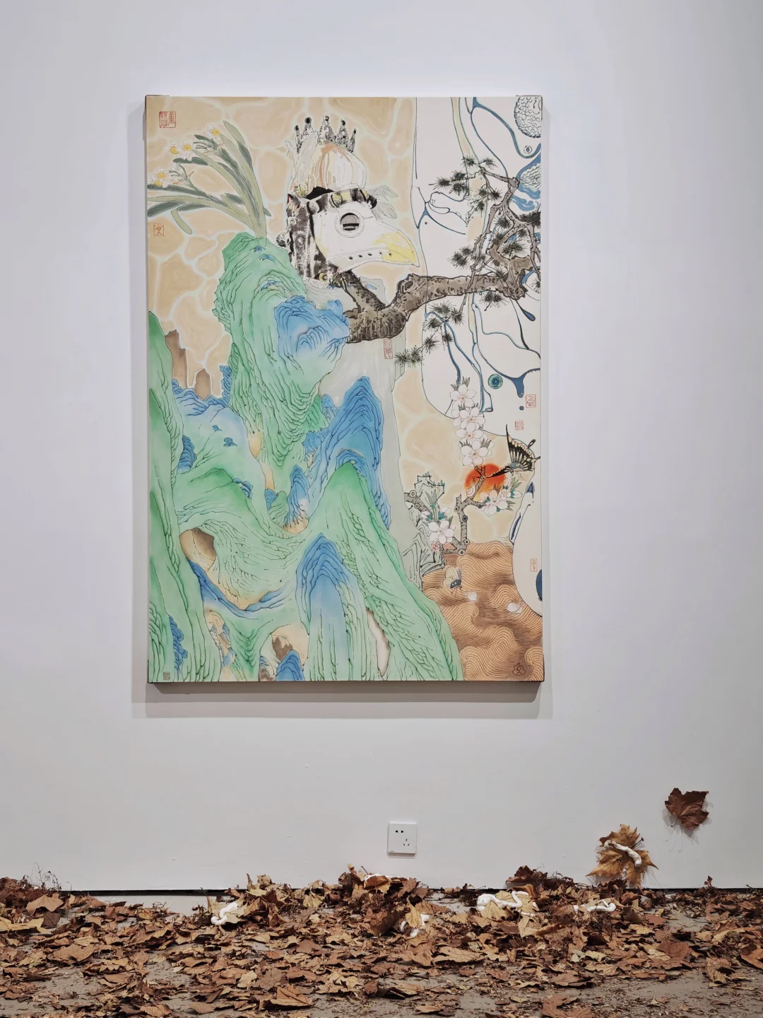 展厅地面铺满艺术家北京工作室的枯黄落叶