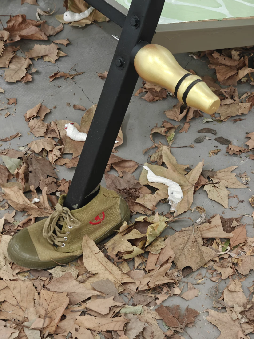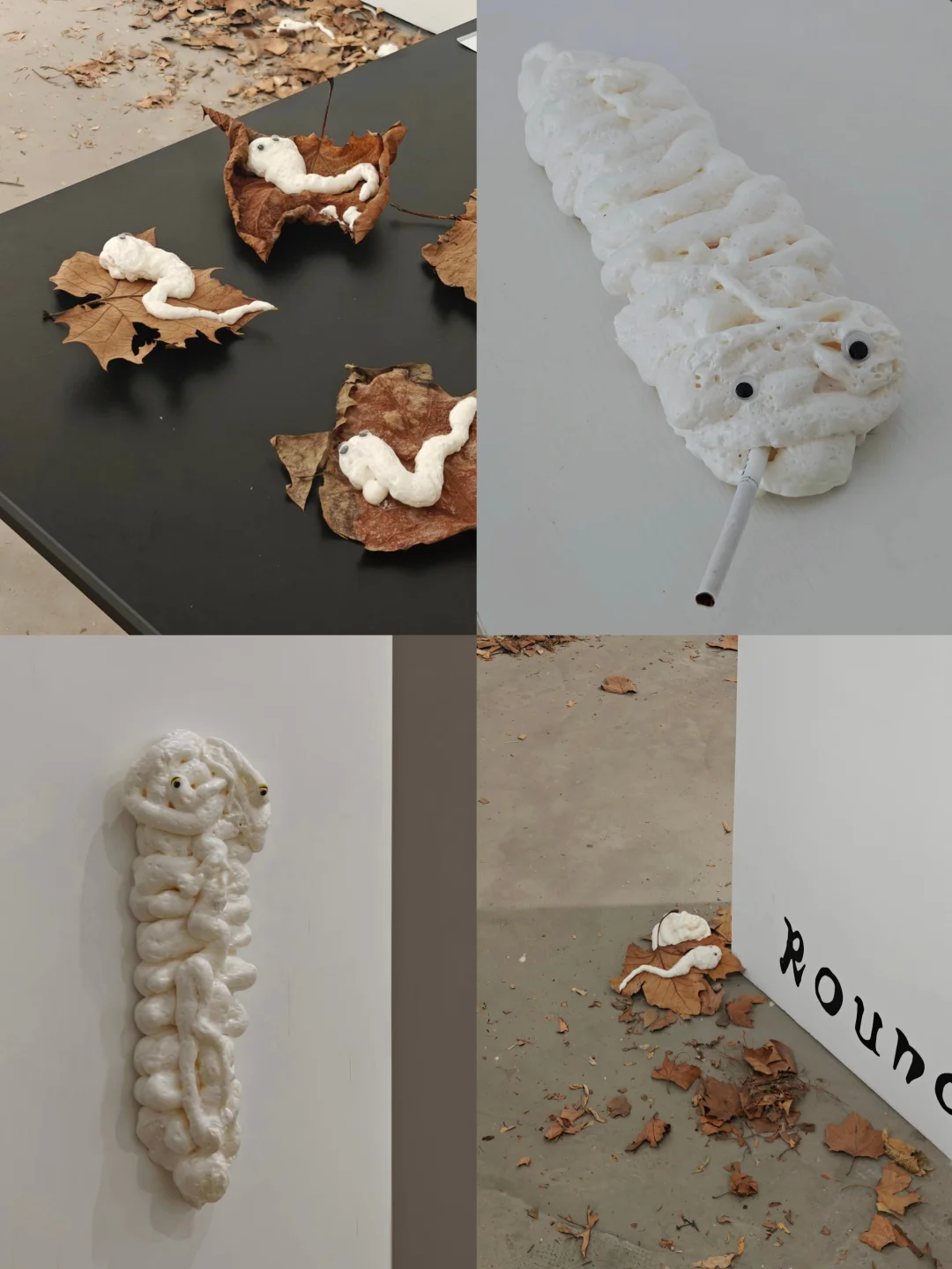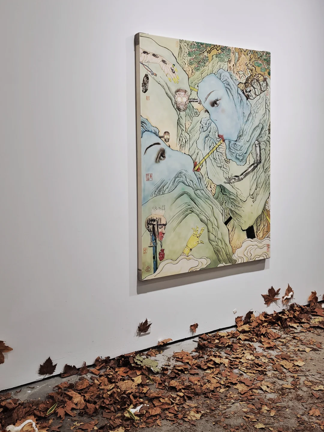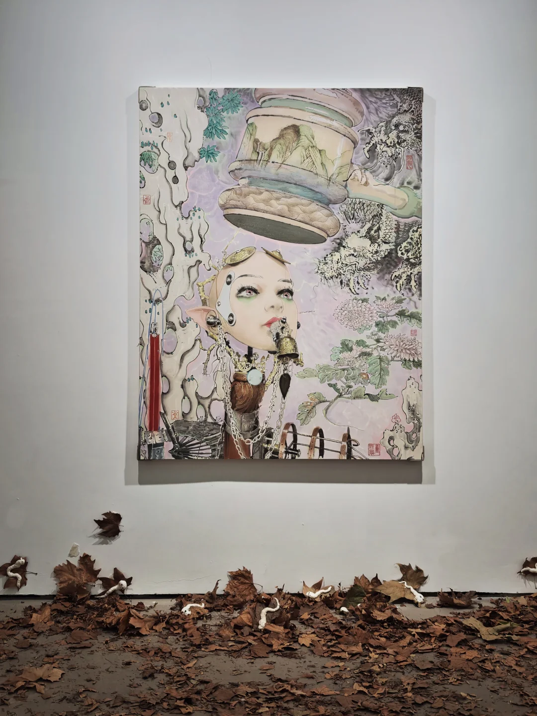 展厅地面铺满艺术家北京工作室的枯黄落叶