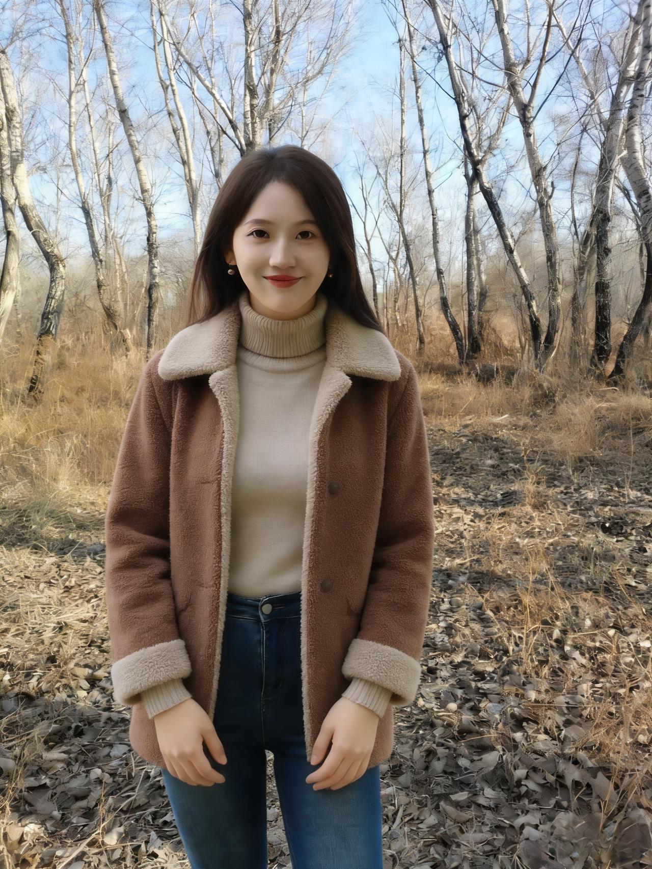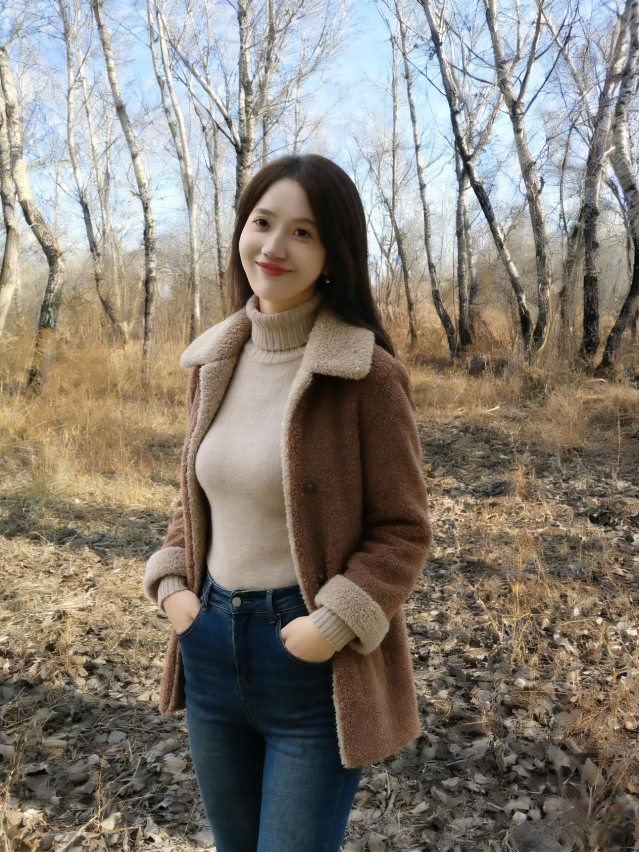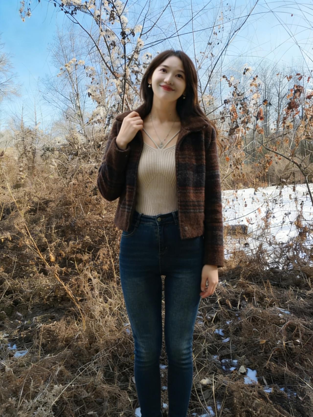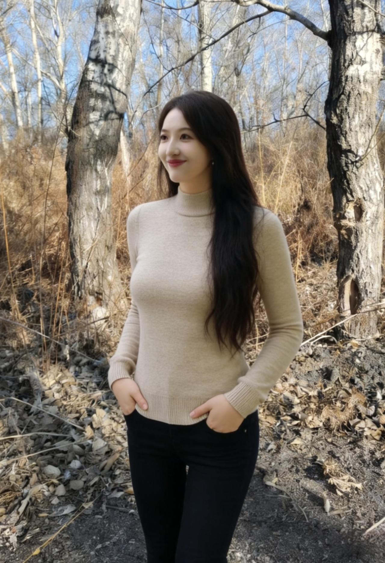枯树的枝桠伸向天空 她的身影,是林间温暖的序章 针织衫的纹路,牛仔的粗粝 撞出秋末最温柔的质感