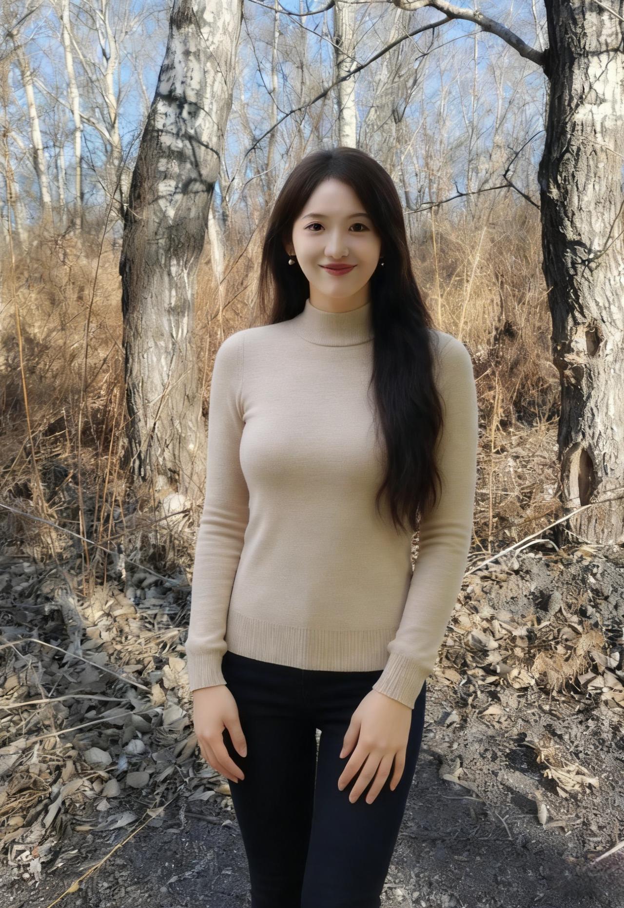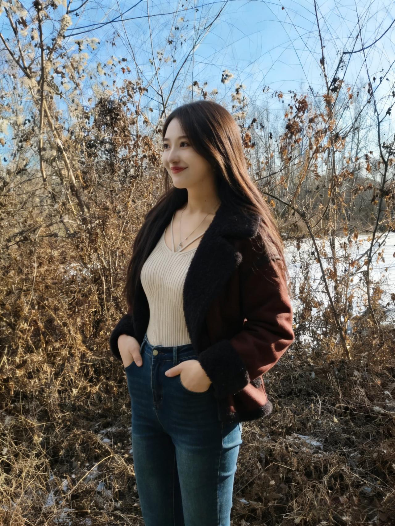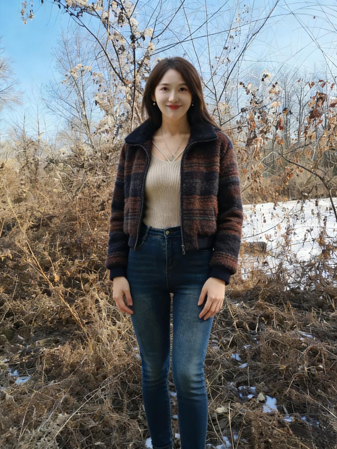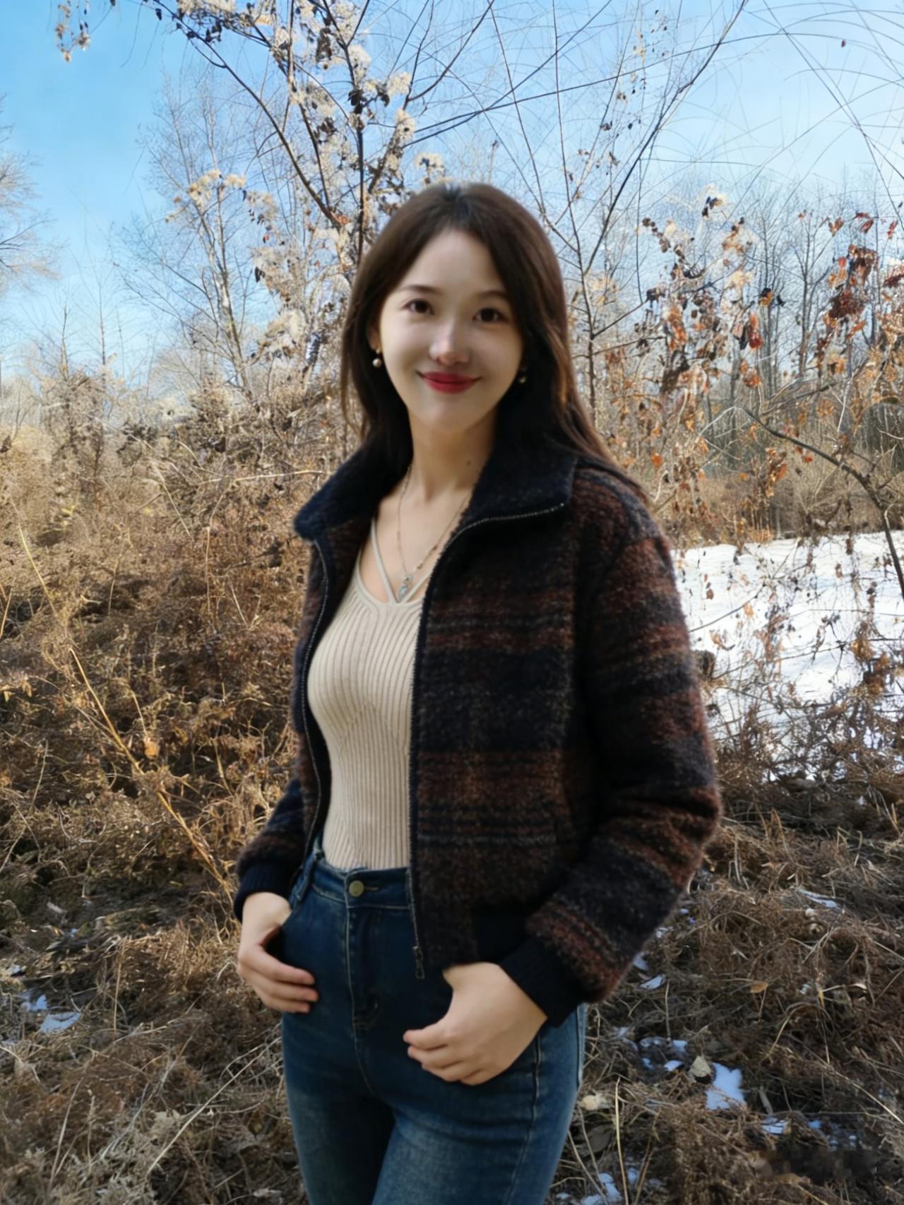 枯树的枝桠伸向天空 她的身影,是林间温暖的序章 针织衫的纹路,牛仔的粗粝 撞出秋末最温柔的质感