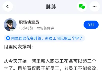 据脉脉网传消息,从今天开始,阿里新入职员工花名可以起三个字了。不过,目前看仅限于新员工,老员工不能修改。