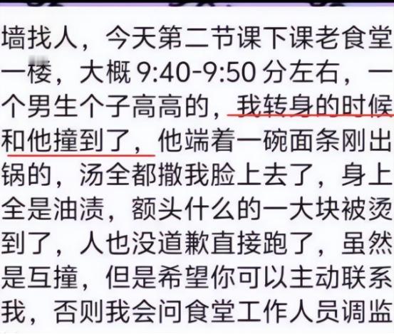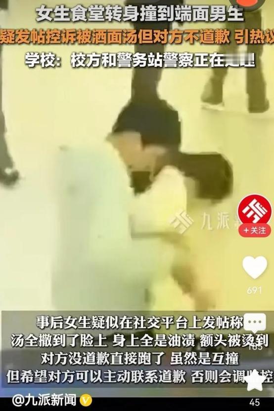 安徽宣城,男大学生,在食堂打了一碗刚出锅的面条,他旁侧有一女大学生,突然横撞过来把他面条撞翻在地,男生并未说什么,甩着被烫的手离开了。而女生认为虽为互撞,男生也应该跟她道歉,因为面条汤汁溅到她身上脸上,她的衣服上也印上了油渍,于是,她发帖讨伐男生,让他主动出来道歉,不然去食堂调取监控曝光他。 “在食堂把面打翻的男生,你难道不应该道歉吗?”安徽某高校的交流群里,这条带着怒气的讨伐帖一出现,就引发了大家的激烈讨论。发帖的是个女生,字里行间都透着委屈,而她讨伐的对象,是一个在食堂和她撞在一起、打翻了热面后,沉默离场的男生。 事故发生在一个寻常的中午,彼时,正是食堂人挤人的高峰期,空气里都是饭菜味儿。一个男生刚端着碗热腾腾的面从窗口转身,小心翼翼地往前走。几乎同时,一个女生正巧从侧边横着过来,肩膀结结实实地撞在了男生端碗的胳膊肘上。 “哐当”一声闷响,刚出锅的热面整个翻扣下来,滚烫的汤汁一大半泼在男生自己胸口和地上,一小部分飞溅起来,落在了女生的白色外套和下巴上。 男生被烫得倒抽一口冷气,瞬间甩着手跳开,运动衫前襟湿透了一大片;女生则是被吓得大叫一声后,愣在原地,眼看着原本洁白的衣服上,迅速晕开了大片油渍。 周围有几秒钟的安静。男生皱着眉,看了一眼地上糊成一团的面条和油汤,又看了看自己火辣辣的手和衣服,一句话也没说,只是叹了口气,就转身离开了。 然而女生站在原地,一股火瞬间就蹿了上来。衣服脏了,脸也溅到了油,黏腻腻又脏又难闻。女生心想:就算是互相撞到了,可面是从你手里打翻的,怎么能跟没事人一样,连句“对不起”都不说,扭头就走? 于是,她立刻发帖:“我不需要你赔衣服,但一句道歉总该有吧?”女生还在帖子里写道,“如果看不到诚意,我会去调食堂监控,让大家评评理。” 帖子很快火了。一开始,很多人都支持女生,指责那个男生没风度。但随着讨论增多,不同的声音也出现了: “食堂那么挤,边走边看手机其实也挺危险的。” “那个男生应该被烫得不轻吧?其实他端着面应该是很小心的,是女生没注意撞上的可能性更大吧。” “调监控曝光是不是有点过了?” 事情发展到这一步,味道有点变了。女生最初只是想要一句道歉,但当她把事件放到公共平台上,寻求舆论“仲裁”时,事情就升级成了公共事件。支持与反对的声音交织,原本简单的摩擦被放大。 可这件事,本质上只是一场食堂里经常上演的小意外。如果碰撞发生后,女生能对明显被烫到的男生问一句“你没事吧?”如果男生在离开前,能忍着疼回头说声“不好意思,汤没溅着你吧?”可能一切都会在几分钟内化解。 有时候,一句及时的、带着温度的言语,远比事后千百句的线上讨伐,更能化解尴尬,抚平情绪。坚持原则没有错,但在“对错”之外,更需要一点对他人处境的理解。 对此你有什么看法?欢迎在评论区留言讨论。 信息来源: 九派新闻2025-11-16报道 文|墨海 编辑|史叔