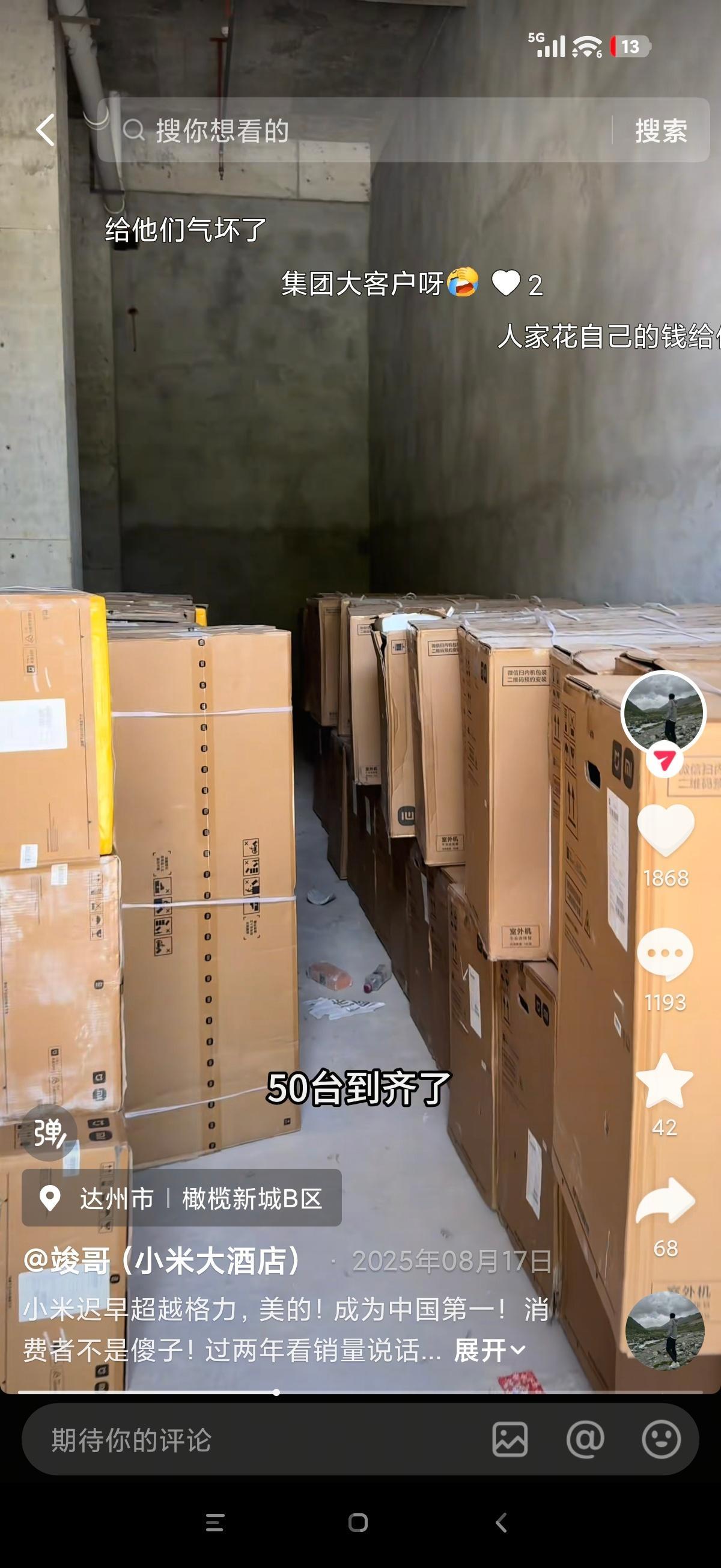 按照米粉消费排行,竣哥得坐雷总身边吧而且他是我见过最特别的米粉,从不直播带货也不挂小黄车赚粉丝钱,只买买买,而且为了支持小米,还为米粉开了一家小米大酒店,整个房间用的全是小米的产品,已经安装了小米的中央空调,甚至还有米家香氛机…… 雷总考虑下加盟吧以后去四川旅游,住酒店得是首选了