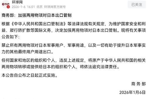 中国出手反制了!正在窜访的汉奸石平被狠狠的打了一记耳光!在我们通过军演发出震慑性消息,明确表示,我们绝不允许域外势力干涉我们的内政之后,没想到日本议员石平仍旧“顶风作案”,悍然窜访台湾。就在石平窜访当天,我们对日本进行反制。1月6日,我们商务部发表对日反制公告。 这一记反制重拳,时机选择得非常精准,完全不给人任何喘息的机会,直接在对方气焰最嚣张的时候泼了一盆冷水。 石平这个人,原本是中国人,后来跑去日本改名换姓,靠着攻击抹黑自己的祖国来博取政治资本,这种数典忘祖的行为早就被国人所不齿。 他既然选择当日本政客的马前卒,既然敢在台湾问题上踩红线,那就要做好承受雷霆反击的准备,我们这次的反击就是要让这种跳梁小丑付出代价。 商务部的公告虽然文字简练,但释放出的信号极其强烈,那就是谁胆敢在台湾问题上挑衅滋事,谁就必须承担经济层面的直接后果。 这次针对日本的两用物项出口管制,表面看是技术层面的调整,实则是对日本右翼势力插手台海事务的一次实质性警告。 很多日本政客习惯了打“台湾牌”,以为嘴上过过瘾、搞点政治作秀就能没事,这种幼稚的想法必须被打破,只有让他们感到疼,他们才会长记性。 石平之流之所以敢这么肆无忌惮,就是觉得干涉中国内政没有成本,甚至还能在国内捞取政治选票,我们就是要彻底打碎这种幻想。 控制两用物项出口,意味着日本相关企业在获取敏感原材料和零部件时将面临巨大困难,这对于高度依赖制造业的日本经济来说,打击是实实在在的。 我们既然出手,就不会是做做样子,这套管制措施背后有着强大的产业链支撑,足以在关键节点上卡住对方的脖子。 日本政府此前一直跟着美国的指挥棒转,对半导体设备出口实施各种限制,现在轮到我们反制,他们倒打一耙说我们“不符合惯例”,简直是荒谬至极。 国际通行惯例的前提是相互尊重,日本既然先破坏了规则,试图遏制中国发展,那就别怪我们行使正当的国家主权权利进行自卫。 石平这次窜访台湾,原本是想给岛内的“台独”势力打气,结果没等到掌声,反而等来了祖国大陆的雷霆手段,这无疑让他的行程显得格外讽刺。 岛内那些把希望寄托在外国干预势力身上的人,看到石平的下场也应该心里清楚,依附外部势力来对抗统一大计,最终只会招致更猛烈的暴风雨。 商务部选在1月6日这个时间点发布公告,就是要把石平的窜访行为和日本的切身利益直接挂钩,明确告诉日方:你的议员挑衅,你的国家买单。 这种连带责任的敲打,会让日本国内那些理性派力量对石平这种极端右翼分子产生不满,从而在他们内部制造矛盾和分歧。 我们处理中日关系,一向主张“以史为鉴,面向未来”,但这绝不意味着我们会对任何损害中国主权的行为视而不见。 石平作为一个华裔日本政客,本应发挥桥梁作用,却选择充当破坏两国关系的急先锋,这种人注定会被钉在历史的耻辱柱上。 这次反制措施不仅是对石平个人的回击,更是对所有试图干涉中国内政的外部势力的严正警告,红线绝对不能碰。 随着中国综合国力的不断提升,我们在经贸、科技等领域的筹码越来越多,手里掌握的牌也越来越好,完全有能力精准打击对手的软肋。 日本商界对于政府的这种鲁莽外交其实一直颇有微词,这次管制措施落地,必然会引起日本企业界对政府的强烈不满,进而倒逼日本政客调整政策。 我们不怕事,但也绝不惹事,只要各方尊重中国的核心利益和重大关切,互利共赢的大门始终是敞开的。 但如果有人执迷不悟,非要往枪口上撞,那我们手中的工具箱里还有 plenty of 工具,随时准备拿出来祭旗。 石平以为有了日本议员的身份就能狐假虎威,殊不知在绝对的国家意志面前,他不过是一枚随时可以弃用的棋子。 这次狠狠的一记耳光,不仅打在了石平的脸上,也打在了所有支持和纵容他的外部势力脸上,让他们看清楚谁才是这片土地真正的主人。 商务部后续肯定还会有具体的实施细则出台,这套组合拳打下来,足以让日本某些人清醒很长一段时间。 维护国家主权和领土完整,是每一个中国人的神圣职责,任何分裂国家的企图都必将遭到失败,任何干涉中国内政的行径都必将受到惩罚。 石平的窜访闹剧,最终以中方的强力反制收场,这再次证明了一个真理:犯我中华者,虽远必诛,何况是这种数典忘祖的汉奸走狗。 我们拭目以待,看看日本方面接下来还能玩出什么花样,不管他们怎么跳,都跳不出如来佛的手掌心。