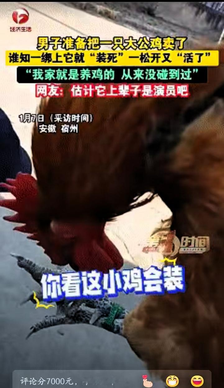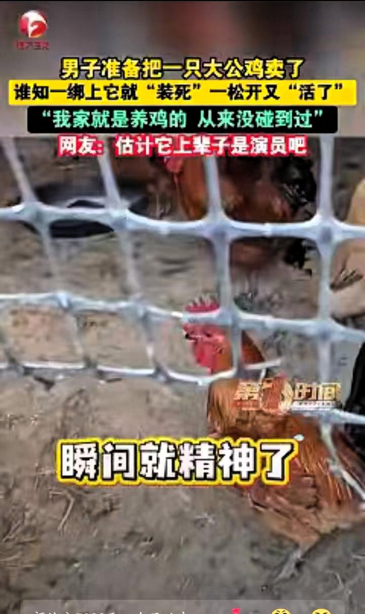 笑不活了!近日安徽宿州,男子准备卖掉家中养的大公鸡,没想到刚把公鸡提起来绑好 刚才还活蹦乱跳的家伙,瞬间身子软趴趴往下耷拉,脑袋垂着,眼睛也紧紧闭着,任凭王先生怎么摆弄,硬是一点反应都没有。 王先生当场就懵了,养了这么多年鸡,还没见过抓起来就“没动静”的。他琢磨着这只肯定不行,只能换一只,赶紧动手解开绳子。没想到绳子刚松开,这只看着没气的公鸡瞬间原地复活,扑棱着翅膀就往鸡圈里飞,落地后一溜烟躲起来,精神头十足,跟刚才那副蔫蔫的样子判若两鸡。 王先生觉得又好气又好笑,索性再把它抓起来试试。好家伙,这公鸡反应快得很,刚被提离地面,立马又恢复软趴趴的样子,一动不动装没气。王先生故意把它攥在手里没撒手,过了一会儿,就看见公鸡偷偷把眼睛睁开一条缝,小心翼翼打量四周,看到王先生还盯着自己,又赶紧闭眼装到底。 这下王先生彻底被这只公鸡的小聪明征服了,干脆把它放回鸡圈,重新抓了一只只会扑腾挣扎的公鸡去交货。 事后王先生把这段经历发到网上,逗乐了不少网友。有人说这公鸡太聪明,也有人感慨这年头连鸡都得靠脑子保命。其实这就是动物的生存本能,比起硬抗,它用装死的小技巧成功保住了小命,确实挺有意思。