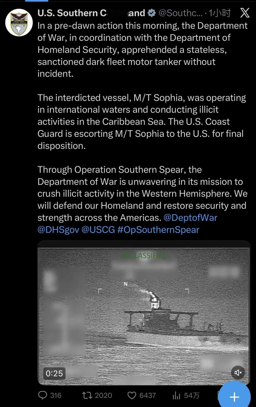 油轮事件!【美国宣称连扣两艘军事 油轮,其中一艘悬挂俄罗斯国旗,俄方要求美方确保油轮上俄公民受到人道对待,让其尽快返回祖国】俄罗斯外交部7日表示,俄方正密切关注有关美国军方人员登上悬挂俄国旗的“水手”号油轮的相关报道,要求美国确保“水手”号油轮上的俄公民受到人道对待。美国东部时间7日8时43分,美国欧洲司令部在社交媒体上发布消息称,在北大西洋扣押一艘油轮,据称这艘船悬挂了俄罗斯国旗。约半小时后,美国南方司令部在社交媒体上发布消息称,在国际水域扣押一艘无国籍油轮。两船均与委内瑞拉有关。美国欧洲司令部当天在社交媒体上说:“美国司法部和国土安全部在与战争部的协调下,当天宣布扣押了‘贝拉1’号油轮,理由是其违反美国制裁。该船被美国海岸警卫队‘芒罗’号追踪后,在北大西洋海域被扣押,依据是联邦法院签发的逮捕令。”美国欧洲司令部1月7日发布在社交媒体上的照片显示,一名美国海岸警卫队官员使用望远镜查看“贝拉1”号油轮。美国欧洲司令部1月7日在社交媒体上发布的消息称,美国当天扣押“贝拉1”号油轮。 美方匿名官员告诉路透社,试图扣押这艘油轮的行动由美国海岸警卫队和美军执行。行动发生时,俄罗斯舰艇包括一艘俄罗斯潜艇就在附近海域。据美联社报道,7日早些时候,该船位置在苏格兰与冰岛之间,正向北航行。有报道称,“贝拉1”号油轮在2025年12月曾被美国海岸警卫队追赶,其间这艘油轮在船身涂上俄罗斯国旗图案,改名为“水手”号。该油轮原计划在委内瑞拉装载石油,但由于美国封锁未能靠岸,目前处于空载状态。