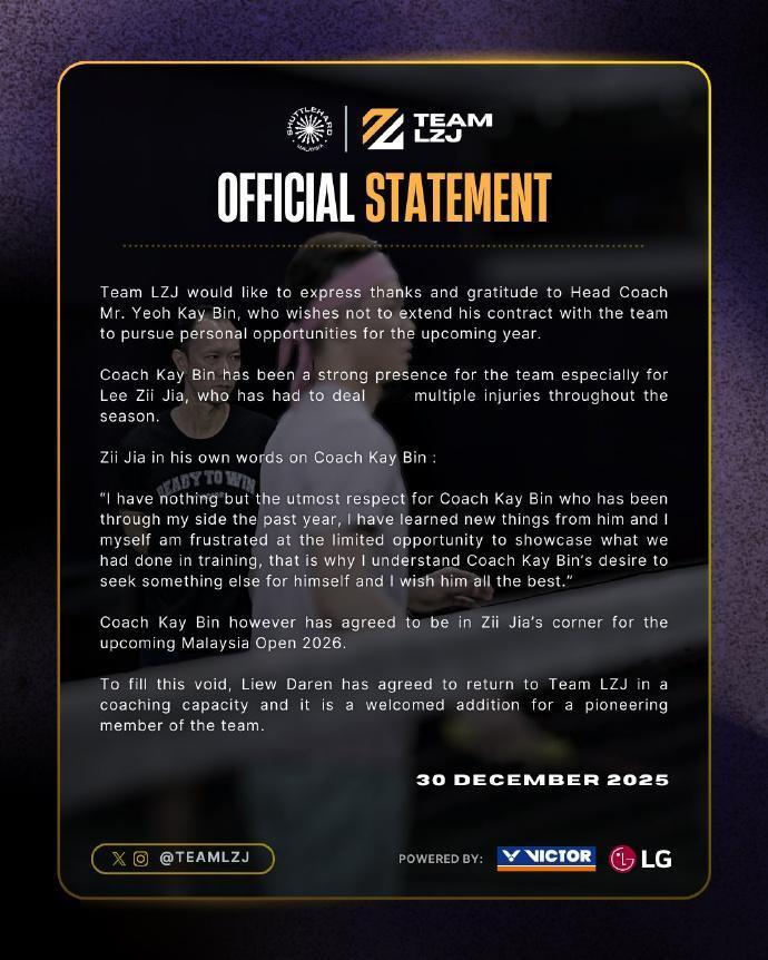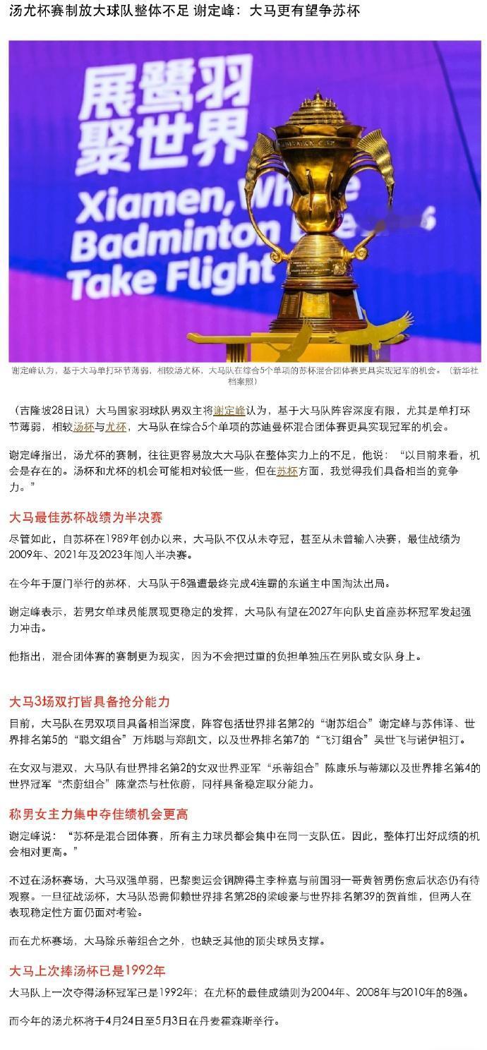 大马的羽毛球,场外八卦比场内比赛精彩多了 有谈恋爱的 苏伟译官宣恋情,大马羽毛球史上第一位世锦赛男双冠军,足以写进历史的。妹纸很漂亮,恭喜咯 有说苏杯有希望争冠的 汤尤杯赛制放大球队整体不足,谢定峰:大马更有望争苏杯。他可能是在刚喝完小酒以后说的,中国队默默不语,韩国队直接表示:你算老几? 李梓嘉团队发文 杨佳傧不再担任李梓嘉主教练,刘国伦将在大马公开赛后接替主教练一职。 小李起点很高,被认定老李接班人。没想到脑后有反骨,只想做小李,退出国家队成自由人。如今有些唏嘘,感觉他有些迷茫