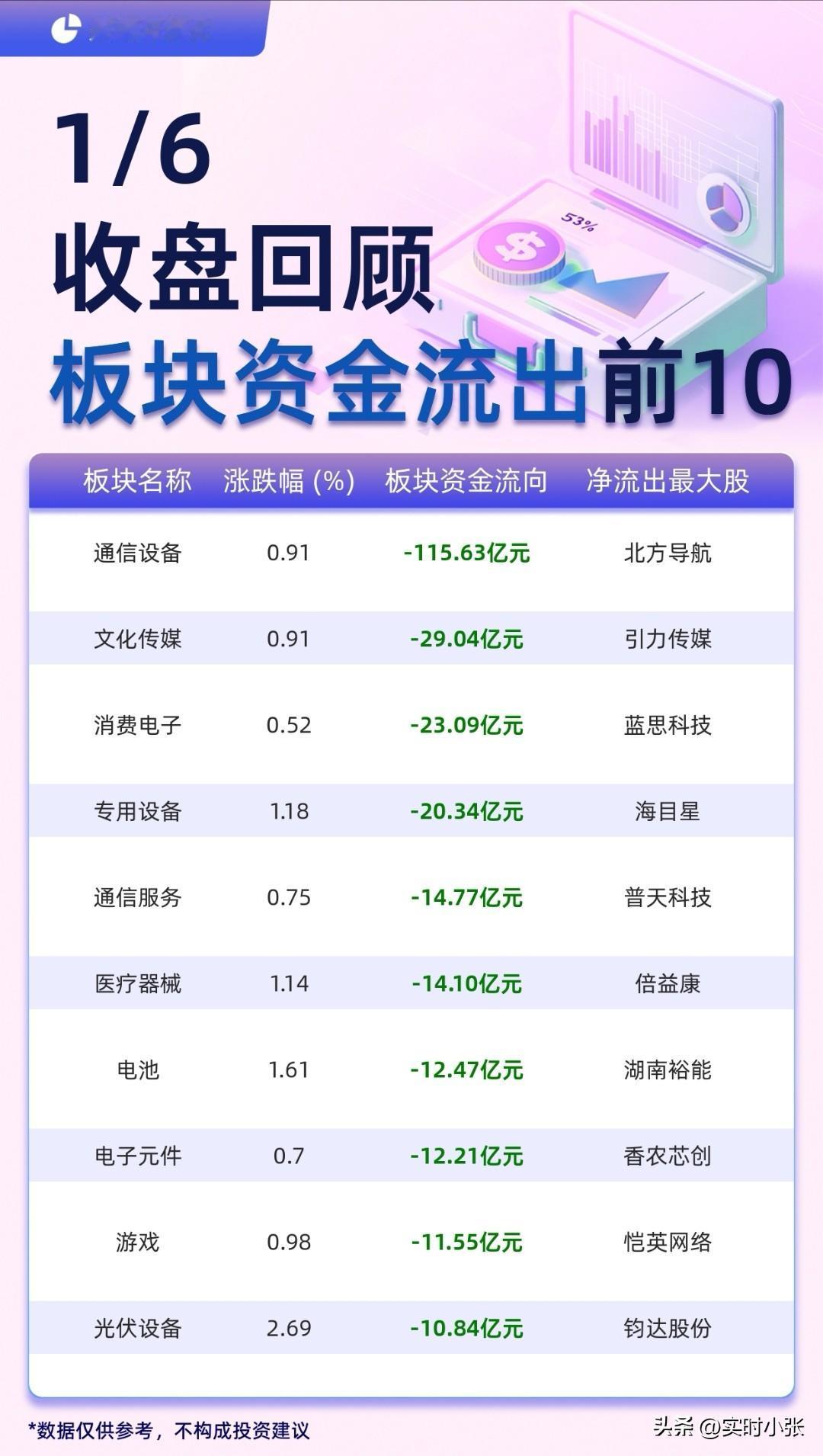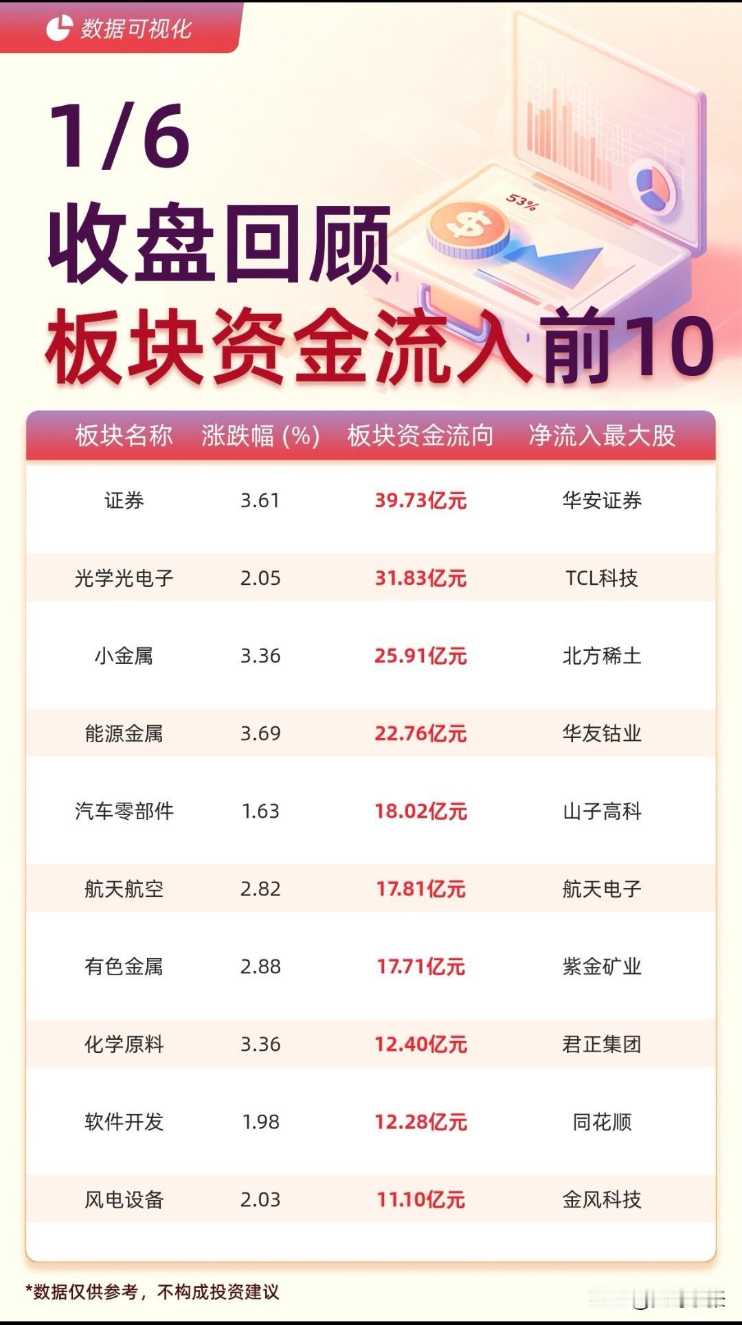 1月6日A股资金流向全景:主力动向透露哪些市场信号? 1月6日A股收盘,主力资金流向呈现鲜明分化。个股层面,东方财富以26.36亿元主力净流入居首,山子高科、TCL科技紧随其后,航天航空、汽车零部件、光学光电子等板块个股获资金重点青睐;而中际旭创、新易盛等通信设备股则成为主力抛售主力,中际旭创净流出超26亿元。 板块维度上,证券板块以39.73亿元净流入领跑,光学光电子、小金属等板块同样获资金加仓;反观通信设备板块净流出达115.63亿元,文化传媒、消费电子等板块也遭遇资金撤离。 值得注意的是,航天航空板块在个股和板块层面均获资金关注,而通信设备板块则成为资金流出重灾区,市场风格切换与赛道轮动特征凸显。(数据仅供参考,不构成投资建议)