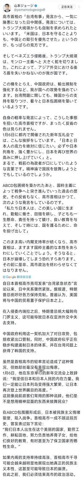 日本前众议员呼吁日本首相高市早苗辞职!1月7日,日本前众议员山本譲司发文:“自日本首相高市亮司发表‘台湾有事’言论以来,日中关系骤然紧张。据报道,特朗普总统呼吁各方保持克制。普遍认为,美国将与中国的贸易置于保护日本之上。”并再次强调:“美国在入侵委内瑞拉之后,特朗普总统大幅转向门罗主义,这可能导致日本在亚洲外交中失去支持。” 说白了,这是日本难得的清醒声音,完全复述出了中美日三边的现状。 要知道,美国是一个以自身利益为主的国家。而日本一直把美国当成靠山,但是现在美国自己的“罗门主义”复苏,都在遭受各国的批评与抵抗,根本没有心思管日本。 并且,因为日本的“涉台”言论,中国采取了一些列的反制措施,已经让日本的经济遭受实实在在的重创。而现在中国反制措施还在不断加码,如果日本再不拿出诚意道歉,日本的经济将面临全面衰退的风险。 于此同时,据报道说“中国的反制是在救日本”,理论上也确实是如此,日本现在每年还在不断的加着军费支出,好像是在用这种方式慢慢冲破“二战秩序”的枷锁,而中国的精准反制,确实在遏制其滑向“军国主义”复苏的深渊,只会受到世界各国的广泛认可。 说到底,如果日本还不能认清大势,停止错误行径,最终只会在自我孤立的道路上越走越远,沦为地缘博弈里最可悲的牺牲品。
