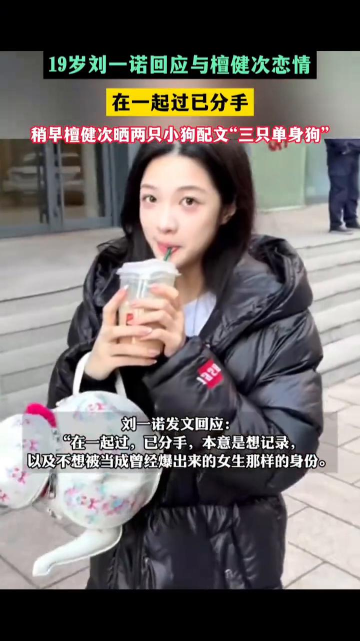 19岁刘一诺回应与檀健次恋情,在一起过已分手。 稍早,檀健次晒两只小狗配文"三只单身狗"。1月7日,刘一诺与檀健次恋情传闻曝光,近日女方在社交平台晒出多张图片,其地毯衬衫被指与檀健次Mv场景及私服同款。 刘一诺发文回应:"在一起过,已分手,本意是想记录,以及不想被当成曾经爆出来的女生那样的身份。稍早,檀健次发布自己和两只小狗的视频,檀健次,1990年10月5日出生于广西壮族自治区北海市,中国内地男演员、歌手、舞者。代表作品有《猎罪图鉴》《长相思》《很想很想你》《四方馆》等。