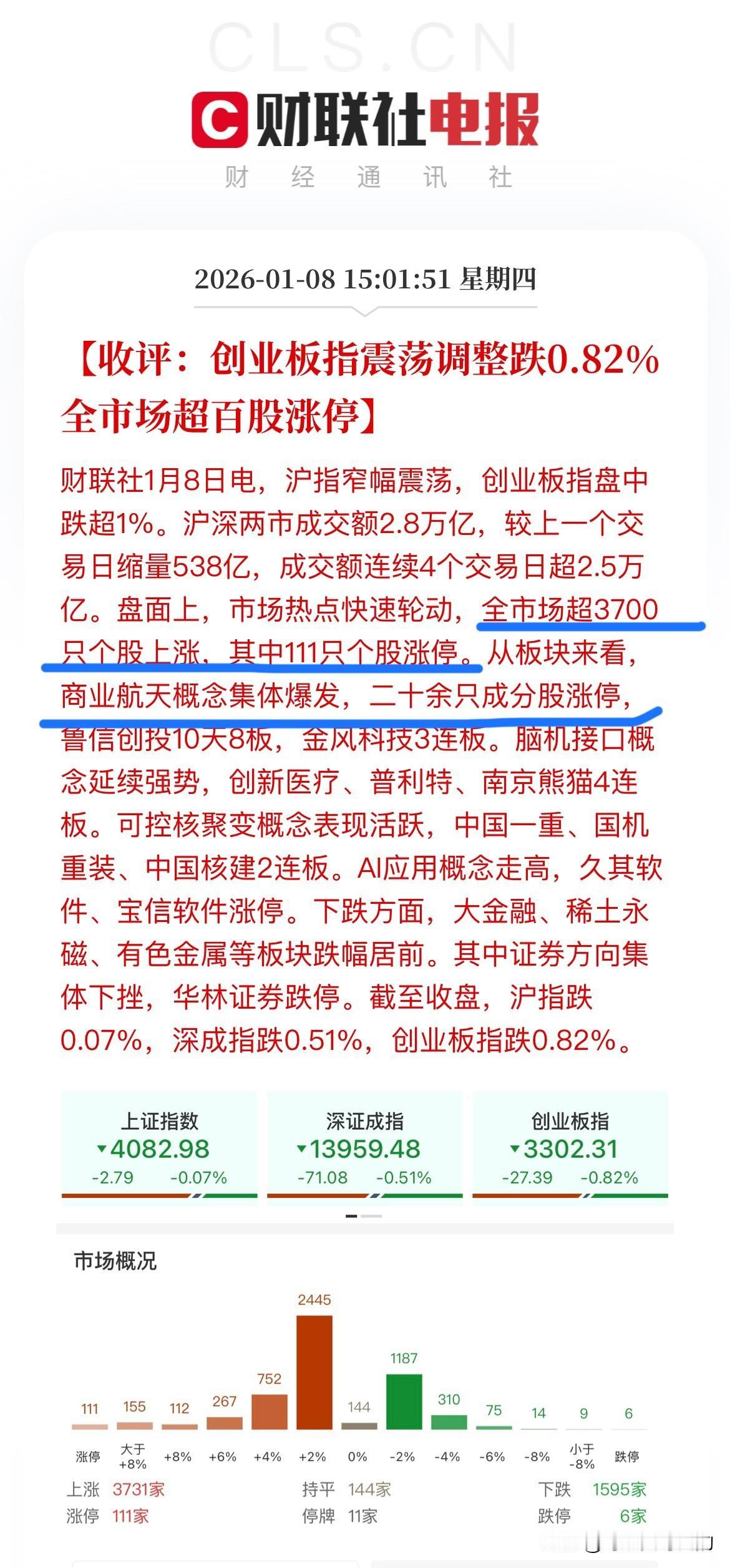 大盘今天终于绿了,止步14连阳! 不过虽然今天大盘绿了,但是大多数人应该是高兴的吧,毕竟今天还有3700多家上涨,仅有1000多家下跌! 既然3700家上涨大盘还能绿,那就只能是大盘股跌了。前几天联手拉动大盘的券商和保险成了今天压指数的主力军,两个板块均跌超2%,保险方面中国平安大跌4.18%,中国人寿下跌2.33%,券商方面华林证券早早就跌停了,华泰证券大跌5%! 今天商业航天仍然是YYDS,虽然总龙头航天发展因为绕异动的关系今天没有表现,但是又有其他人接棒涨停带动商业航天板块继续起飞,整个板块有20多只个股涨停,其中乾照光电20cm涨停,鲁信创投6天5板,金发科技3连板! 总之如今的商业航天不缺龙头,只要有人站出来当大哥,那么商业航天应该就还能继续起飞! 不过大盘可能就没有那么好了,因为但凡券商和保险能少跌一点点,大盘就能迎来15连阳,可惜他们没有这么做。所以意图很明显,指数短期不能再继续大涨了,因此还是重个股轻指数吧!