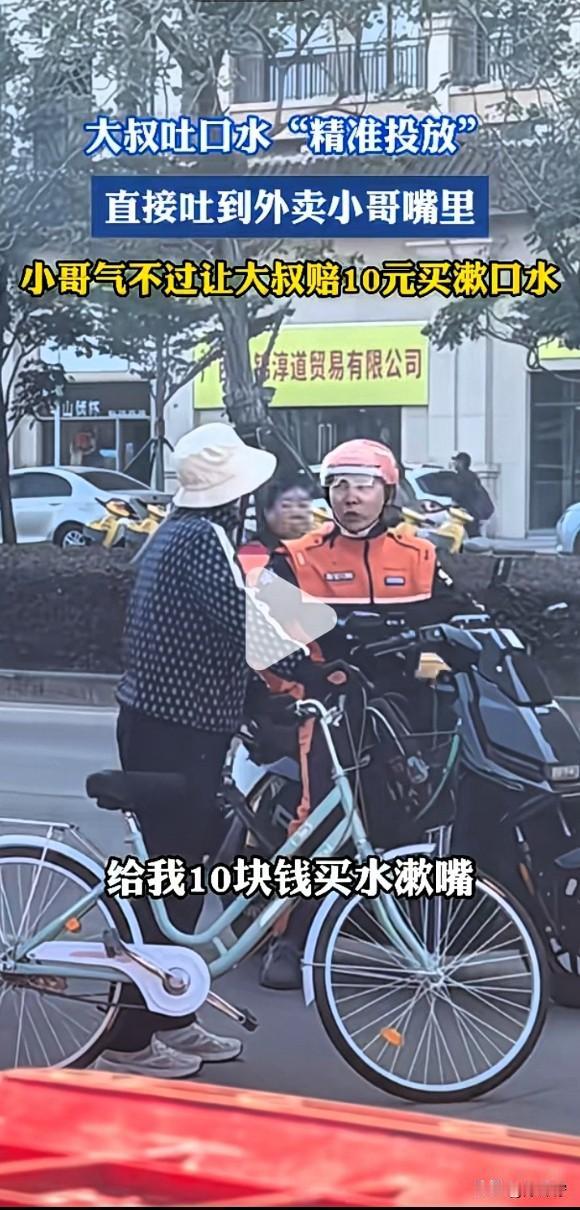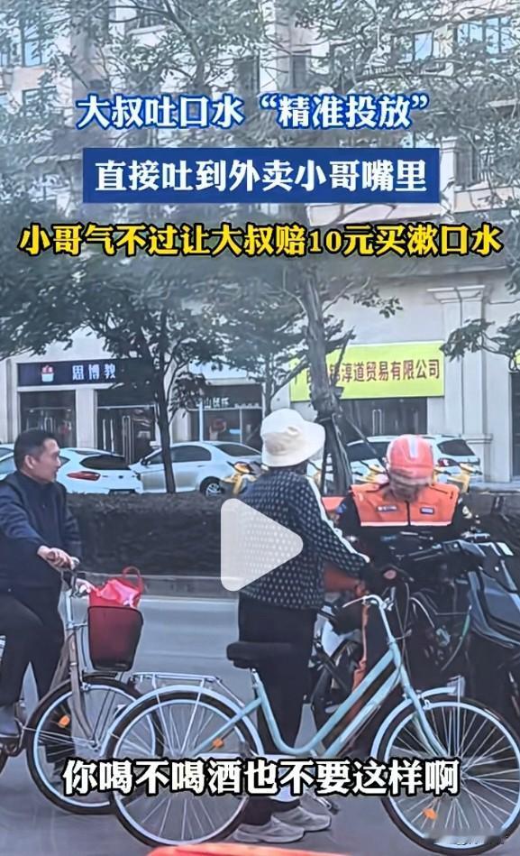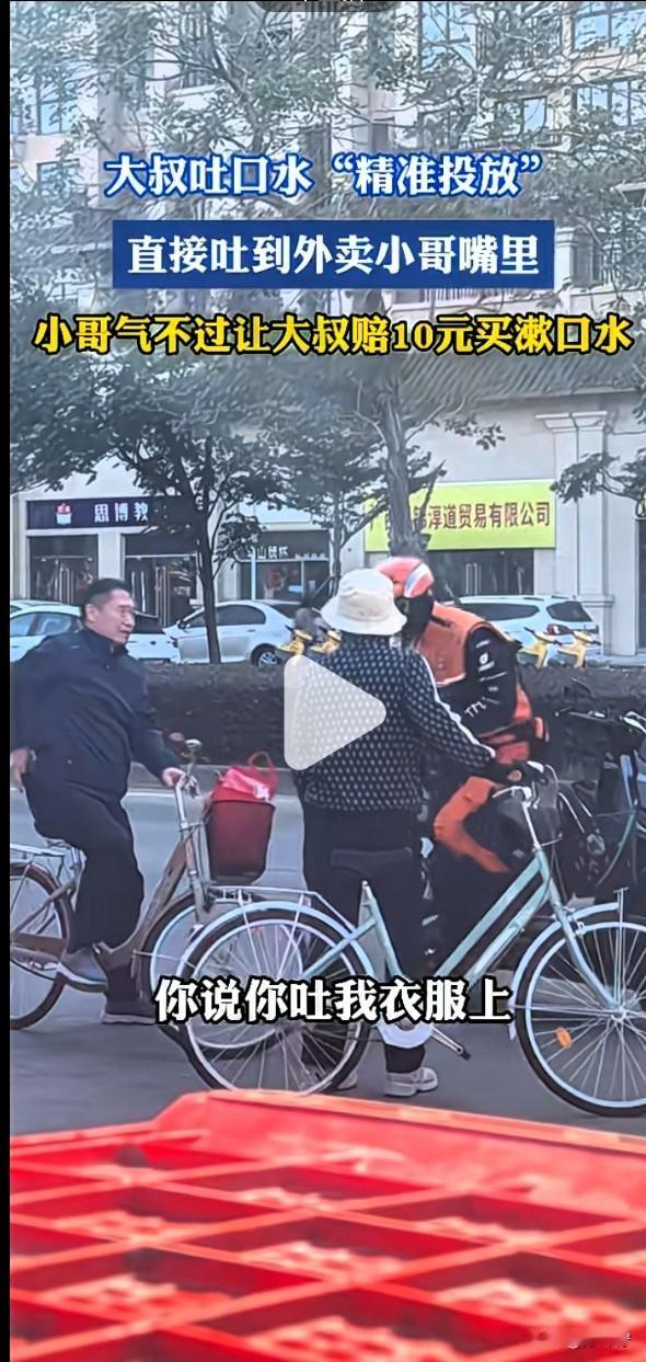 刚刷到一视频,给人都看麻了!一个大叔边骑车边吐口水,好巧不巧,精准吐进了旁边外卖小哥的嘴里!人在车上坐,祸从天上来。 事后大叔说自己是喝了酒才这样,小哥当场就怼回去了:“你就是吐我衣服上,我也懒得计较,但是你吐我嘴里,这算怎么个事儿!你喝不喝酒也不要乱吐口水啊”! 小哥也是实在人,就让大叔赔了10块钱买瓶漱口水,这要求真的一点也不高,就是难为自己被膈应得直呕!换谁被吐嘴里都得被恶心好几天。 别说外卖小哥只是想要点补偿,就算是要个郑重的道歉,那也是应该的! 公共场合这种行为也太掉价了!乱吐口水本就不文明,还别说吐到人嘴里,不仅没素质,更是不道德! 有网友说小哥太好说话,换自己肯定要报警讨说法,也有说多一事不如少一事的,10块钱赶紧脱身算了!遇到这种事,真的是会被气炸。 要是你是外卖小哥会怎么做? 不文明行为