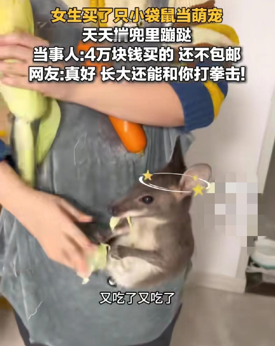 谁看了不傻眼啊! 陕西一女孩瞒着家人花4万买只袋鼠,妈妈回家瞅见客厅里蹦跶的稀罕物,当场愣住,压着震惊灵魂拷问:“你一个月挣多少钱?花4万买这玩意儿,咱还过不过日子了!” 女孩抱着袋鼠眼神躲闪,她刷短视频迷上袋鼠,没琢磨收入和饲养条件,就想图个“独一无二”的新鲜。 4万可是全家一年积蓄,她月工资才几千,除去房租生活费剩不下多少,更别提袋鼠后续要专业照料、宽敞空间,饲养成本就是无底洞,而且私人养袋鼠还可能不合法。 这哪里是养宠物,分明是被一时冲动和跟风心态冲昏头,把家庭重担抛在脑后。 妈妈没吼没骂摆事实讲道理,才最戳人。你身边有没有见过这种脑子一热的冲动消费?评论区唠唠!