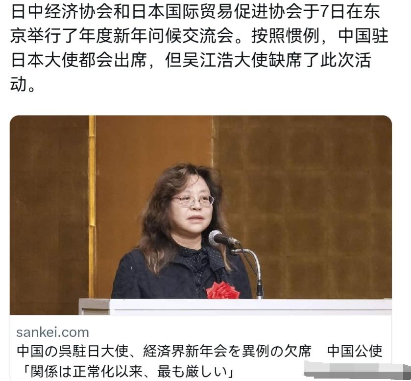 极不寻常!中方降格出席!中国驻日大使罕见缺席日方新年问候交流会! 1月7日,根据日媒报道,日媒称,日中经济协会和日本国际贸易促进协会于7日在东京举行了年度新年问候交流会。按照惯例,中国驻日大使都会出席,但这一次吴江浩大使却缺席了。 要理解吴江浩大使首次缺席日中经济协会与日本国际贸易促进协会联合新年问候交流会的深层含义,首先得搞清楚这个惯例背后的分量。 自日中经济协会1972年成立后,相关新年交流活动逐渐成为中日经济界乃至两国关系的重要沟通窗口,中国驻日大使出席更是延续了数十年的惯例,从程永华大使到吴江浩大使,此前从未有过缺席记录,2025年1月吴江浩大使还曾亲自出席并致辞,与近400名中日政经人士交流,足见这个场合在中日交往中的标志性意义。 如今这个惯例被打破,日本方面觉得不正常实属正常,但他们更该明白,这种“不正常”的背后,是中方对当前中日关系真实状况的精准表态,绝非一时兴起。 一切的转折点都绕不开高市早苗11月7日发表的挑衅言论,这并非空穴来风的指责,而是有明确后续交涉记录佐证的事实。 就在高市早苗发表不当言论后不久,11月18日中方就主动迈出沟通的步子,由外交部亚洲司司长刘劲松在北京与日本外务省亚大局局长金井正彰举行磋商,把话摆到台面上严正交涉,明确指出这些谬论严重违反国际法和国际关系基本准则,违背一个中国原则和中日四个政治文件精神。 从根本上损害中日关系的政治基础,要求日方收回错误言论、实际行动认错纠偏。 这已经是中方给出的明确机会,相当于把台阶递到了日本面前,可从后续发展来看,日方显然没有接住这个台阶,更没有拿出足以修复信任的实际举措。 更值得玩味的是,中方的克制和耐心远不止一次交涉,面对日本经济界此前提出的2026年1月联合访华请求,中方也只是保持观望未直接拒绝,这种“已读不回”的态度本身就是一种缓冲,是希望日本政府能看清形势、主动纠偏。 要知道,日本经济界对中日经贸合作的依赖度不低,2024年1月日中经济协会曾组织180人的庞大代表团访华,这是新冠疫情后时隔4年多的首次,足以说明中日经济利益的深度捆绑。 中方即便在关系紧张时,也没有直接切断经济交流的渠道,这已经是留足了情面,可日本政府似乎完全无视这种善意,反而放任破坏中日关系基础的言行持续发酵。 这也就不难理解为何中方会以打破惯例的方式传递态度,毕竟外交礼仪从来都是双向的,对等尊重是基本前提。罗晓梅公使在交流会上直言“对中日关系正面临建交正常化以来最艰难的局面深感遗憾”,这句话绝非空泛的感慨,而是有实打实的现状支撑。 有专家早已指出,当前中日间的情绪和冲突程度已经超过了此前的小泉时代,而这一切的根源都在日方。 从罔顾中方反对的各类不当言论,到未能对中方的严正交涉给出有效回应,日本政府的一系列操作不断消耗着中日之间本就脆弱的政治互信。 中方此前一直以大局为重,维持着包括大使出席新年交流会在内的各类沟通惯例,这本身就是一种积极的信号,但这并不意味着中方会无底线容忍损害自身核心利益的行为。 说到底,大使缺席并非要彻底切断中日交流,而是一种精准的态度表达,相当于用最直接的方式告诉日本方面:中日关系走到今天这一步,责任不在中方,中方给过修复的机会,但机会不是无限的。 日本方面与其纠结于大使缺席是否正常,不如好好反思一下自高市早苗发表挑衅言论以来,到底有没有拿出真正解决问题的诚意和行动。 毕竟,外交惯例的存在是建立在相互尊重的基础上的,当一方不断破坏这种基础,另一方自然会做出相应的调整,这种调整与其说是反常,不如说是对当前中日关系最恰如其分的精准定位。