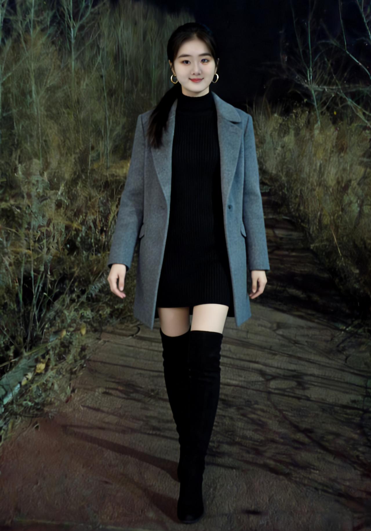 河畔寒灯映素冰,佳人衣袂惹霞升。 纵然朔气凝千丈,难掩玉足踏雪行。
