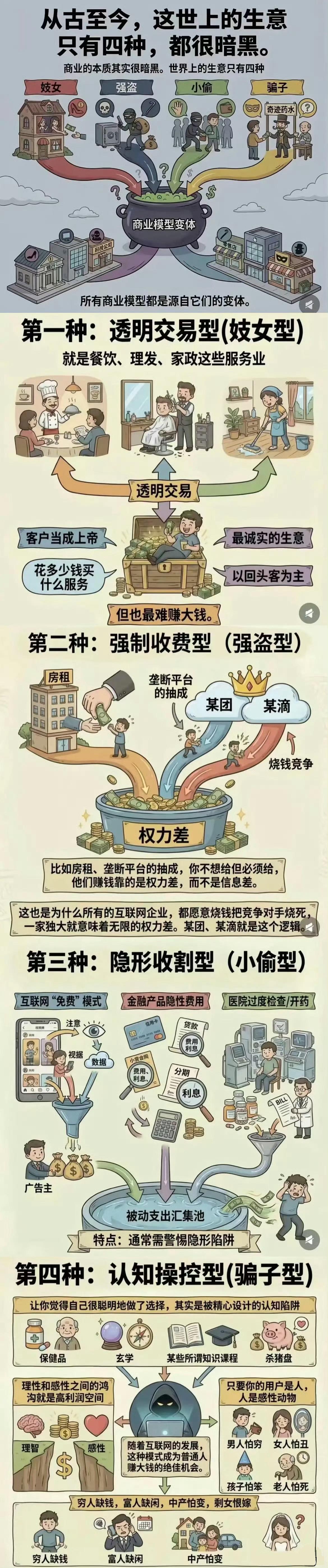 白瓤无籽瓜 2 2026-01-09 13:47 实体经济呢?卖产品呢?除了这四个还有很多买卖啊。[狗头] 白瓤无籽瓜 回复 落下 01-09 16:58 标题可不是这么写的呀,说是生意只有四种呀,是不是太片面了。 落下 回复 01-09 16:44 他这说的明显是服务业,不包括实体经济