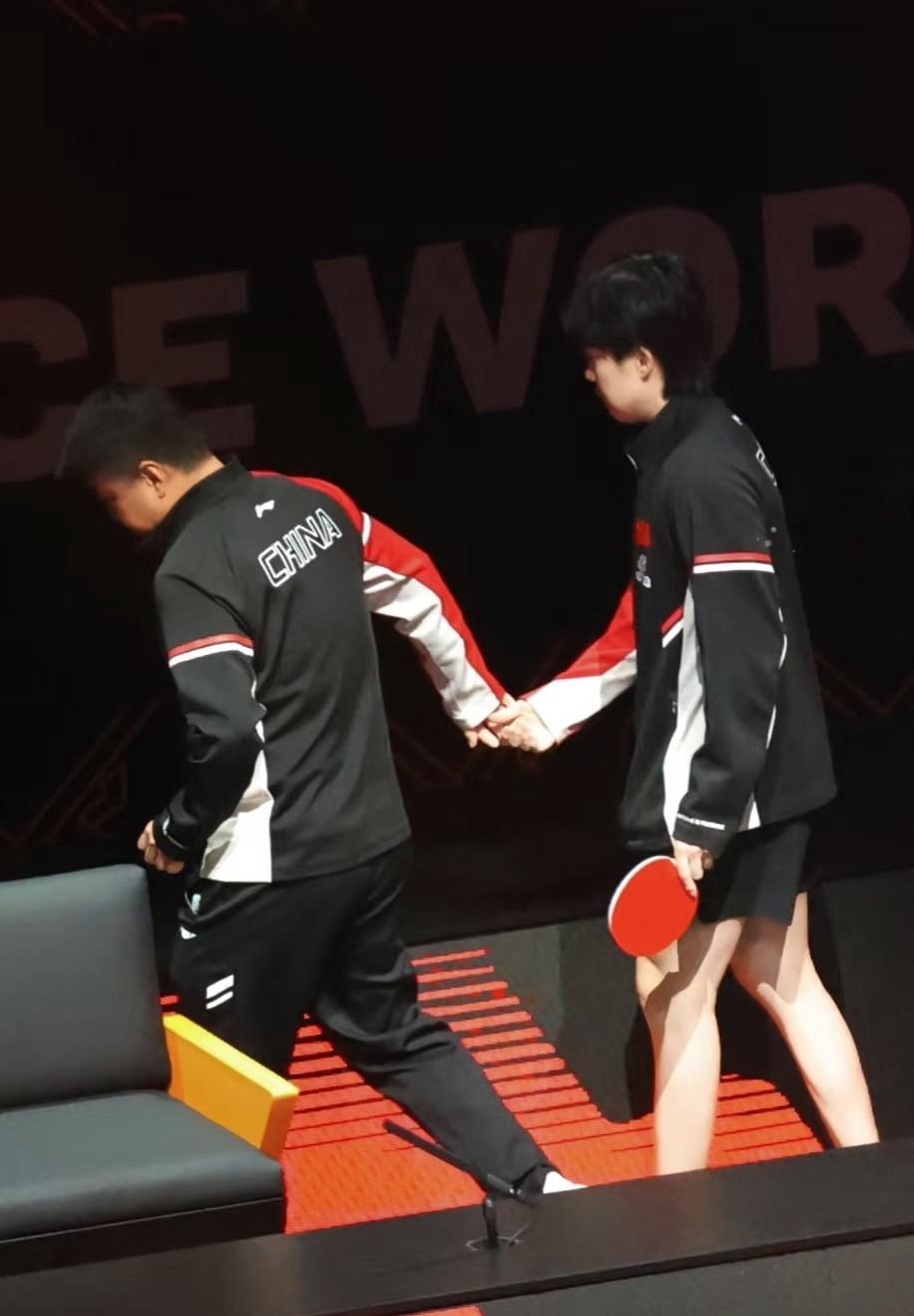 王楚钦在巴黎奥运混双退赛后,独自坐在场边低头抹泪的那一刻,王皓指导没有一句责备,只默默走过去,伸手轻轻按住他的肩膀,让他靠在自己怀里。 那一幕安静得几乎听得到心跳,却比任何金牌都重。赛场灯光刺眼,观众喧闹退去,只剩师徒两人,王皓的手掌稳稳落在王楚钦后背,像父亲在告诉孩子:我在这里,别怕。 这份陪伴来得自然,却不是偶然。王楚钦这些年把所有力气都砸在球台上,早起晚归,伤了忍着,输了咬牙,从不抱怨一句苦。正是这种近乎固执的认真,换来了教练们毫不保留的疼爱。肖战指导对他严厉到近乎苛刻,每一句训斥都带着火,却也带着父亲般的期望;白告指导则细致入微,赛前赛后嘘寒问暖,像母亲一样把他的饮食作息一一记在心上。两份爱,一刚一柔,全落在这个倔强的年轻人身上。 王皓懂他的苦,更懂他的心。退赛那天,王皓没有问为什么,也没有急着分析得失,只是陪着他坐到更衣室灯光熄灭。懂的人,不必多言,一个动作就够。王楚钦后来在采访里说,那一刻他突然明白,原来自己从来不是一个人在打球。 真心换真心,从来不是空话。王楚钦用汗水和坚持,赢得教练们最纯粹的守护;而教练们用陪伴和信任,帮他一次次跨过低谷,站上更高领奖台。这份情分不张扬,却足够深沉,足够长久。它让王楚钦在最崩溃时仍有依靠,也让他在巅峰时懂得谦卑。 这样的师徒情,像一团火,烧得安静,却暖得持久。愿它一直烧下去,照亮彼此,也照亮更多后来人。