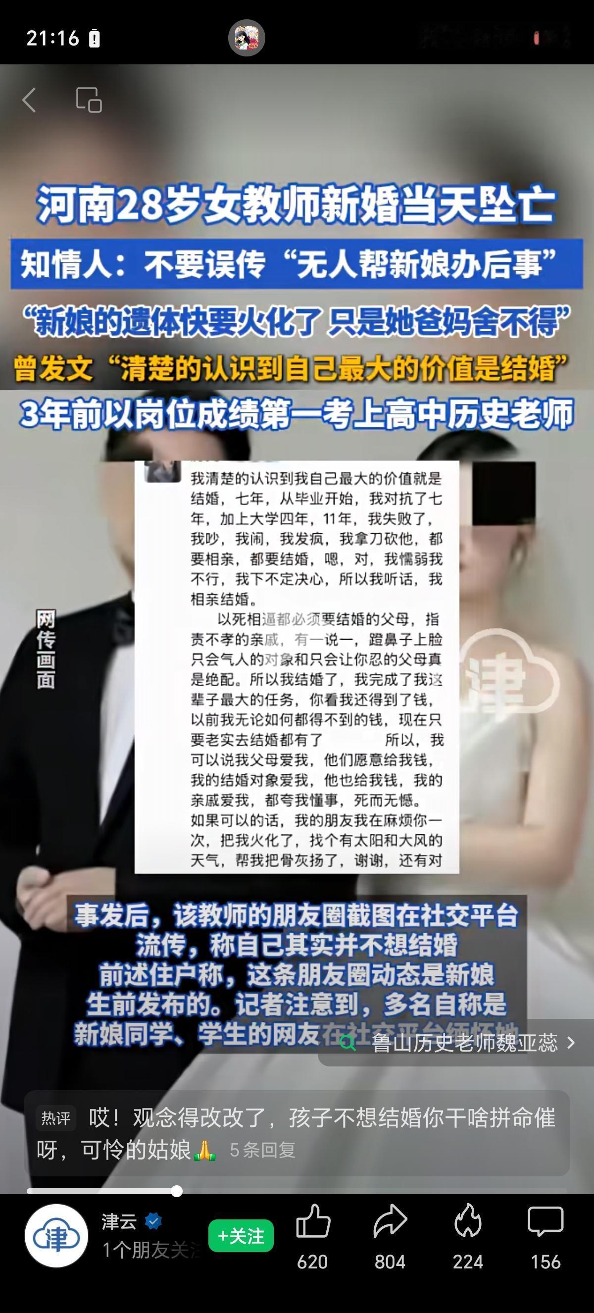 如何看待鲁山28岁女教师婚礼当日跳楼? 网传某地某位女性婚礼当天坠楼身亡 死前发的朋友圈 ------------------------------------ 我之前就说现在中国未婚女性欠债问题,还被404了。 按照,魏母的说法,彩礼给了魏女士,不存在钱被父母控制给哥哥办婚姻的可能。工资没拿。 钱去哪儿了? 大概是还提前消费了。