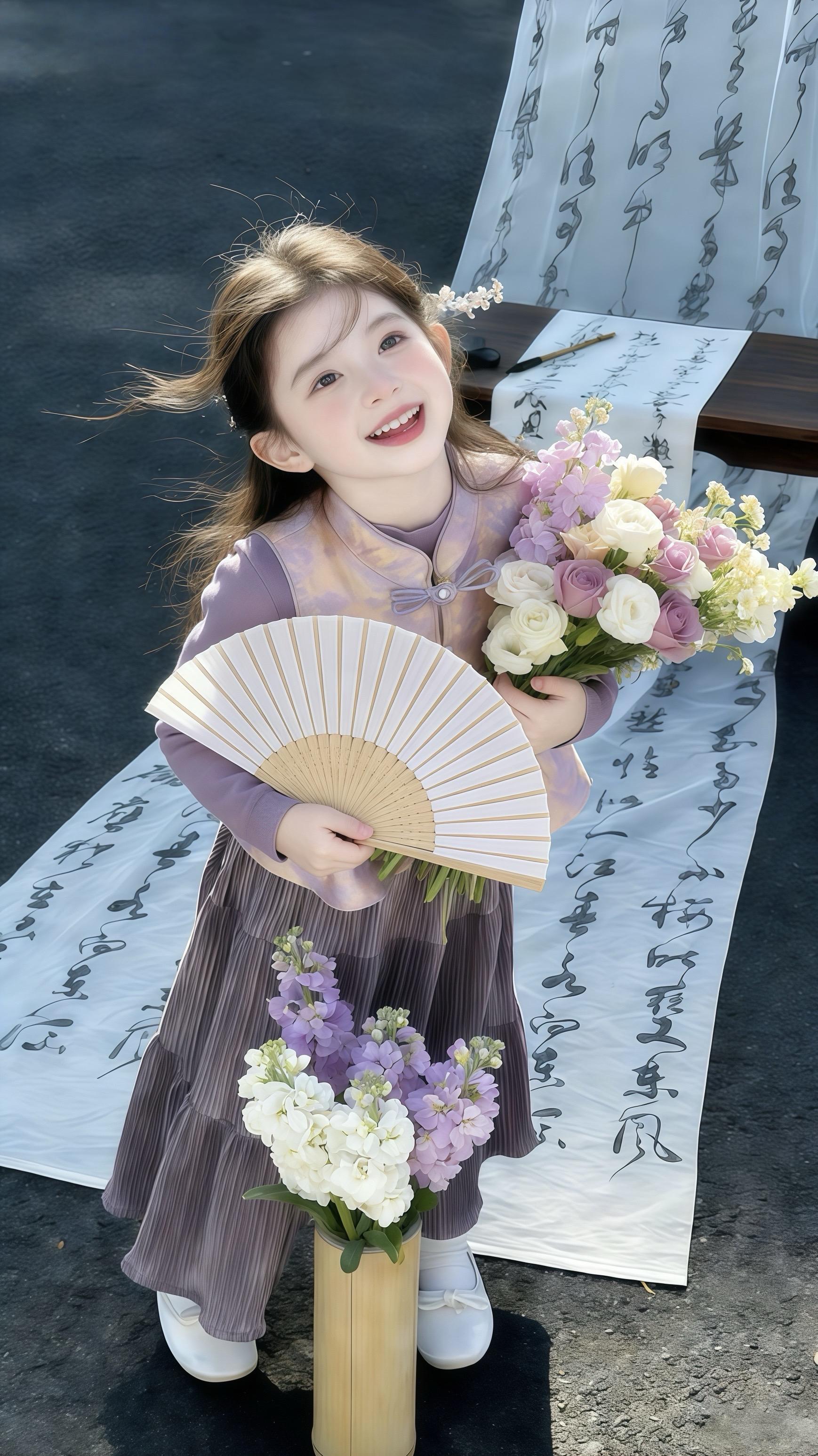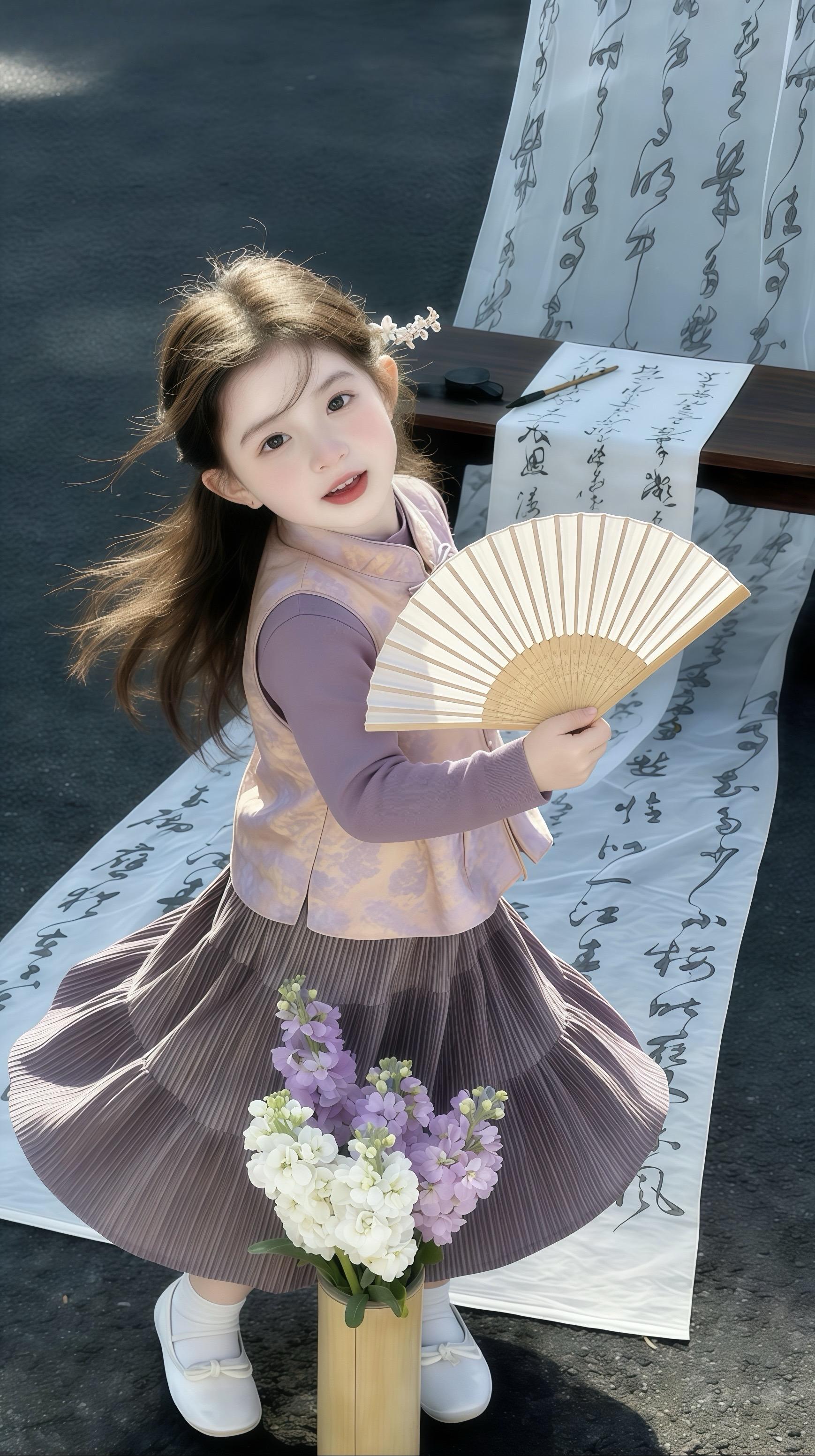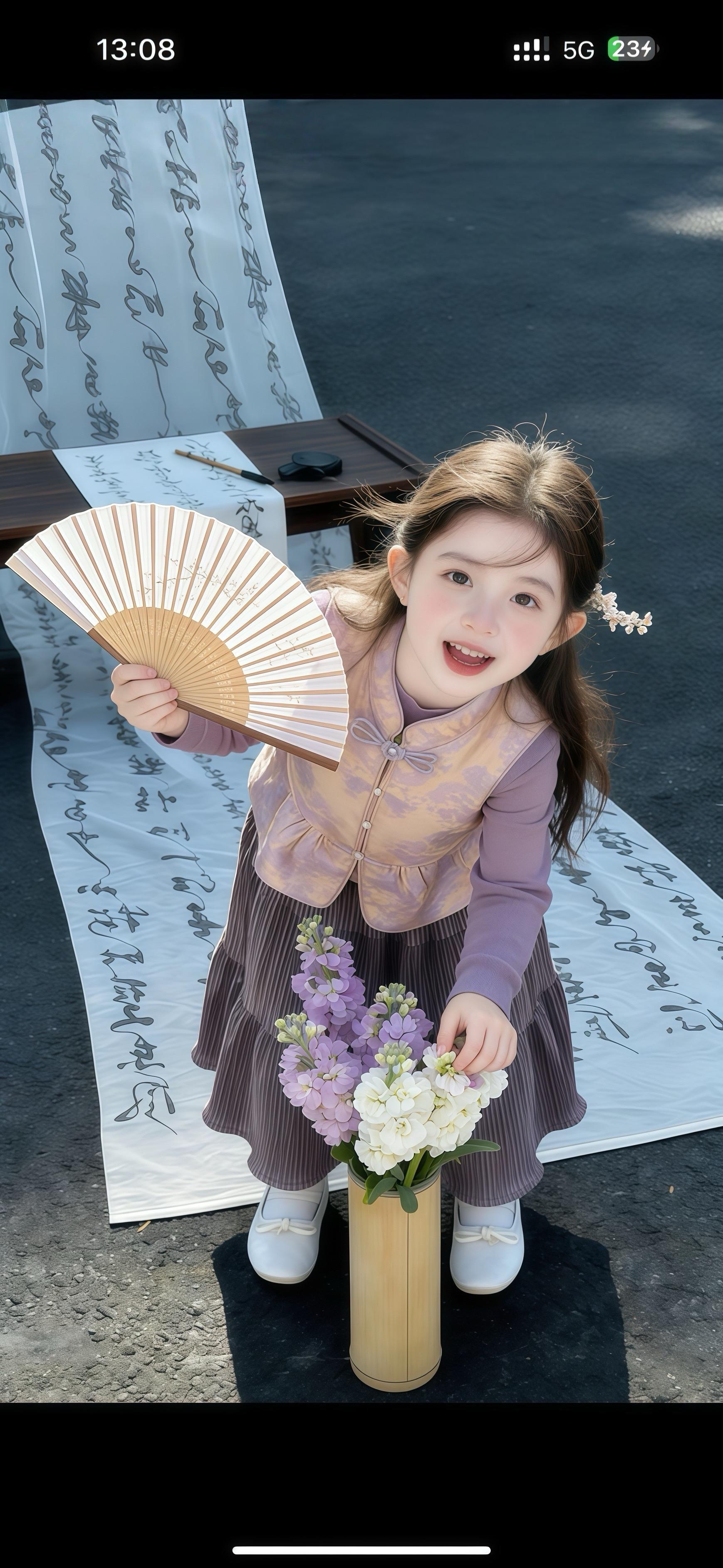 谁能拒绝这套仙气满满的女童新中式套装!温柔的香芋紫调调,渐变提花马甲搭配百褶裙,国风韵味拉满,女宝上身超灵动,软乎乎的面料亲肤又舒服,冷白皮穿更显白嫩,新年走亲访友、拍照打卡穿它,妥妥的国风小萌娃~
