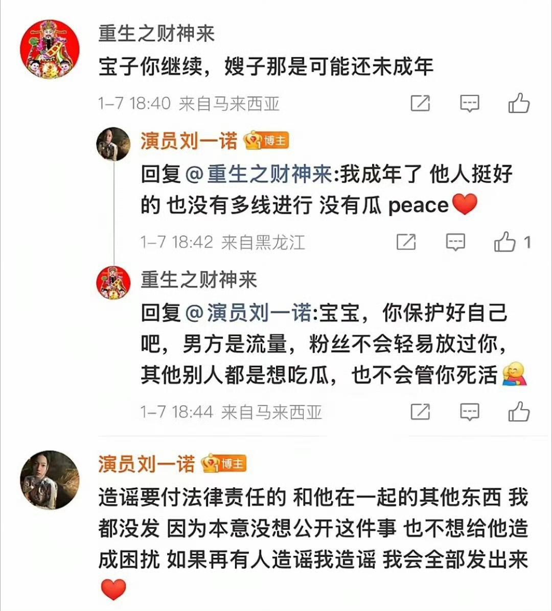 刘一诺回应恋情风波,舆论走向已不受控 演员刘一诺针对网传恋情争议作出回应,直言自己已成年、男方并无多线发展且无瓜可吃,还强调造谣需负法律责任,透露本无意公开此事,不想给对方造成困扰。 但如今事态早已脱离她的掌控:热搜居高不下,显然有背后力量推波助澜。 即便她做出了澄清,仍深陷舆论中心,这份原本想用来博热度的话题,最终反倒成了难以摆脱的困扰。