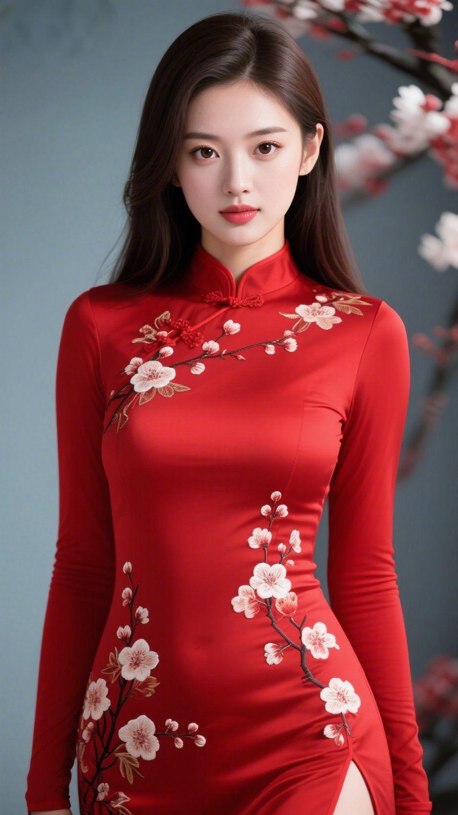 红袍绣梅凝雅韵 灰蓝背景晕着梅枝的疏影,将一袭正红旗袍衬得愈发明艳。旗袍的缎面莹润如凝脂,梅枝刺绣顺着衣身舒展,花瓣的白与蕊的红层次分明,鲜活得像在枝头漾着暗香。立领的红珠盘扣小巧精致,与刺绣相映成趣,添了几分中式美学的细腻。 乌发垂落肩头,发丝的柔与旗袍的雅相融,她抬眸时,眼眸如澄澈的清潭,眉眼间漾着东方女性独有的温婉。梅与红的搭配,将传统旗袍的风骨与梅花的清雅揉成具象的模样,让中式服饰的韵味在光影里缓缓流淌。 原来中式之美从不是刻意的雕琢,而是这般让针脚藏诗意、色彩蕴风骨,在红袍与梅绣的交融里,绽放出跨越时光的优雅,让人沉醉于传统美学的独特魅力中。 红梅刺绣旗袍