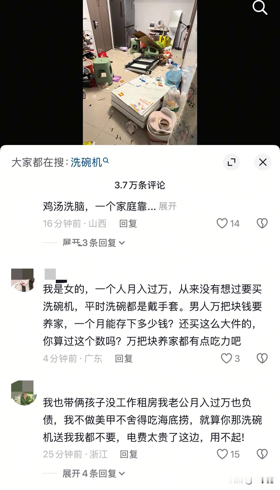 热搜上的洗碗机砸家事件,为什么很多女性也无法共情当事人?原因很简单,不是1519元的洗碗机买不起,而是她们的实际情况决定的。 表面看来,女子丈夫工资有1万多,买台洗碗机也不算什么大头消费。那为什么她的丈夫就崩溃了呢? 这就不得不提一下她们家目前情况了。 她们家一家四口在广东租房居住。女的带2个孩子,目前没有工作,男的底薪8000元,每个月加起来应该有1万出头。另外,家庭还欠外债20万左右。 在大城市而言,一万多的工资不算高。除去租房、养孩子、生活费算下来之后,基本所剩无几。这就意味着,女子丈夫的经济压力其实还挺大的。 根据这情况,我个人站在一个女性的理性角度来分析,也认为这个洗碗机不是非装不不可。 其一:他们还是租房子住,并不是自己家中的房子。一旦工作调动就需要搬家了,到时候不方便带走。 其二:他们家庭还欠着那么多外债,能省一点是一点。20万不是一笔小数目,以她们的收入来看,全家人不吃不喝也得2年才能还清。 女子买的洗碗机打完折1519元,这个价格其实并不贵。对于很多家庭来说,少出去吃两顿饭也就省回来了。 但对于一个独自养家、需要租房子、还有20万外债的男人而言,也确确实实不算理性的消费。 女子丈夫之所以崩溃,不仅仅是因为这个1519元的洗碗机,还有长久积累的压力。当事情叠加到一起之时,便彻底爆发了。 其实,夫妻之间要把日子过好,需要的不是轰轰烈烈,而是懂得去体贴双方的不容易! 在这个事情里,没有谁对谁错,有的只是相互的不理解! 丈夫赚钱不容易,妻子带孩子也辛苦。 事实上,水凉可以想办法安装热水器解决,妻子不想洗碗,丈夫可以在下班后帮忙搭把手。 如果双方多点沟通、多点理解,凡事站在对方的角度考虑问题,在消费上有商有量,一起把日子过好,事情不会是这样! 希望在未来的日子里,她们能做到相互体贴,一起把日子过好。[祈祷]