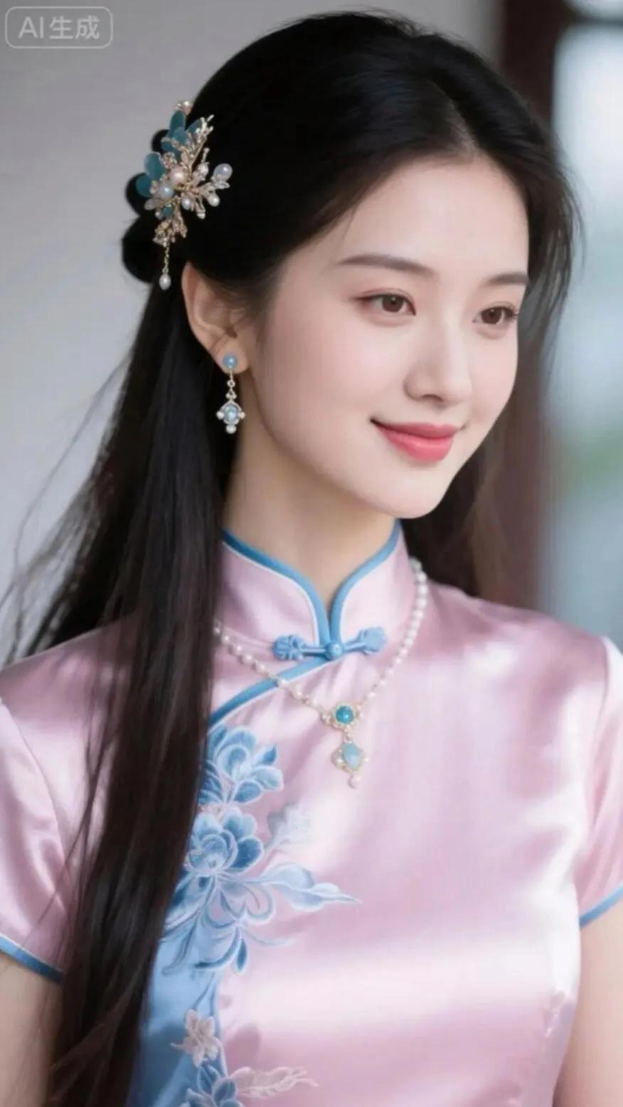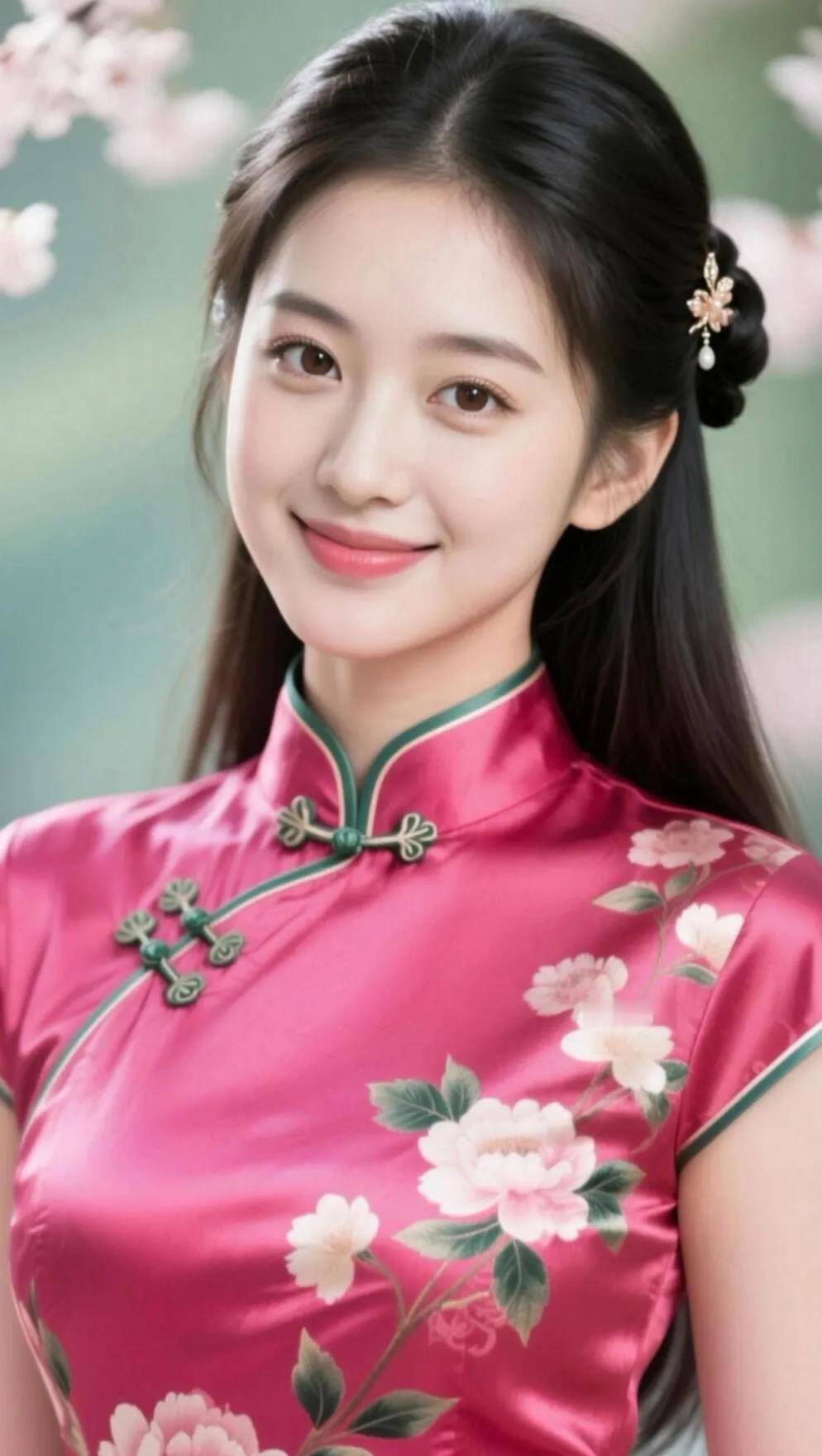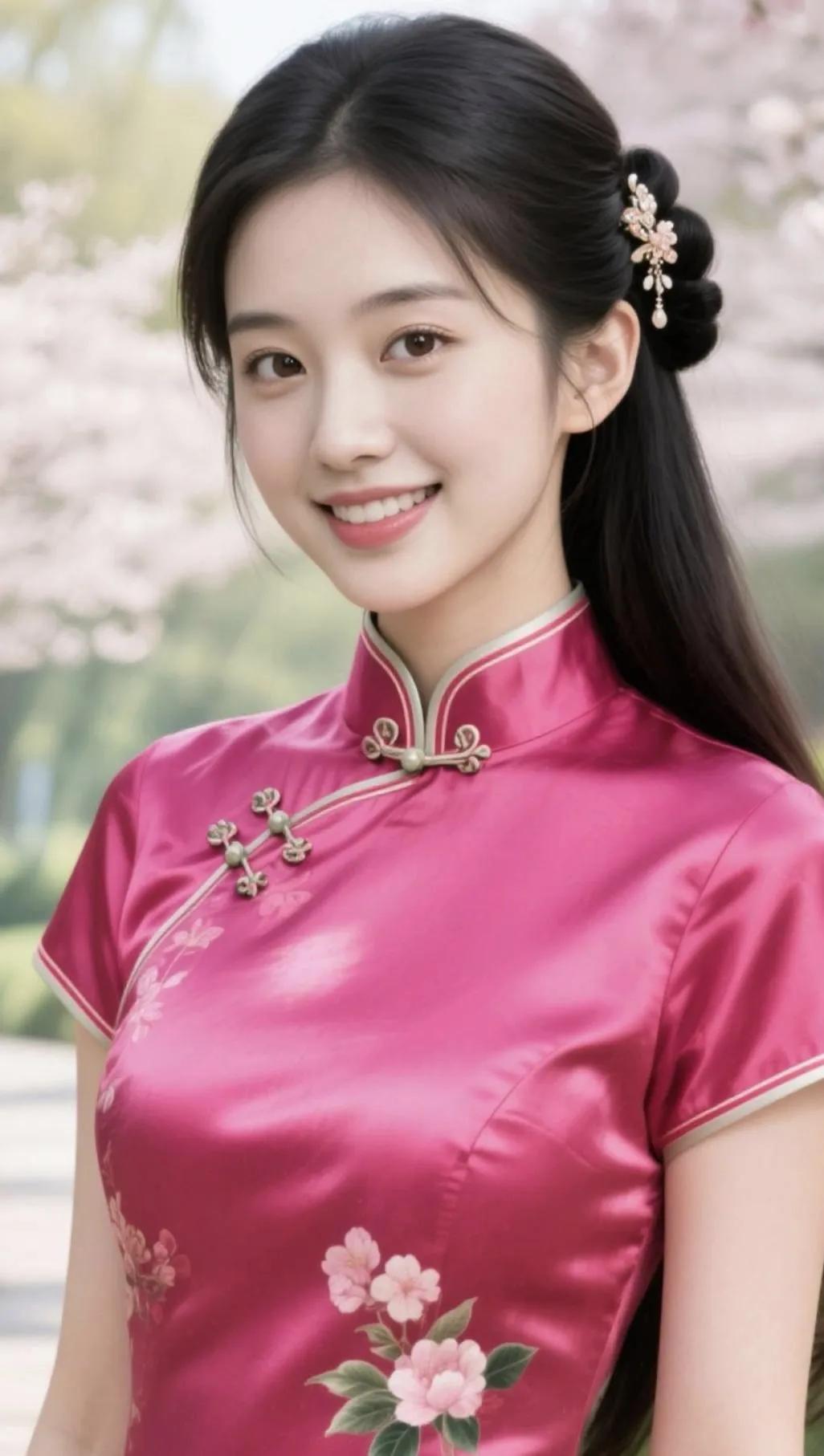 优雅旗袍少女,笑靥如花,粉嫩樱花映衬,尽显东方韵味。