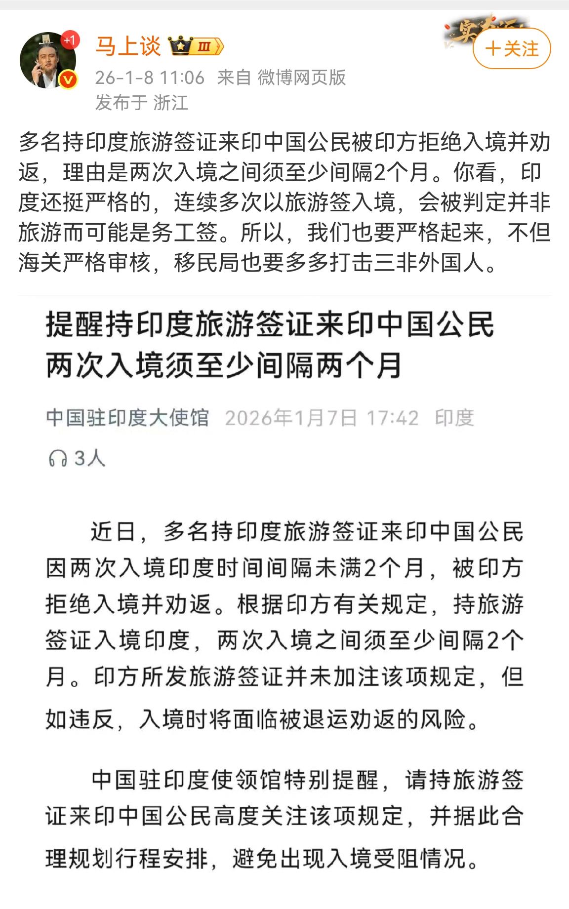 中印在对待双方入境人员工作方面,感觉中国很随意,而印度反而是那个认真严格的一方。 这就有点出乎大家的刻板印象了。 在我们极尽全力“讨好”印度人大量进入我国时,印度方面却对我国入境人员展现少见的傲慢姿态。 多名我国公民被印度当局拒绝入境并劝返,理由是两次入境至少相隔两个月。 看看印度对我国人员入境规定的多么细致,执行多么自信与坚决。作为一面镜子,再看看我们的相关人员有没有做到这样的认真。 个人认为我们的对外工作并不是单纯为了让外国人给我们好评,而是一切都要围绕我们自己国家利益至上而服务。 再说了,印度是一个种姓观念很严重的国家,过于的谦卑在他们的眼中可能会被理解成另外一个意思。 所以和印度打交道,我们既要拿出大国的自信,又要有完善且细致严格的规定才行。 中印对比 中印互动
