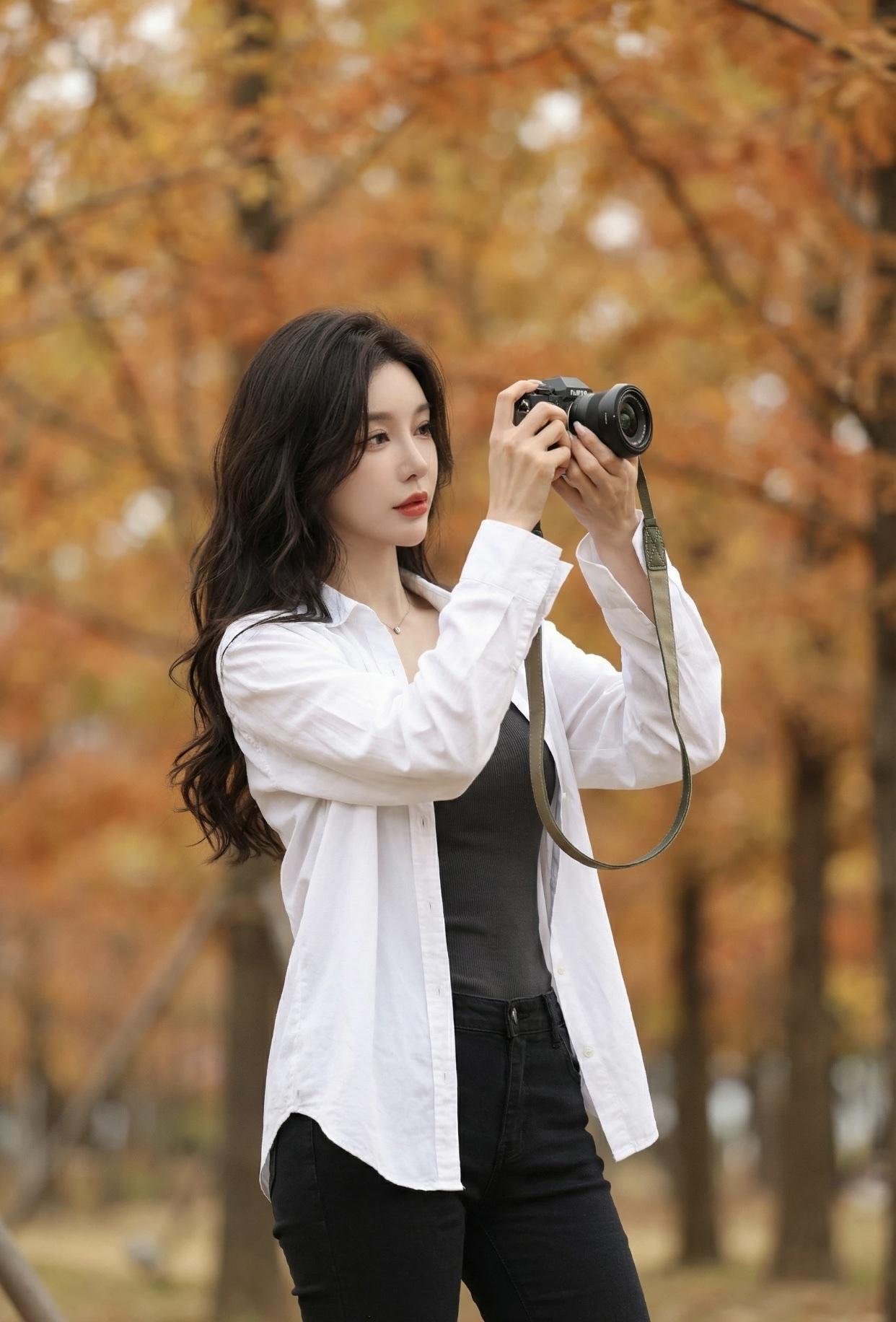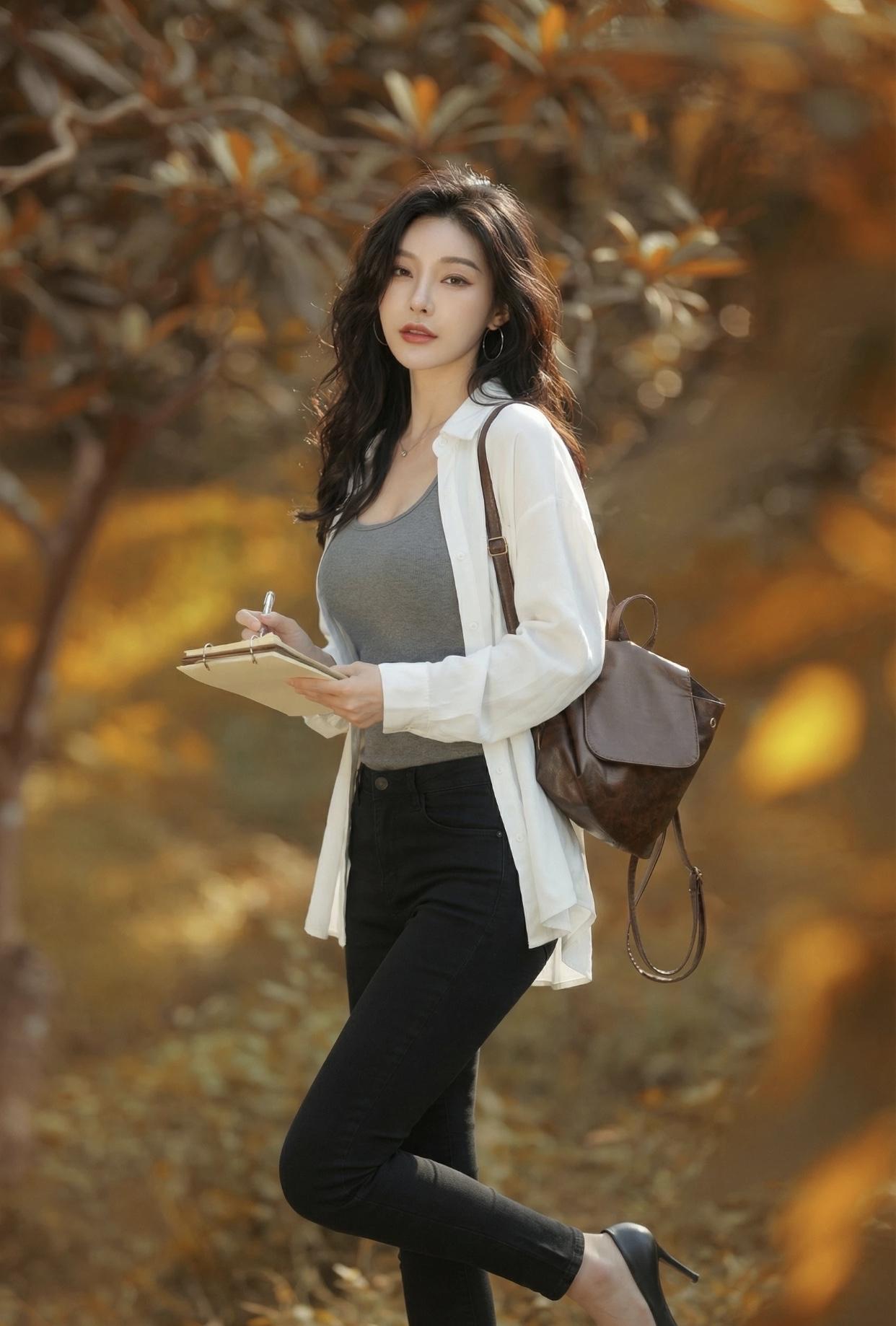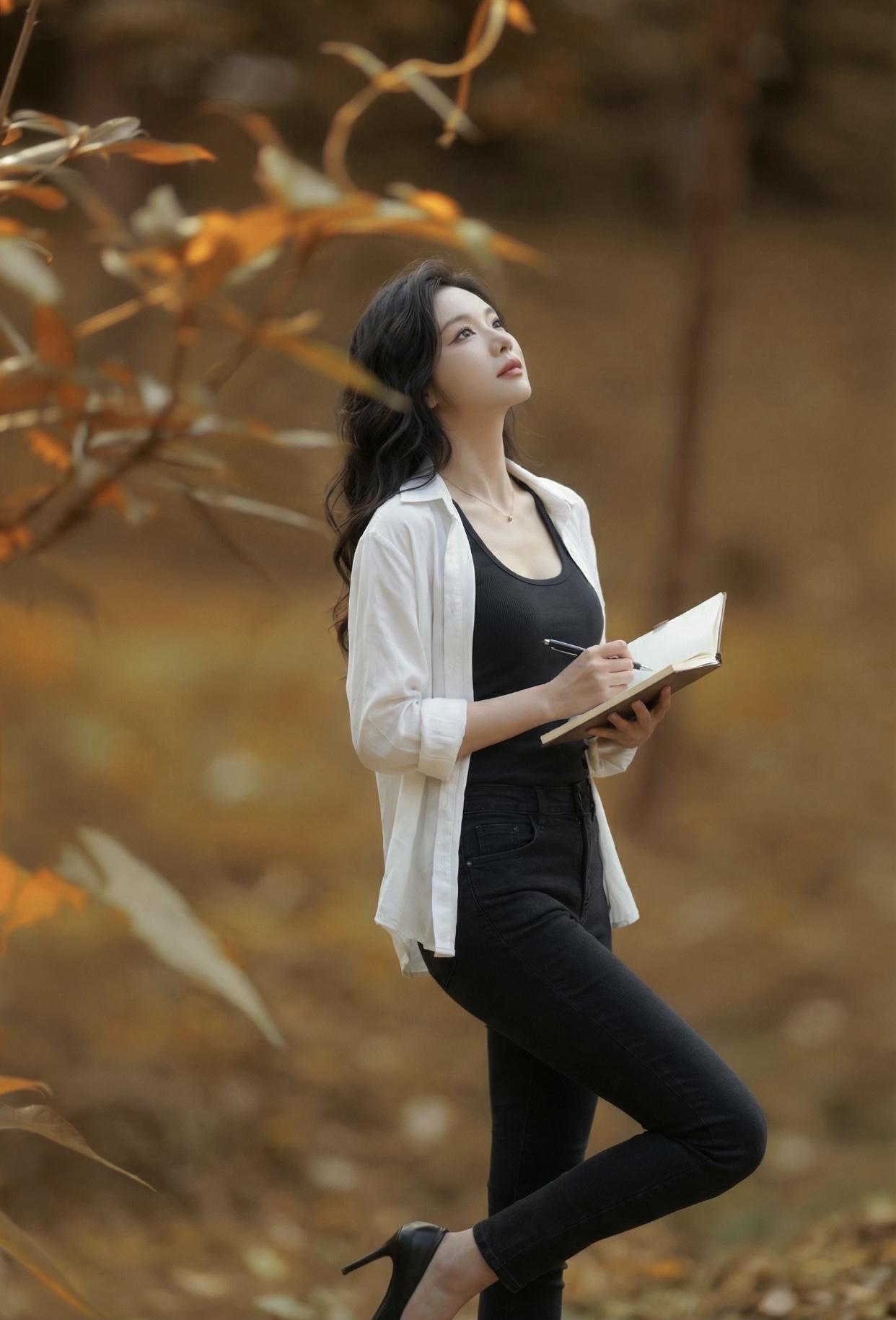 美到骨子里的女人,是什么样子的秋日暖阳下,优雅女子手执笔记本,漫步在落叶纷飞的小径上。