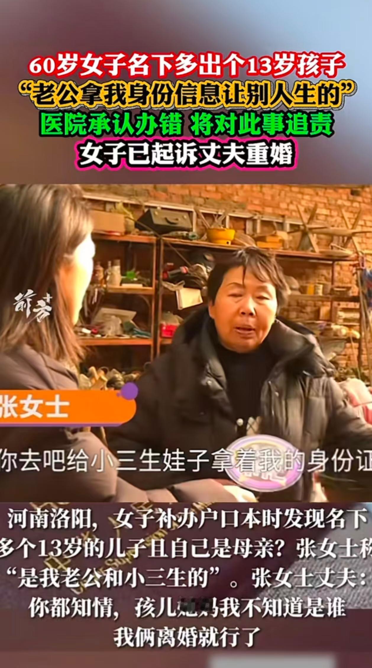 网友齐呼,这丈夫真是胆大包天! 私生子都上初中了,60岁的原配才发现,更气人的是丈夫瞒着原配,把孩子户口上在张女士名下,孩子现在跟着丈夫上学。 原来原配是补办户口本的时候才发现这件事,原配当即去找医院,这一查才知道,当年丈夫用张女士的名义办的孩子信息,所以孩子的户口就上在原配名下。 原配对着镜头愤怒的说天下没人能干出这样的事! 这个丈夫真是狡猾,看新闻是户口本丢了,原配去补办,说不定这个户口本就是丈夫给悄悄藏起来的,不然早就被发现了。 现在孩子一直跟着丈夫上学,丈夫也不愿意透露小s是谁。估计是怕原配找小s退还婚内夫妻共同财产。 妻子气不过要去告丈夫重婚罪,但是丈夫只希望能离婚就行。 网友说还好发现了,不然如果丈夫突然有一天走了,要办理遗产分配,还要私生子到场办理继承,到时原配哭都没地方。